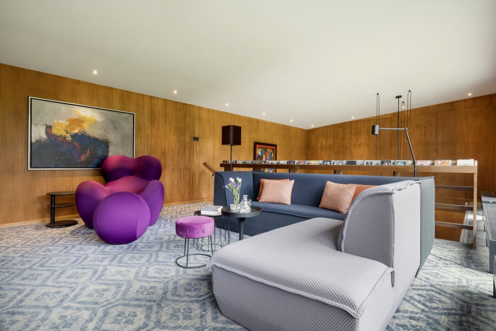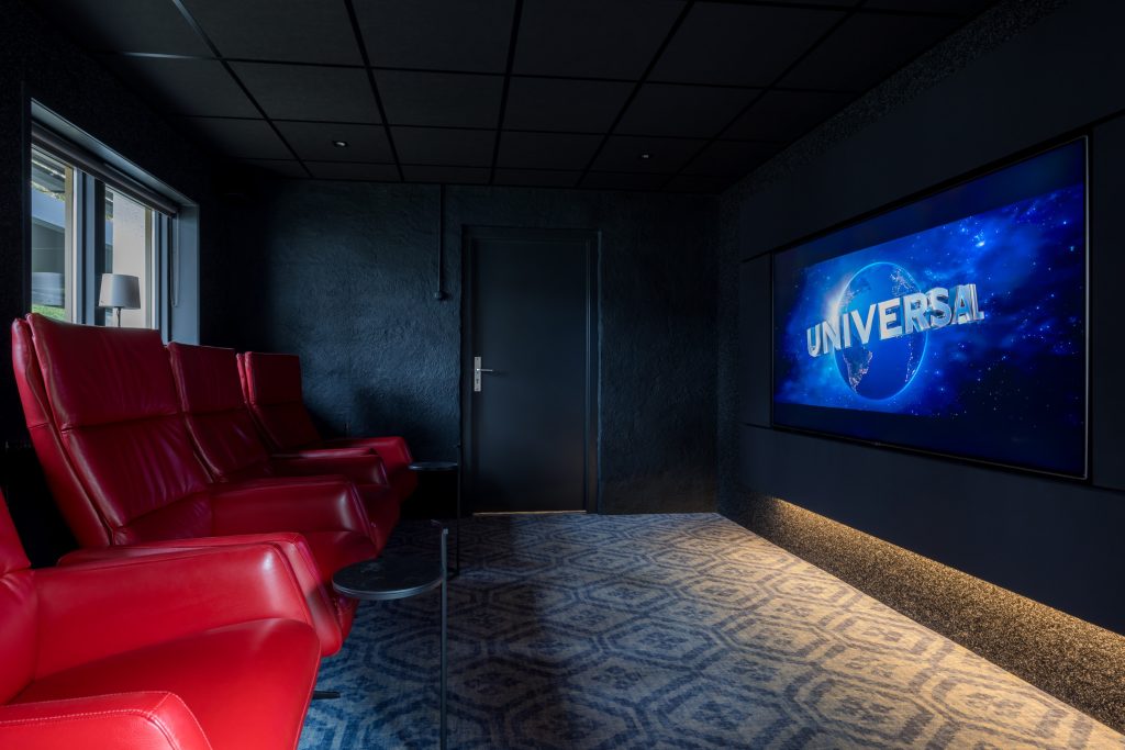 We gaan terug naar de eetkamer op de begane grond. In de oostelijke vleugel, die grenst aan de eetkamer, is de ‘schaakkamer’ die leidt naar de thuisbioscoop met een fraai interieur. Aansluitend zijn een royale werkkamer met een halfronde schouw en houtkachel en een van binnenuit bereikbare berging.