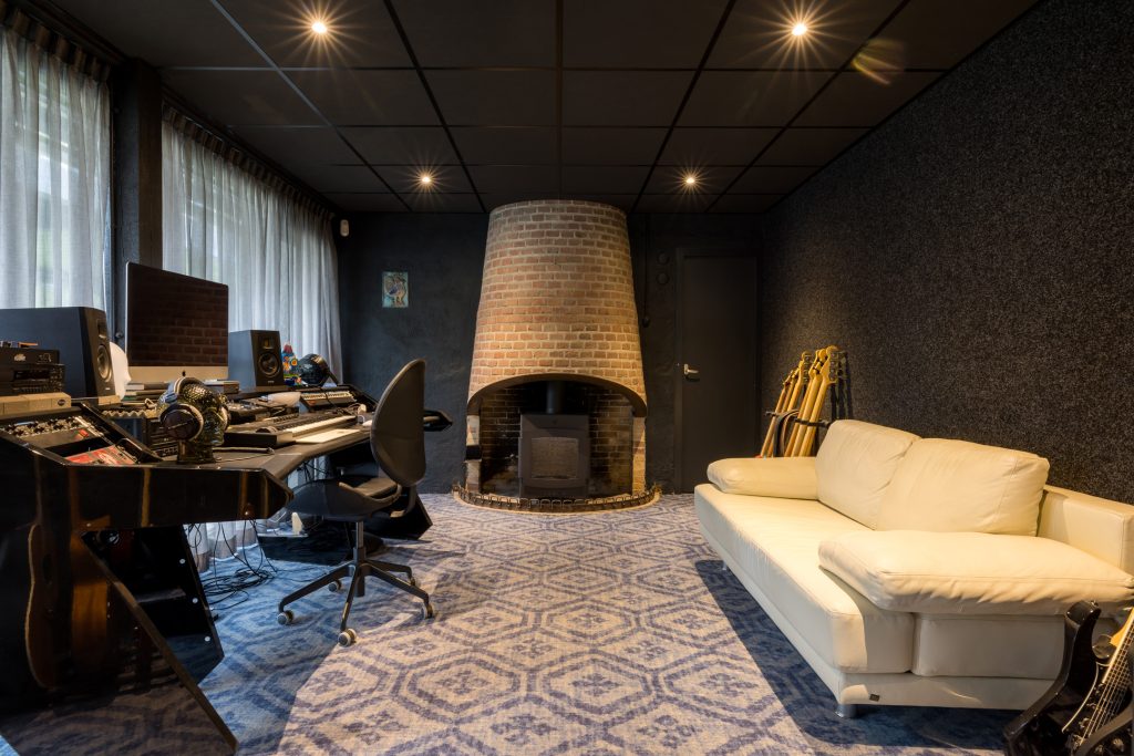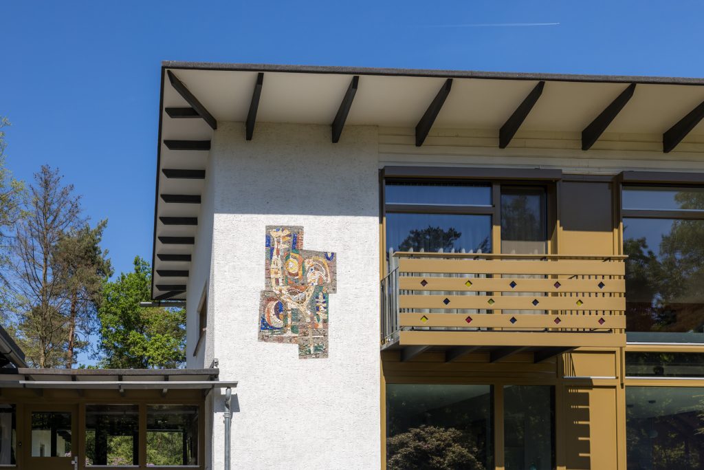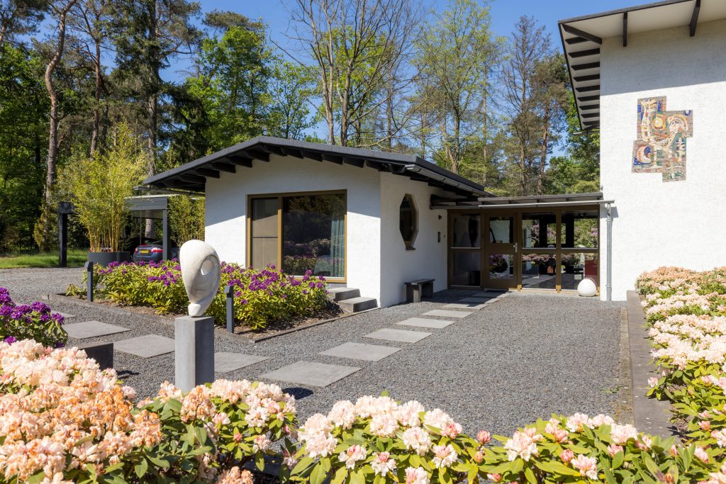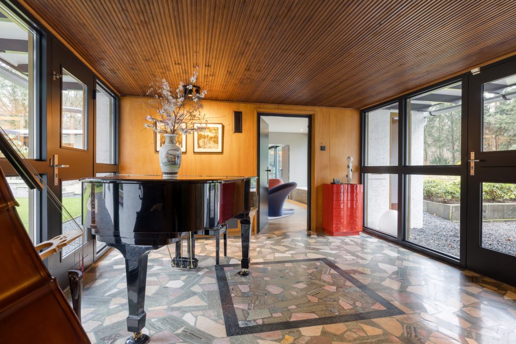 Vanaf het moment dat u het perceel op rijdt, wordt u gegrepen door de villa en de omliggende tuin met vele hoge bomen. Parkeer de auto onder de carport en loop naar de entree, schuin onder het mozaïek van de haan. De ontvangsthal is een prachtige ruimte met lichtinval aan twee zijden, die nu als muziekruimte in gebruik is.