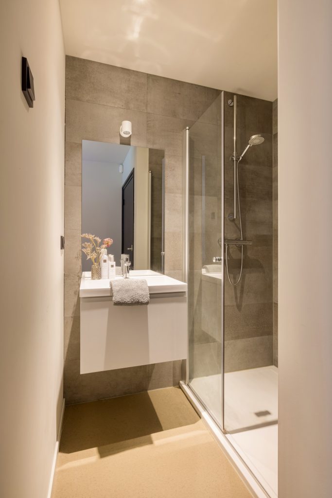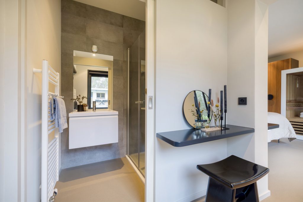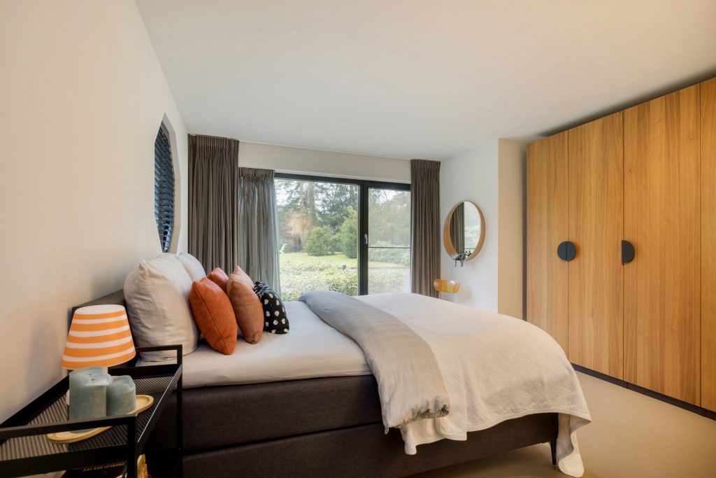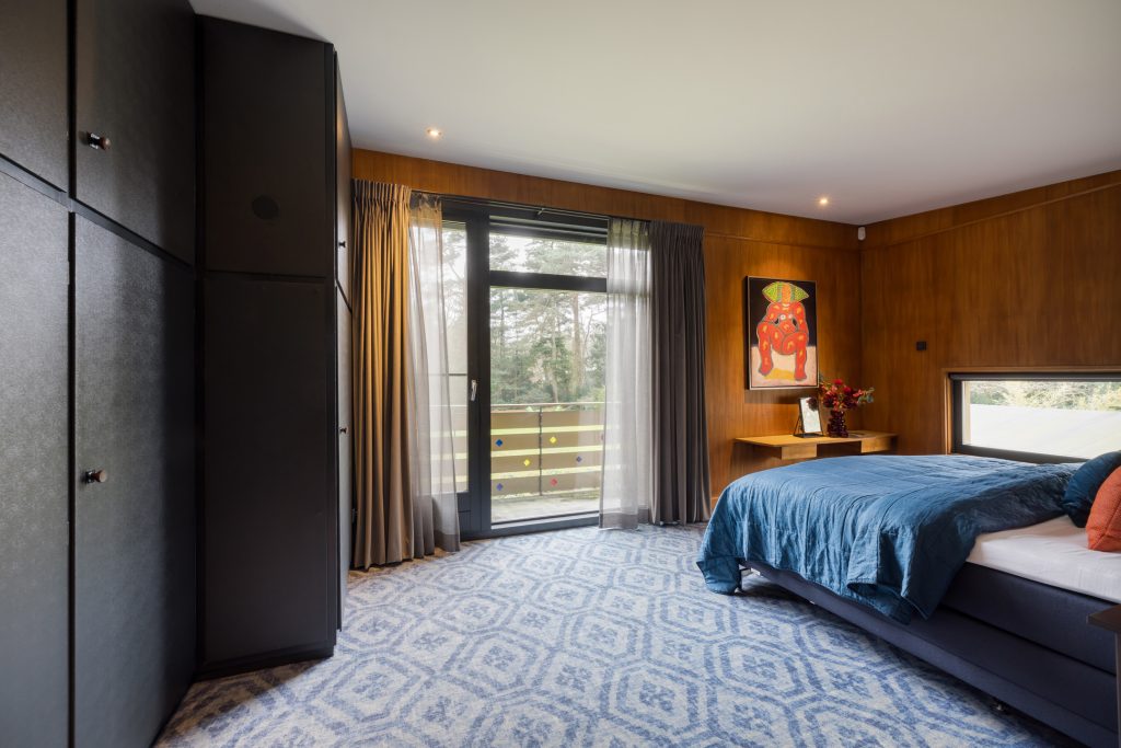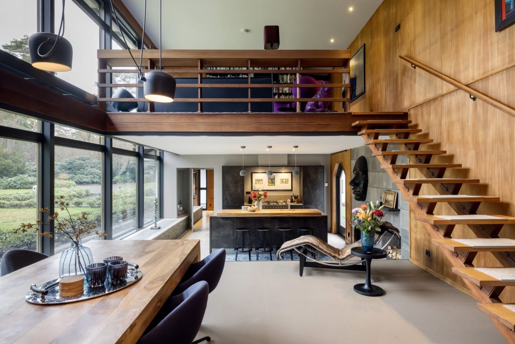 De trap leidt naar een tweede zitkamer, met een speels schuin dak en panoramisch uitzicht naar de tuin. Naast de maatwerk kastenwand is een deur naar de master bedroom, met een balkon en een in neutrale kleuren uitgevoerde badkamer.