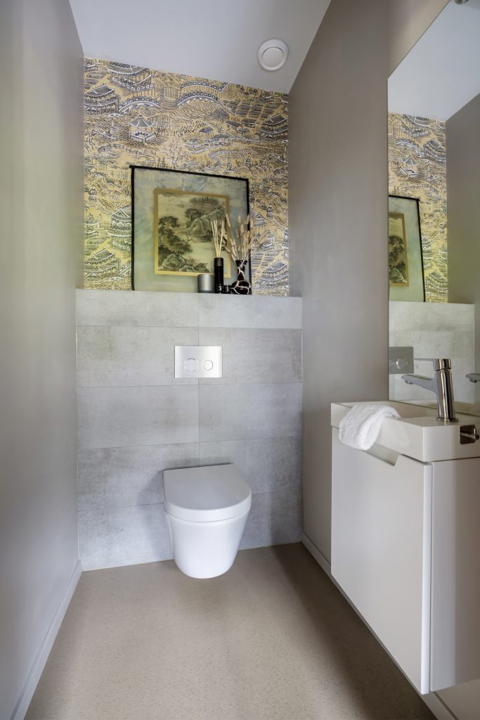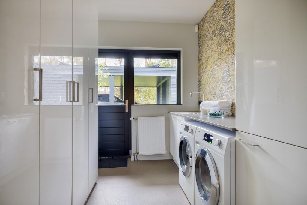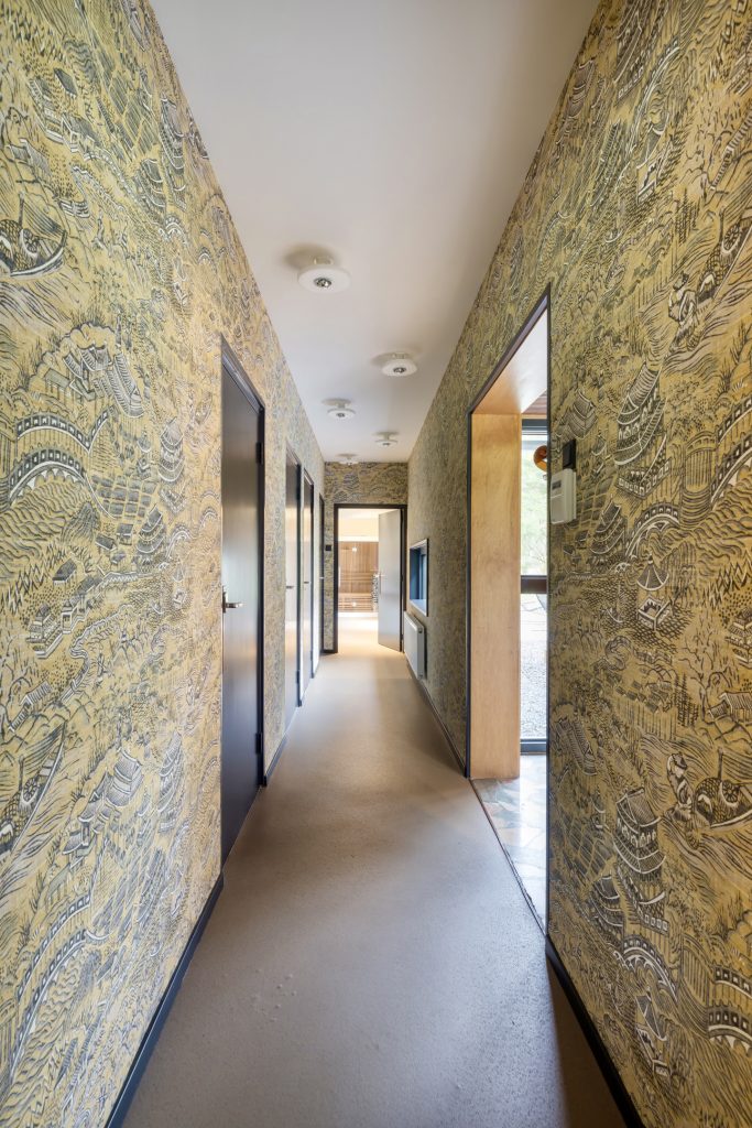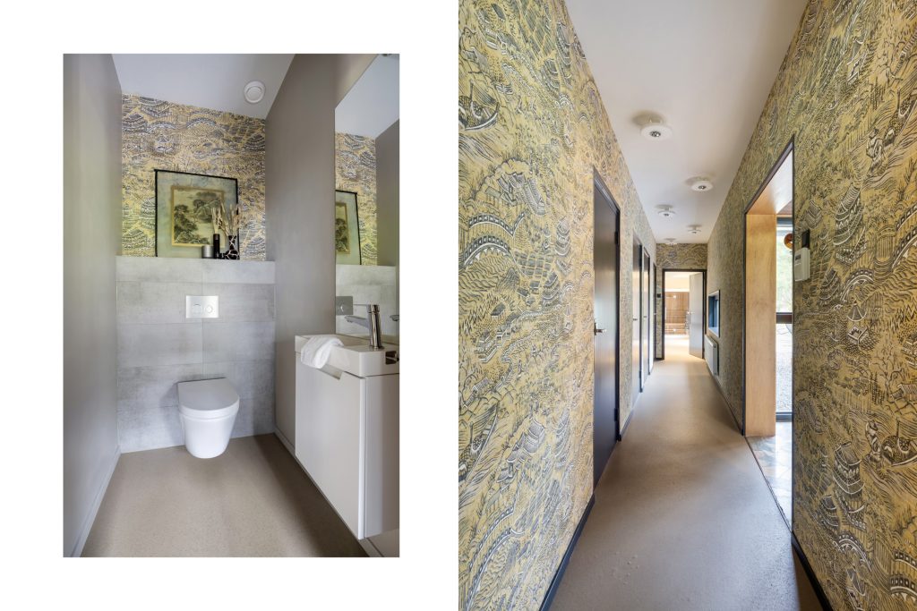 Aan de westelijke zijde van de entree is de tweede vleugel met twee ruime slaapkamers, een kinderkamer, toiletruimte, twee badkamers, een bijkeuken/wasruimte en een berging met toegang tot de wijn-/provisiekelder. Fraaie elementen zijn de taupe kleurige linoleumvloer, het patroonbehang in de lange hal en de royale sauna in de achterste slaapkamer.