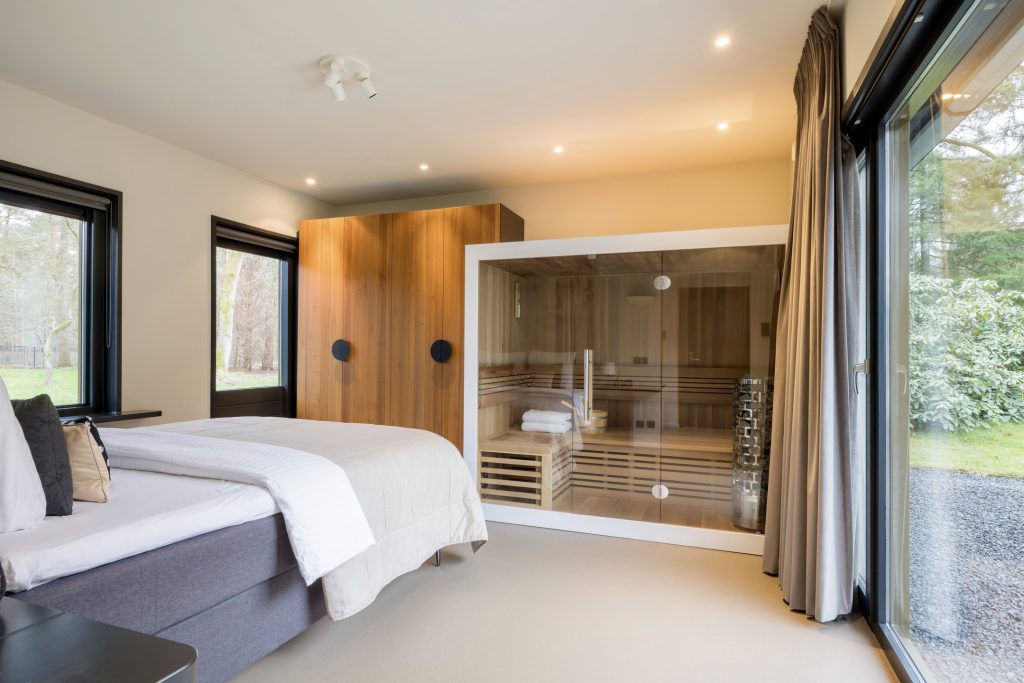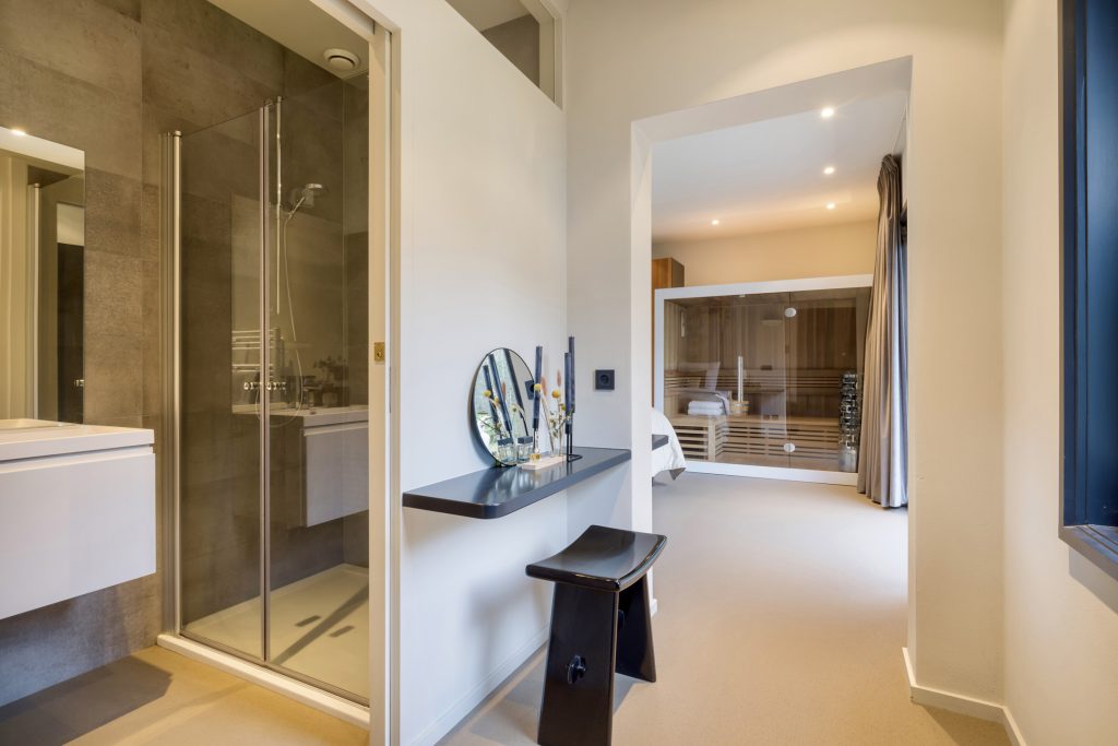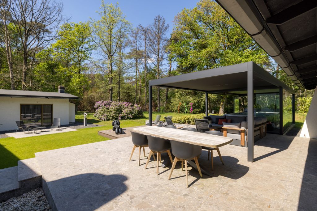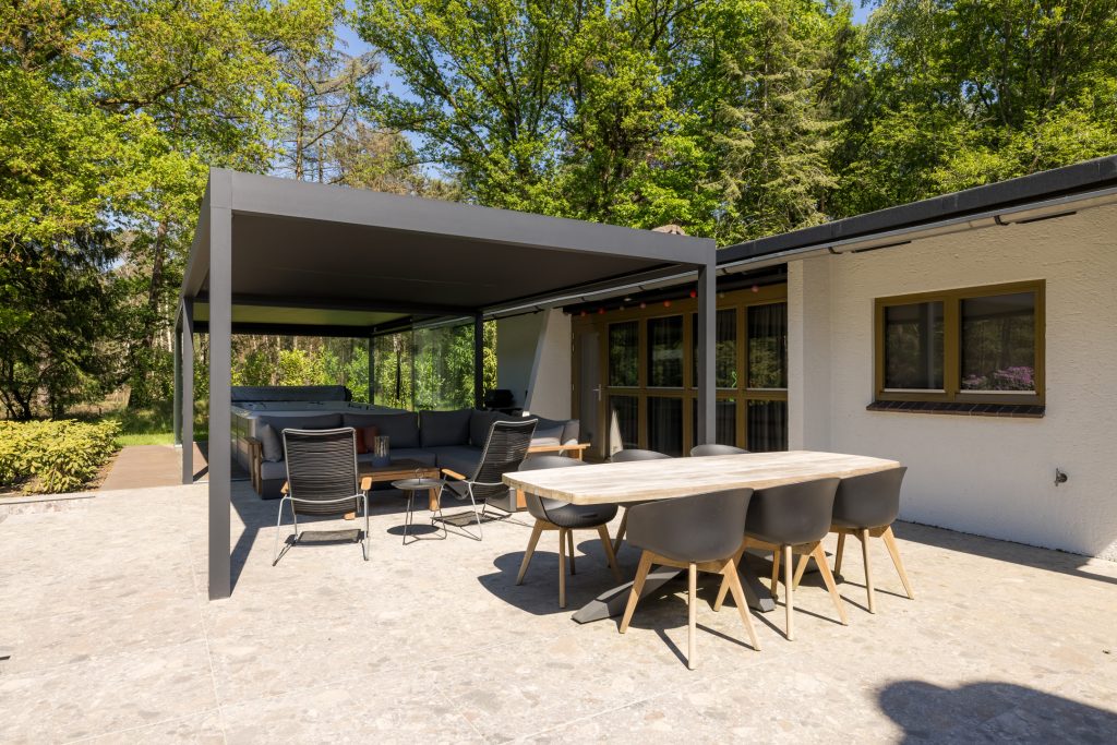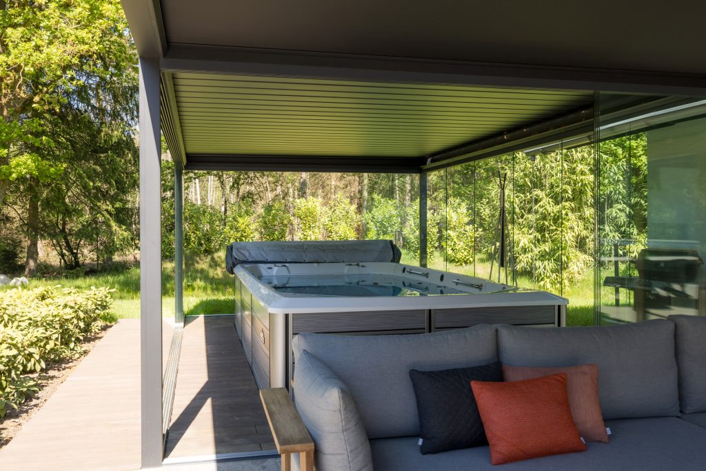 – Overdekt terras en zwemspa met zonnedak en glazen schuifwanden;