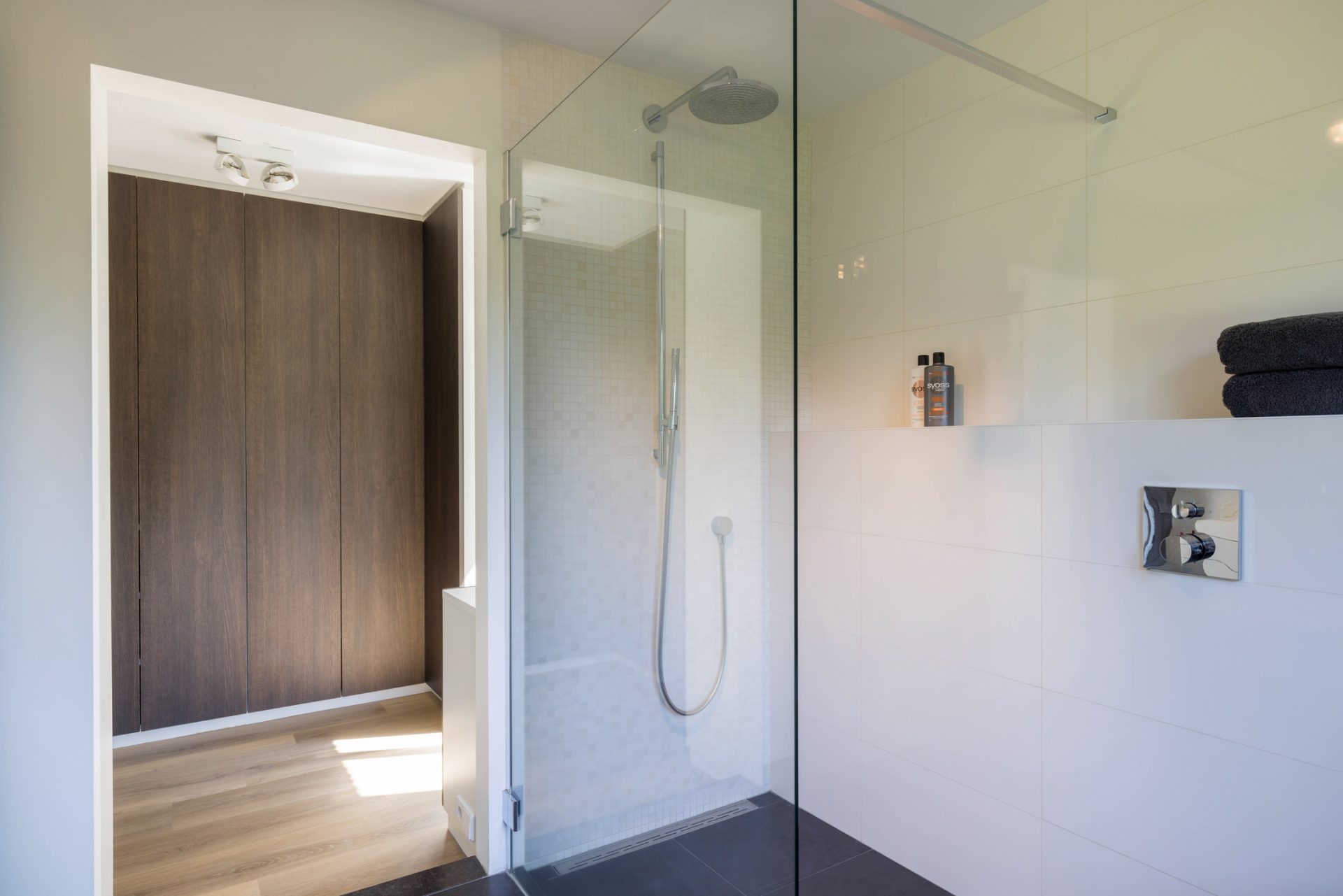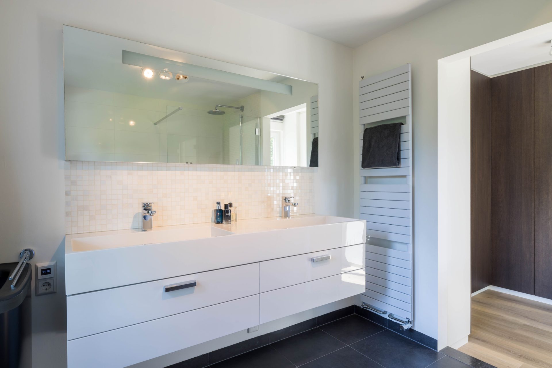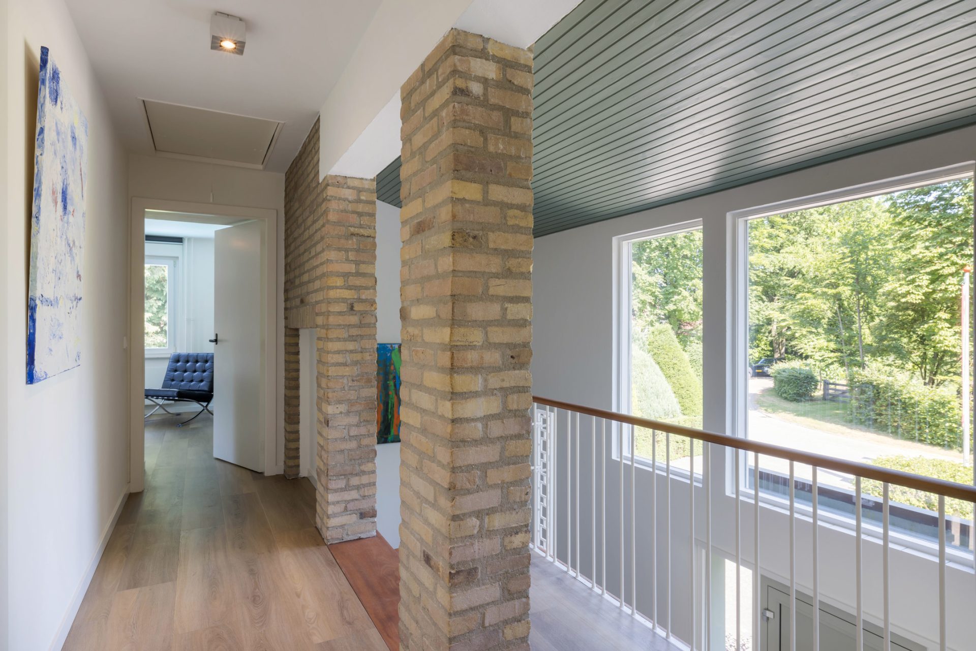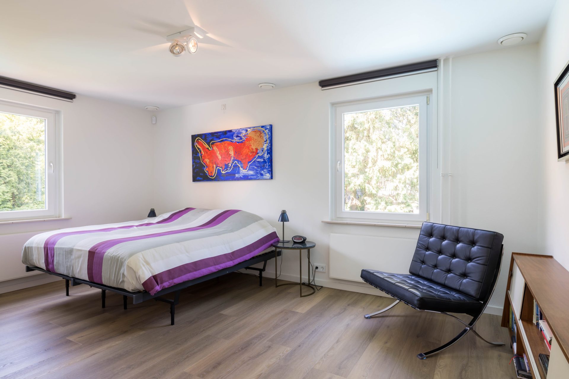 De eerste verdieping is te bereiken via de statige bordestrap in de hal en biedt drie grote slaapkamers, een toiletruimte en twee badkamers. De hoofdslaapkamer heeft een eigen garderobekamer en een moderne badkamer met inloopdouche, wandcloset en wastafelmeubel met twee wastafels. De andere twee ruime slaapkamers delen een tweede badkamer eveneens met inloopdouche, wastafelmeubel en een apart toilet. Een praktische bergzolder is bereikbaar via een vlizotrap op de overloop.
