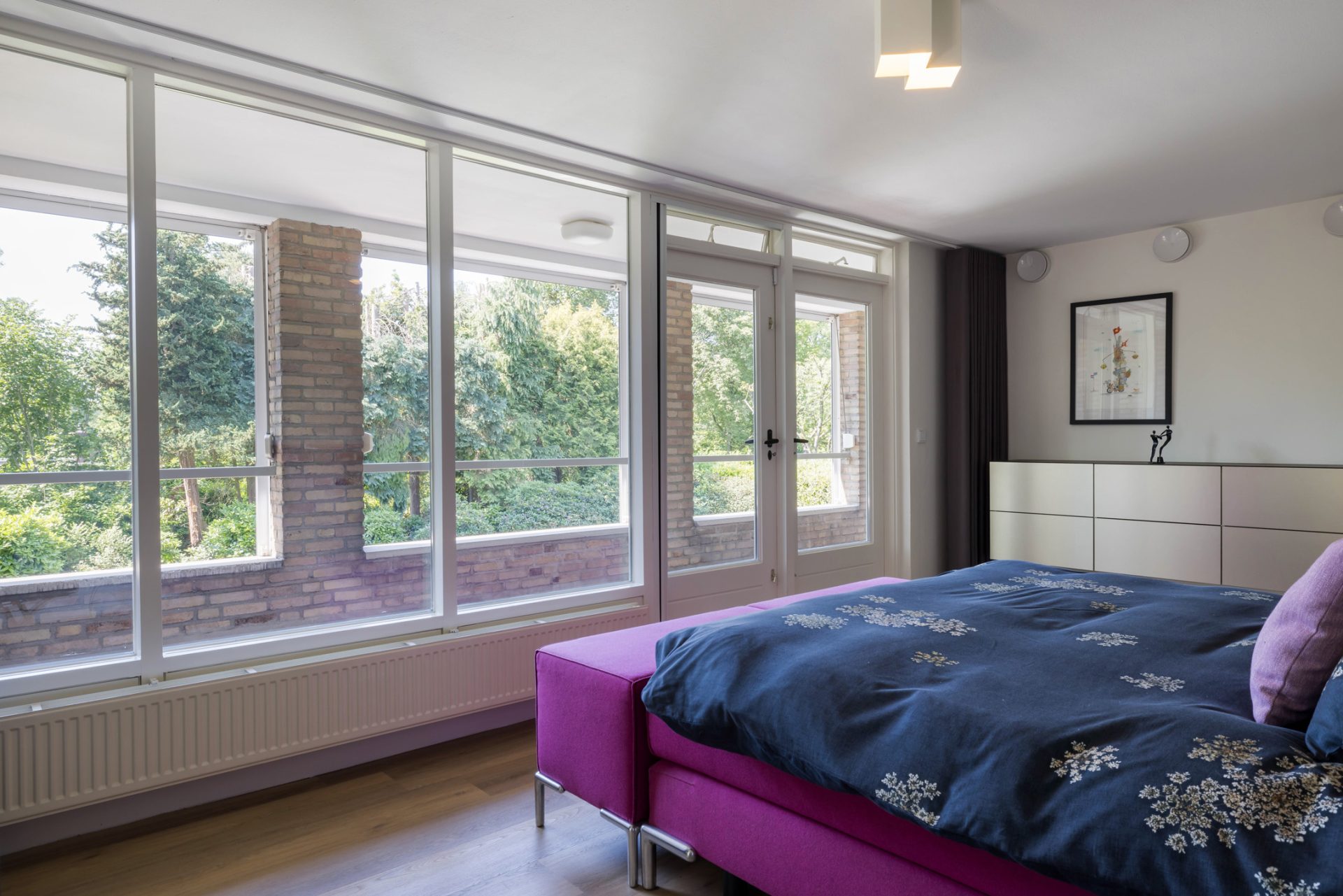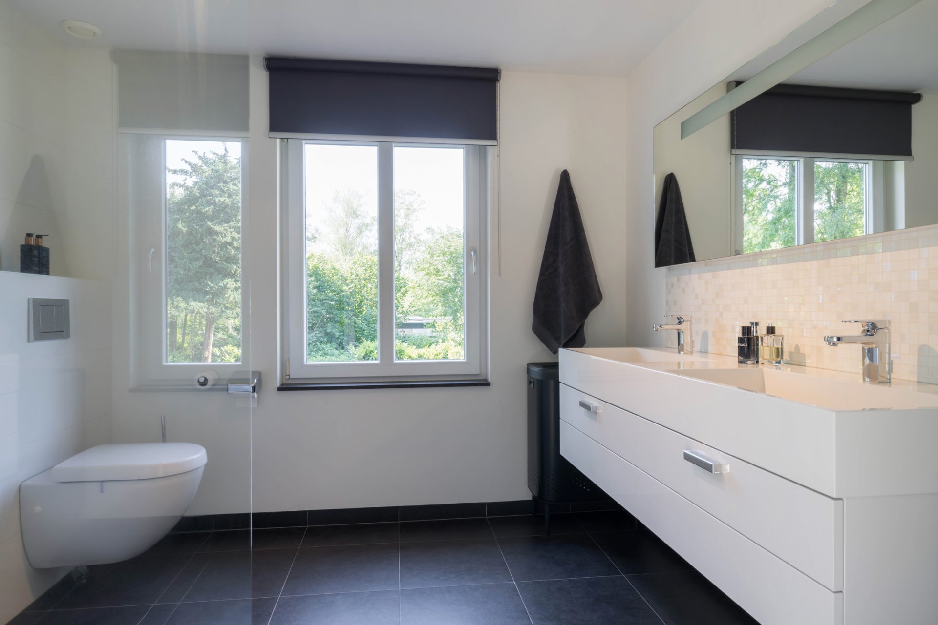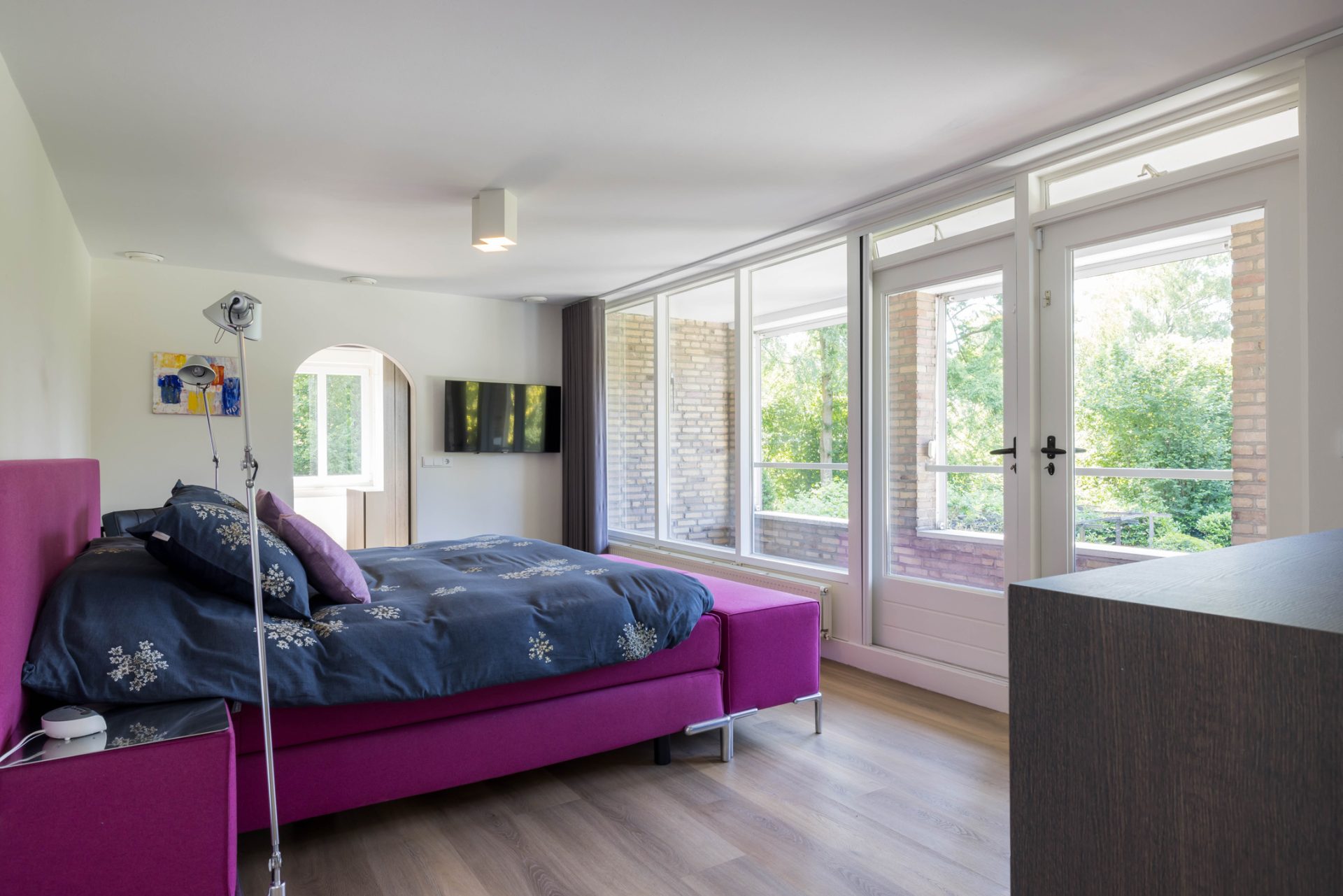 De eerste verdieping is te bereiken via de statige bordestrap in de hal en biedt drie grote slaapkamers, een toiletruimte en twee badkamers. De hoofdslaapkamer heeft een eigen garderobekamer en een moderne badkamer met inloopdouche, wandcloset en wastafelmeubel met twee wastafels. De andere twee ruime slaapkamers delen een tweede badkamer eveneens met inloopdouche, wastafelmeubel en een apart toilet. Een praktische bergzolder is bereikbaar via een vlizotrap op de overloop.