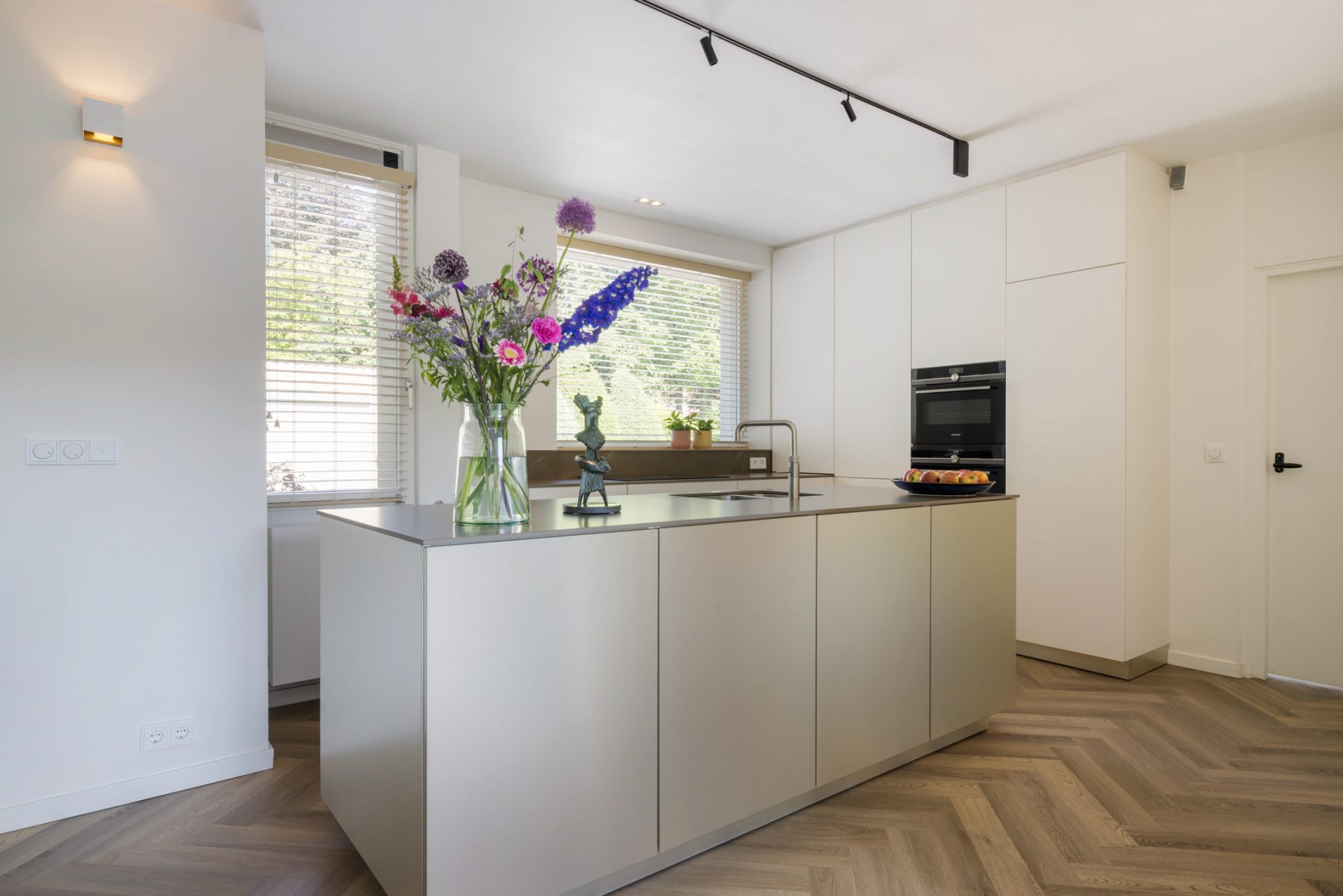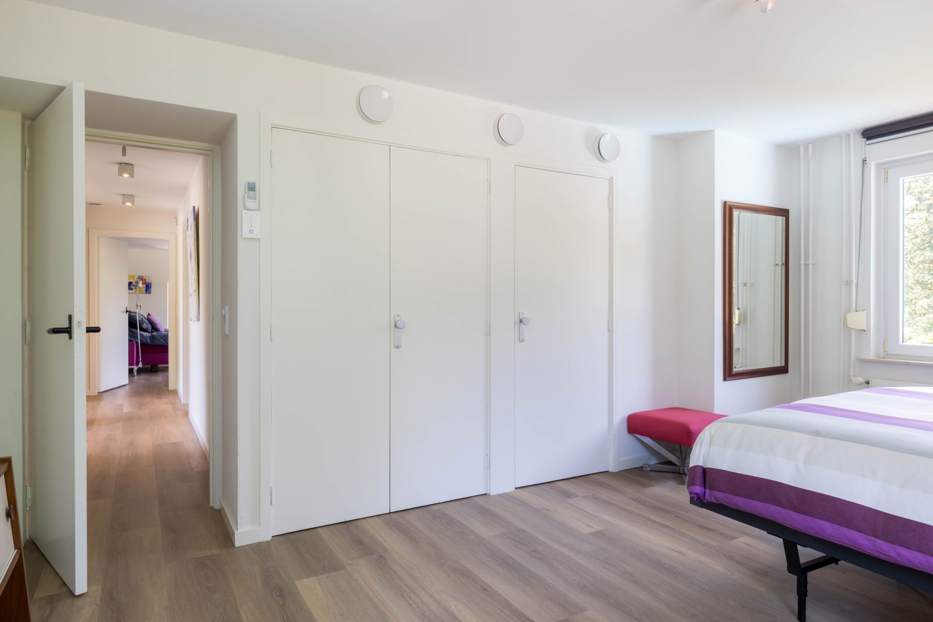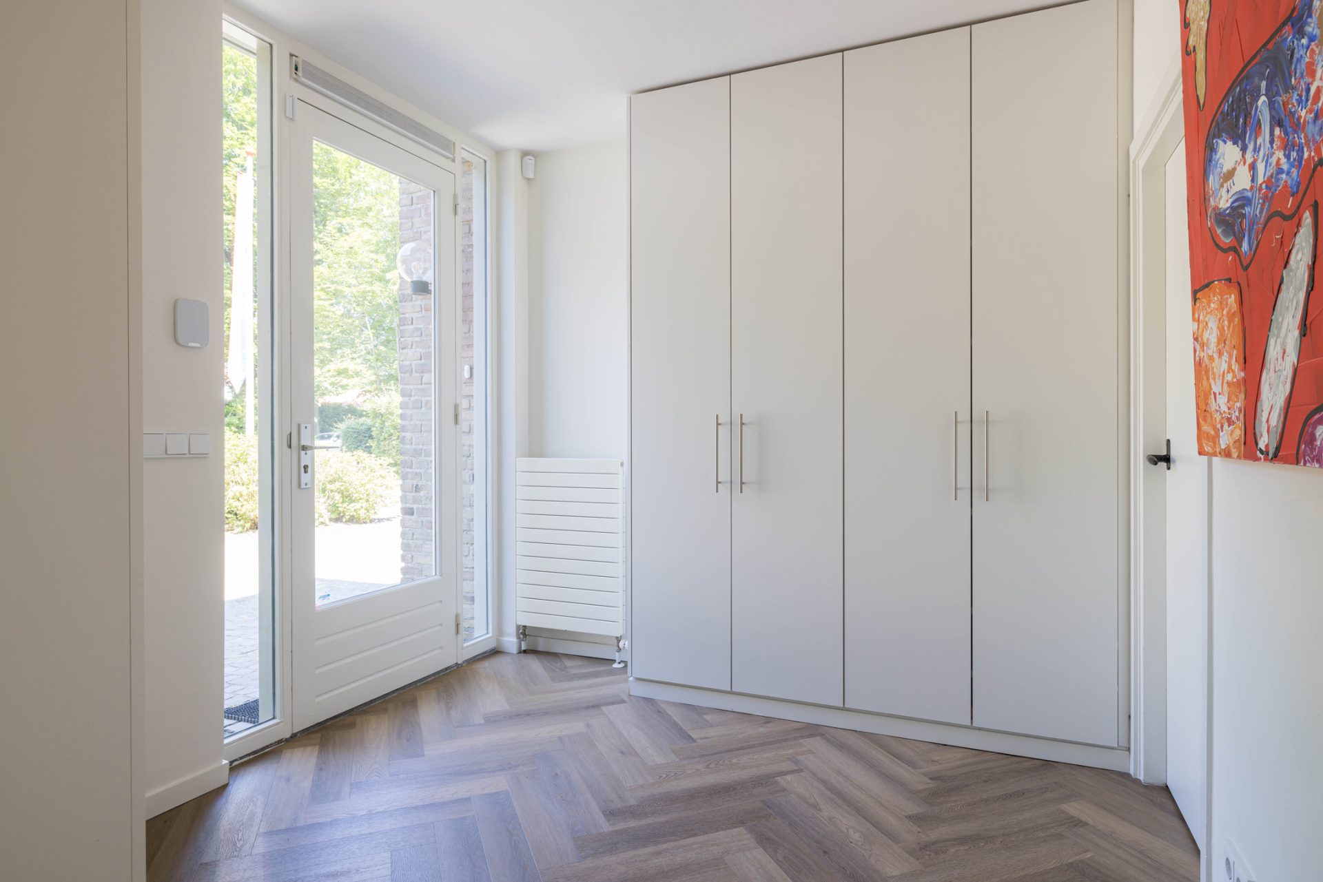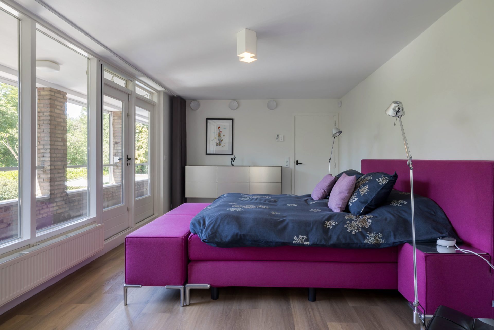 De eerste verdieping is te bereiken via de statige bordestrap in de hal en biedt drie grote slaapkamers, een toiletruimte en twee badkamers. De hoofdslaapkamer heeft een eigen garderobekamer en een moderne badkamer met inloopdouche, wandcloset en wastafelmeubel met twee wastafels. De andere twee ruime slaapkamers delen een tweede badkamer eveneens met inloopdouche, wastafelmeubel en een apart toilet. Een praktische bergzolder is bereikbaar via een vlizotrap op de overloop.
