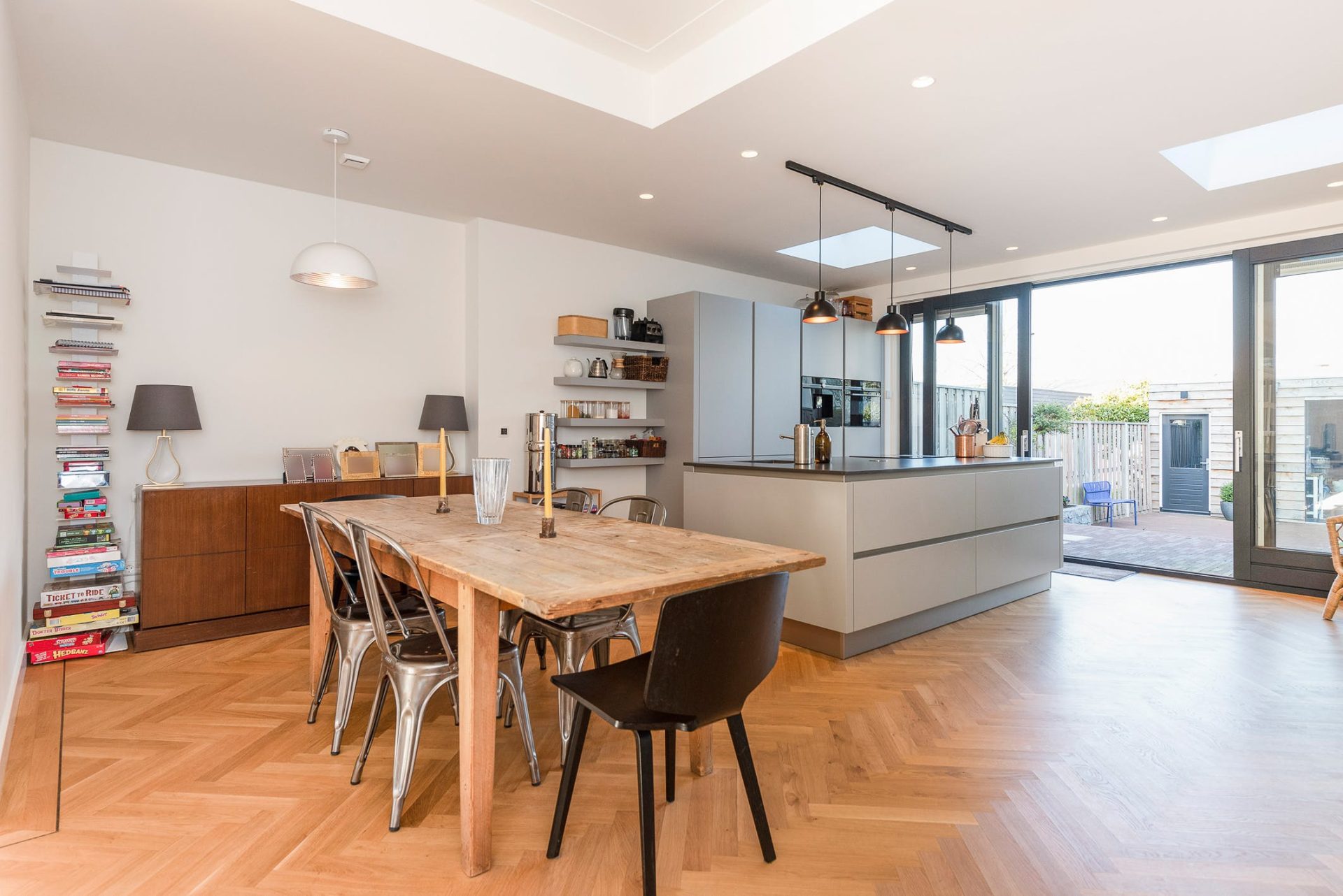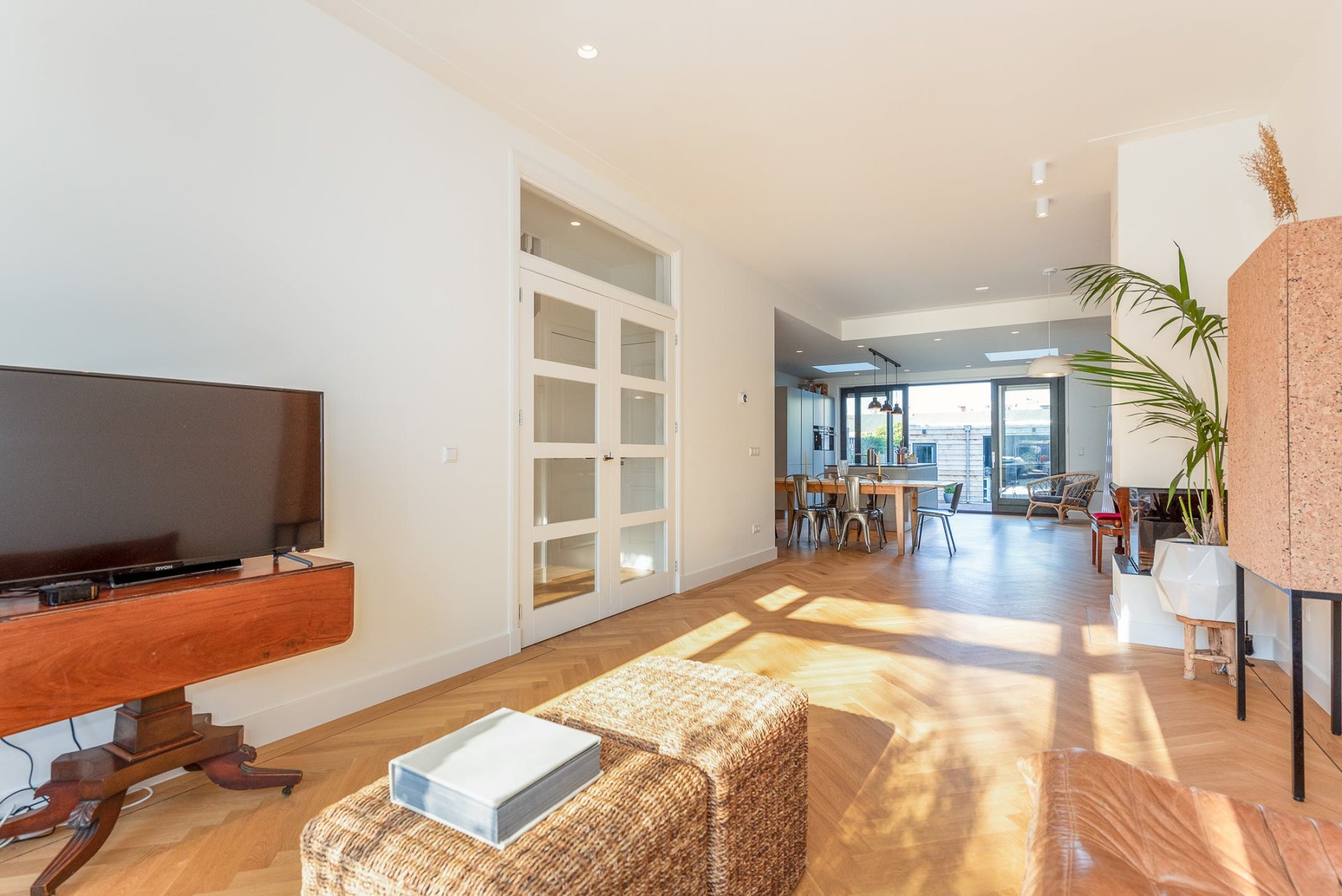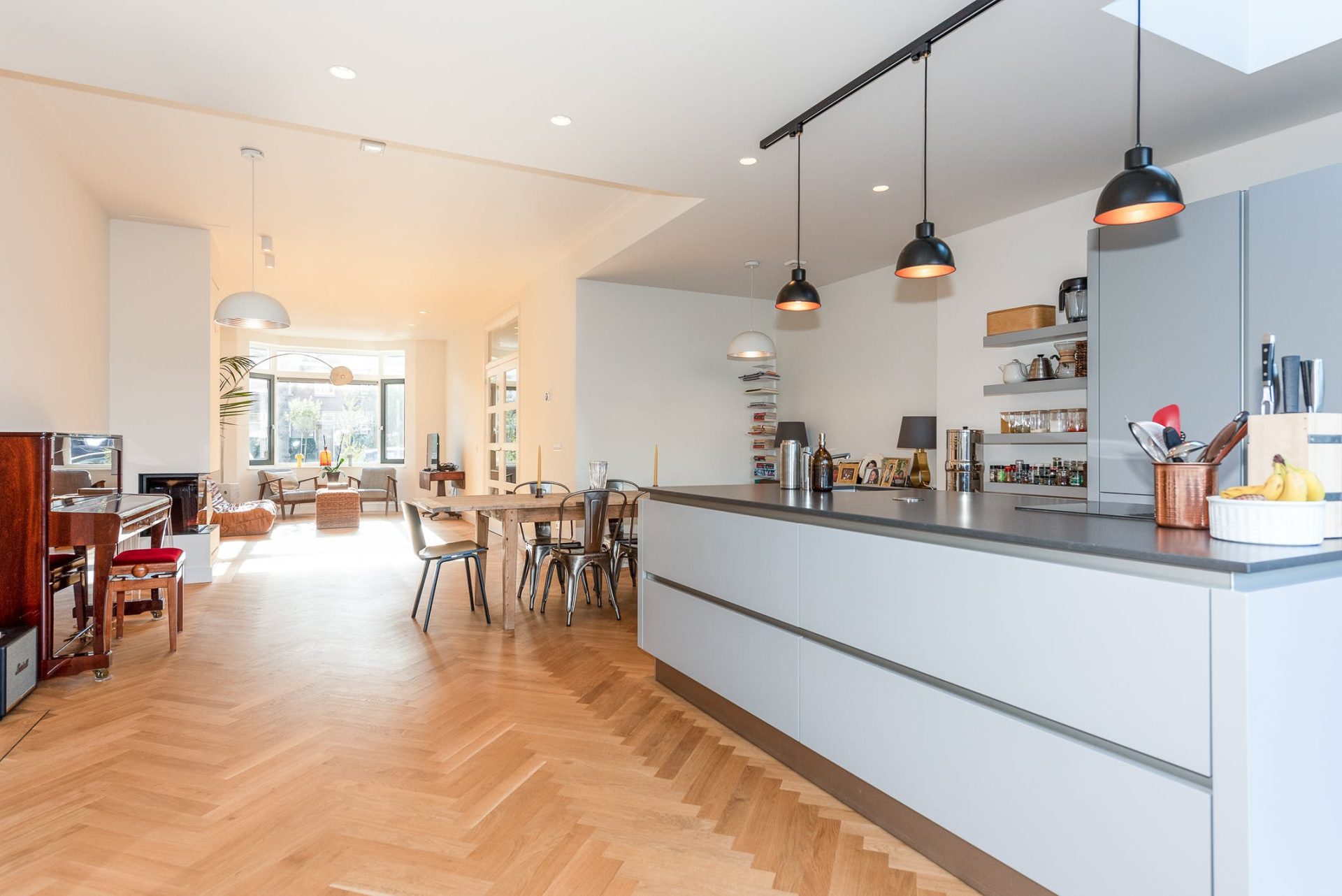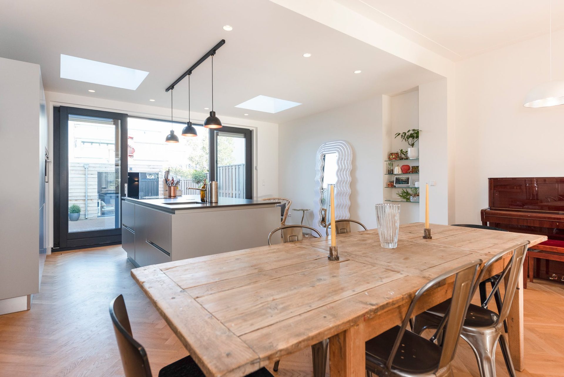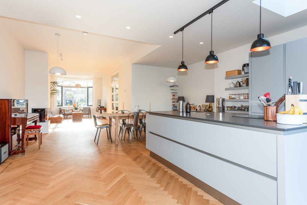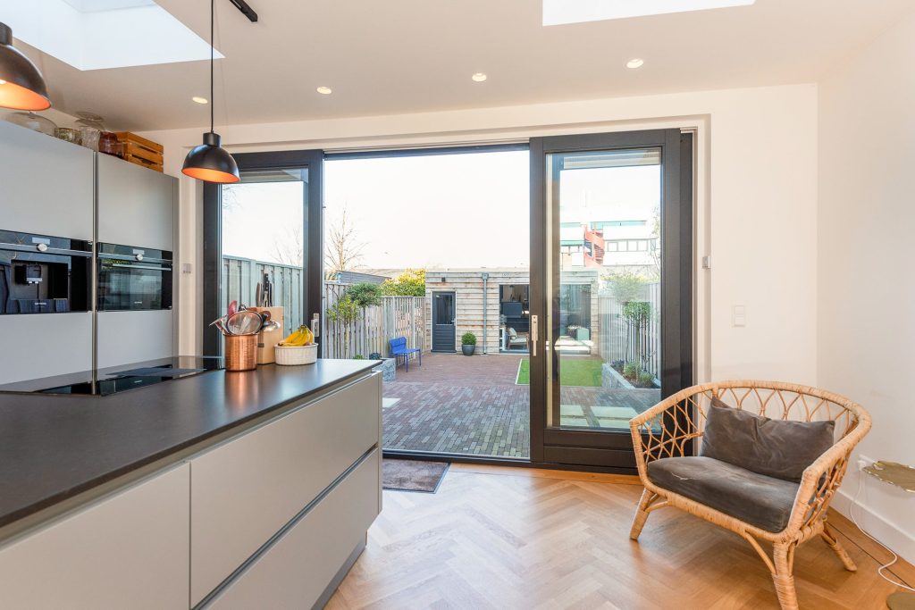 Entree woning, ruime hal met garderobe, vaste kast onder de trap en modern toilet met hangend closet en fontein. Middels openslaande deuren heeft u toegang tot de royale tuin gerichte woon- eetkamer voorzien van veel daglicht toetreding door de aan beide zijde aanwezige grote raampartijen, luxueuze open keuken aan de achterzijde van de woning voorzien van gepolijste composiet werkblad met alle benodigde inbouwapparatuur.