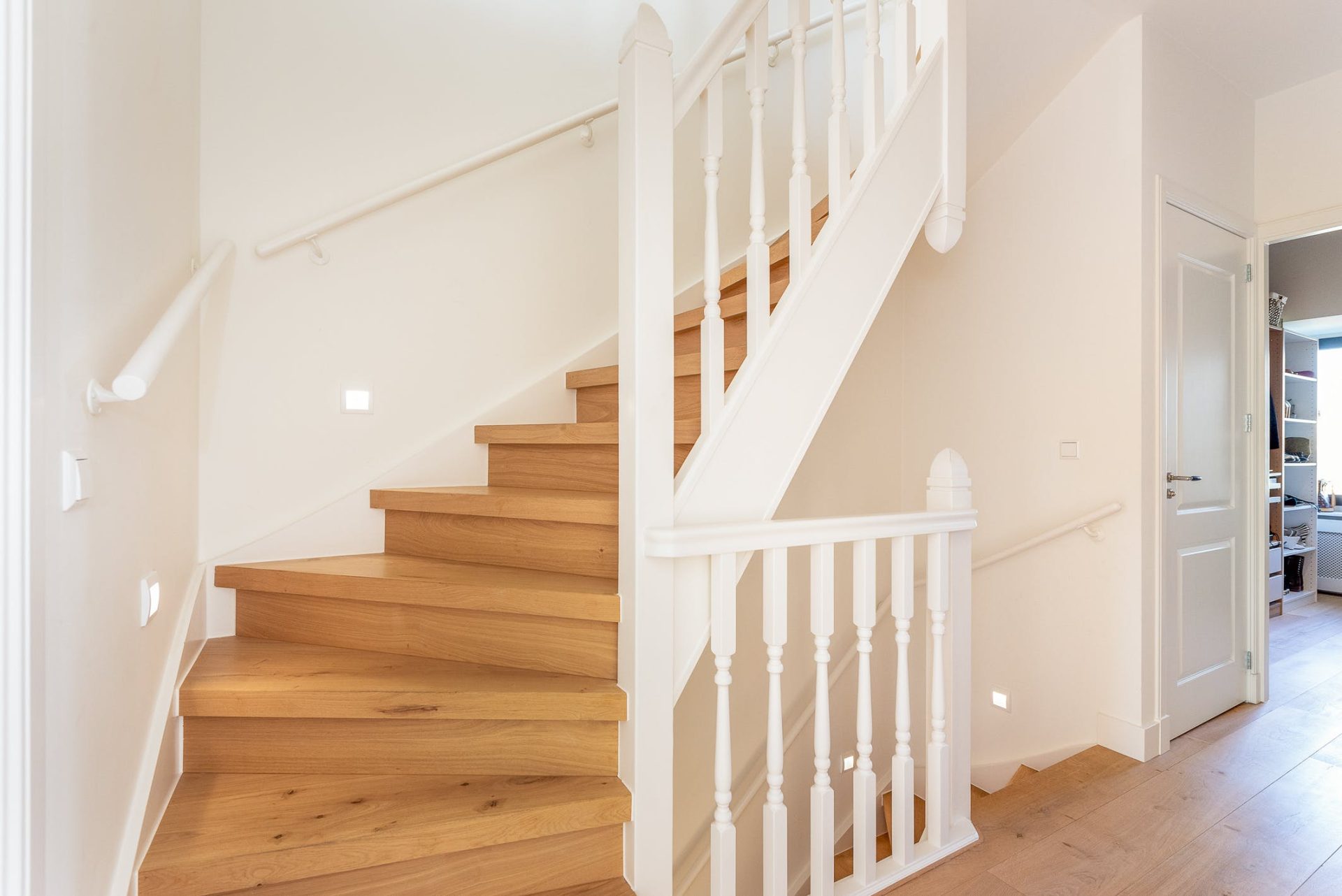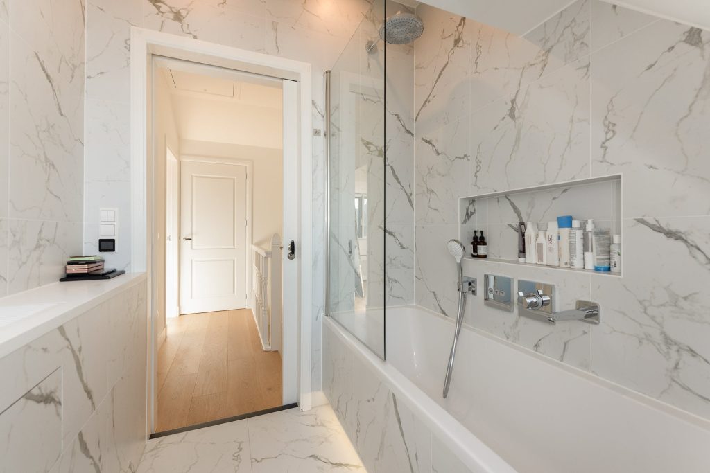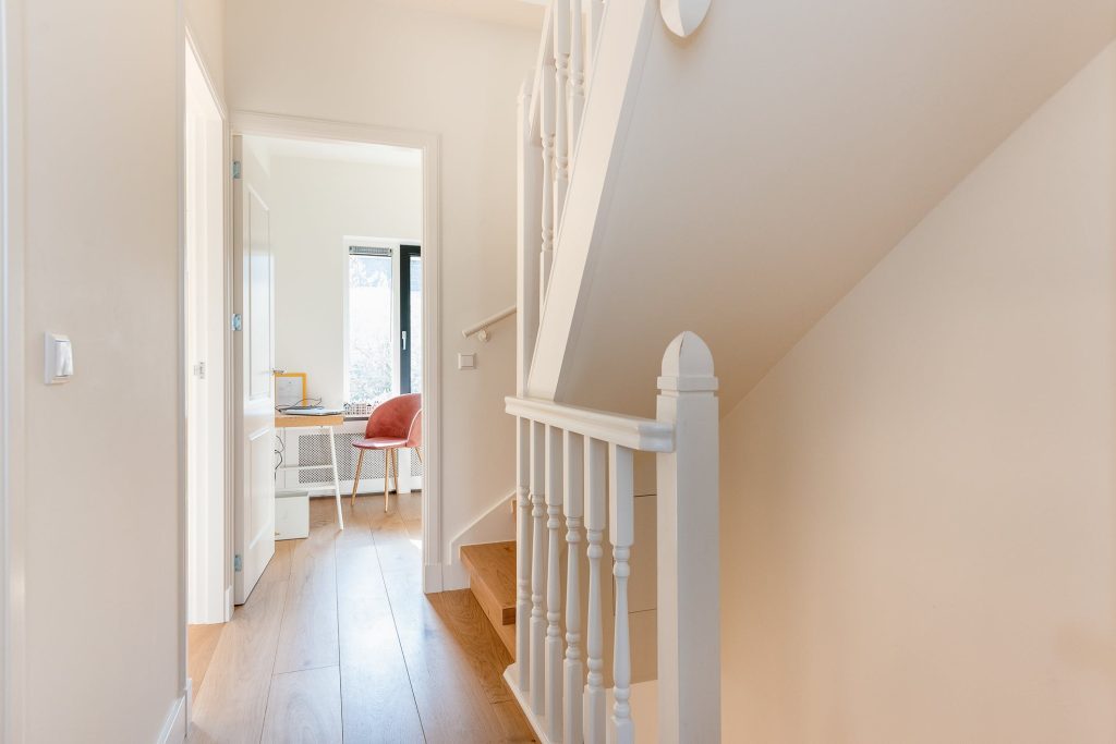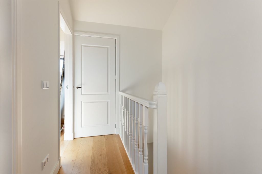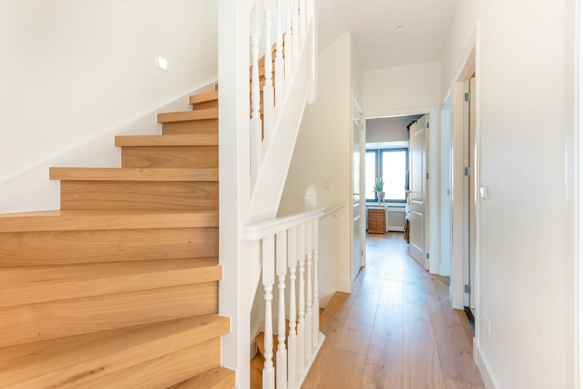 Trap naar de eerste verdieping, overloop, modern tweede toilet met hangend closet en fontein, op deze verdieping bevinden zich vier slaapkamers waarvan aan de voorzijde momenteel wordt gebruikt als werkkamer. Riante luxueuze badkamer voorzien van ligbad, separate douche, wastafelmeubel, designradiator en vloerverwarming.