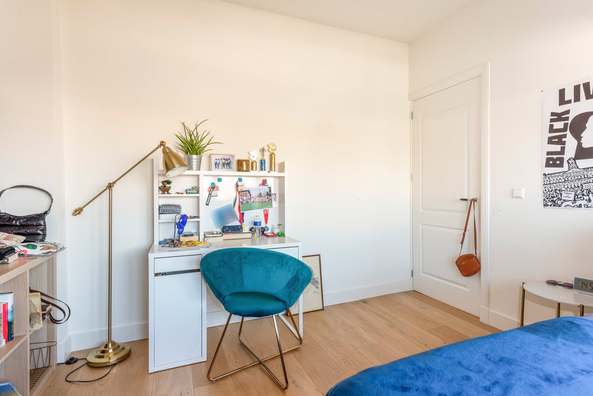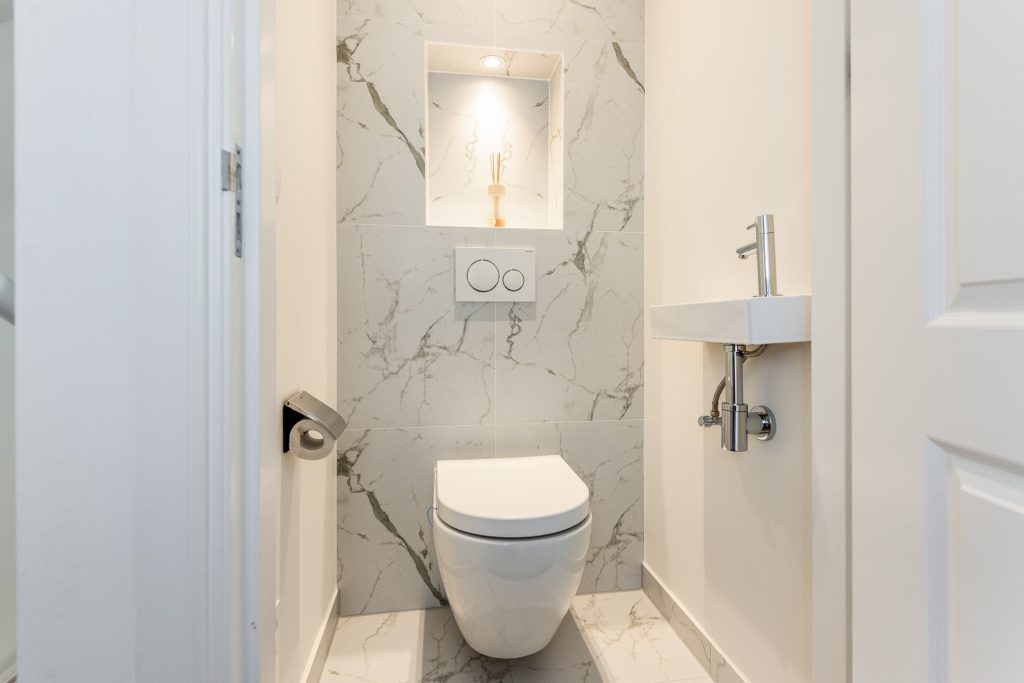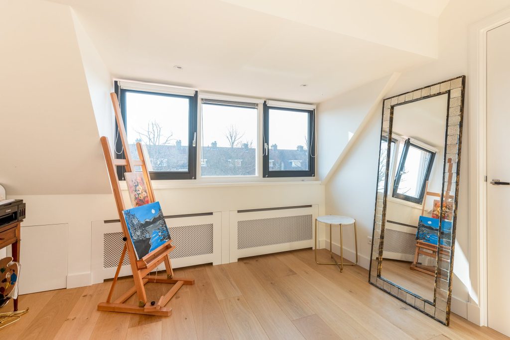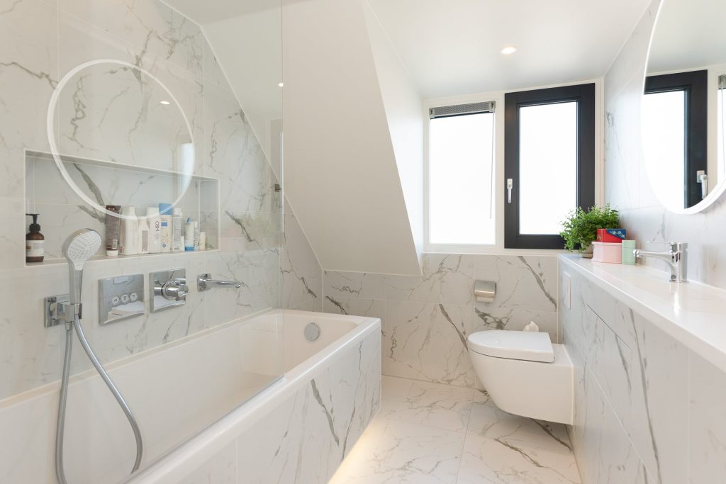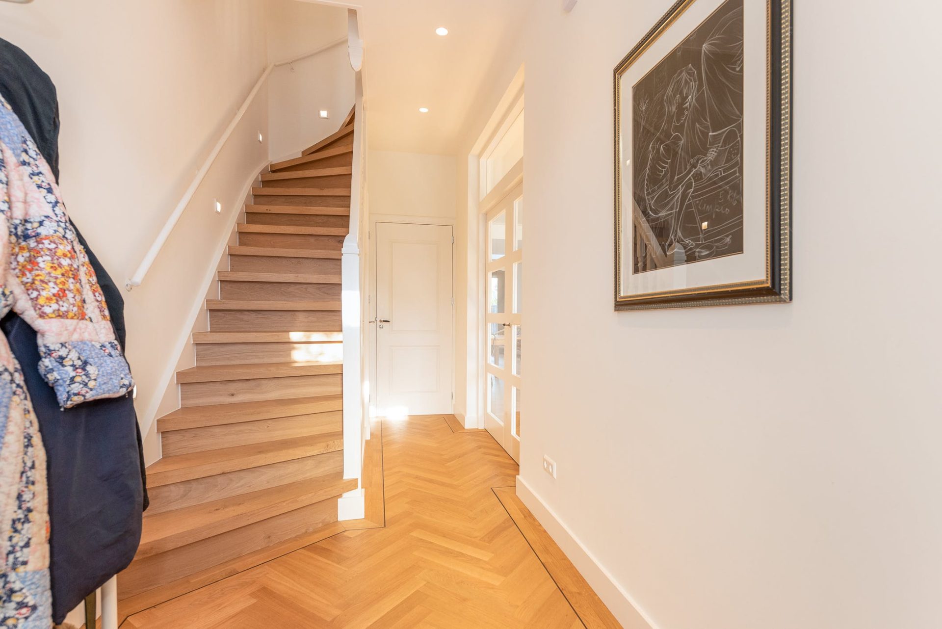 Trap naar de eerste verdieping, overloop, modern tweede toilet met hangend closet en fontein, op deze verdieping bevinden zich vier slaapkamers waarvan aan de voorzijde momenteel wordt gebruikt als werkkamer. Riante luxueuze badkamer voorzien van ligbad, separate douche, wastafelmeubel, designradiator en vloerverwarming.