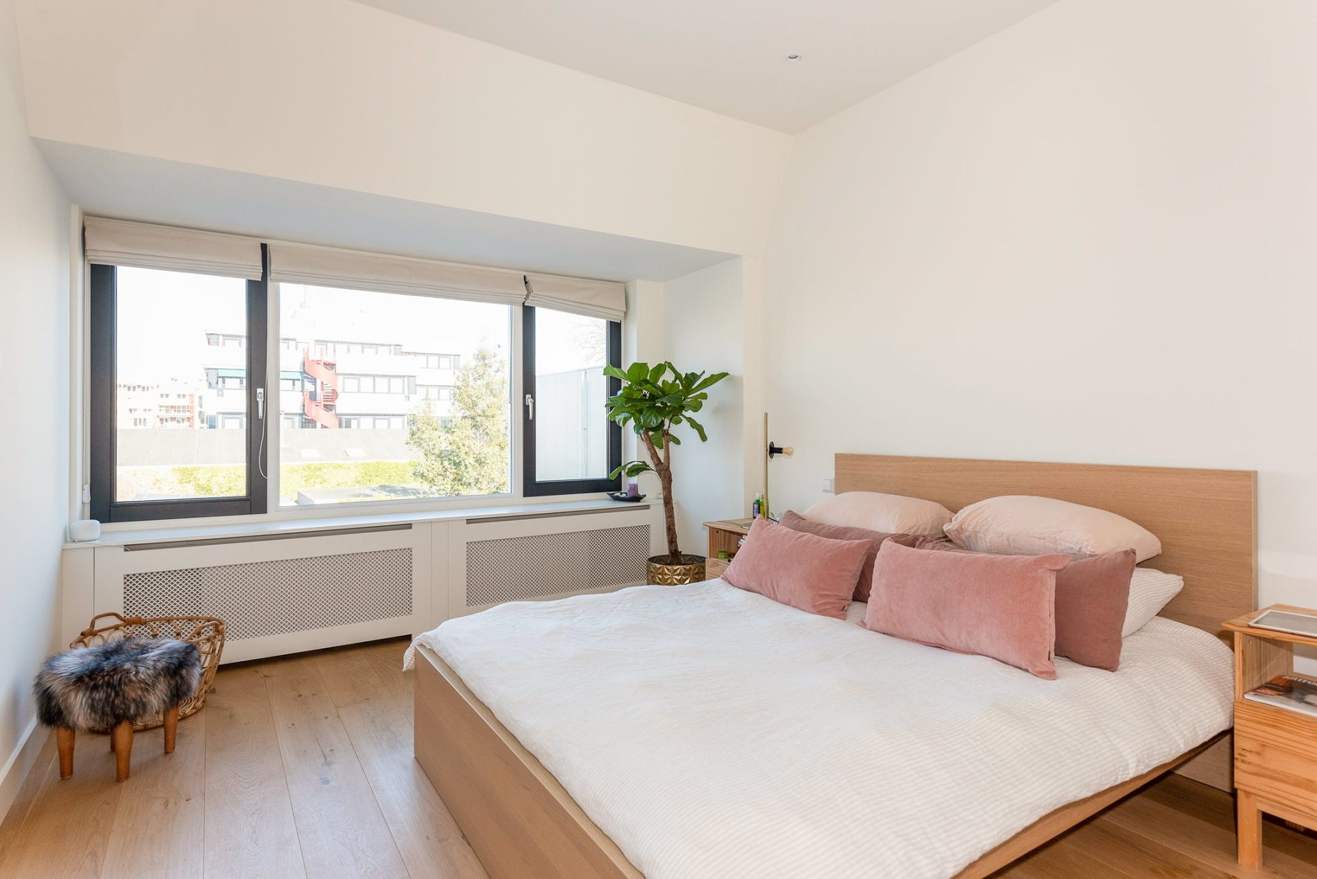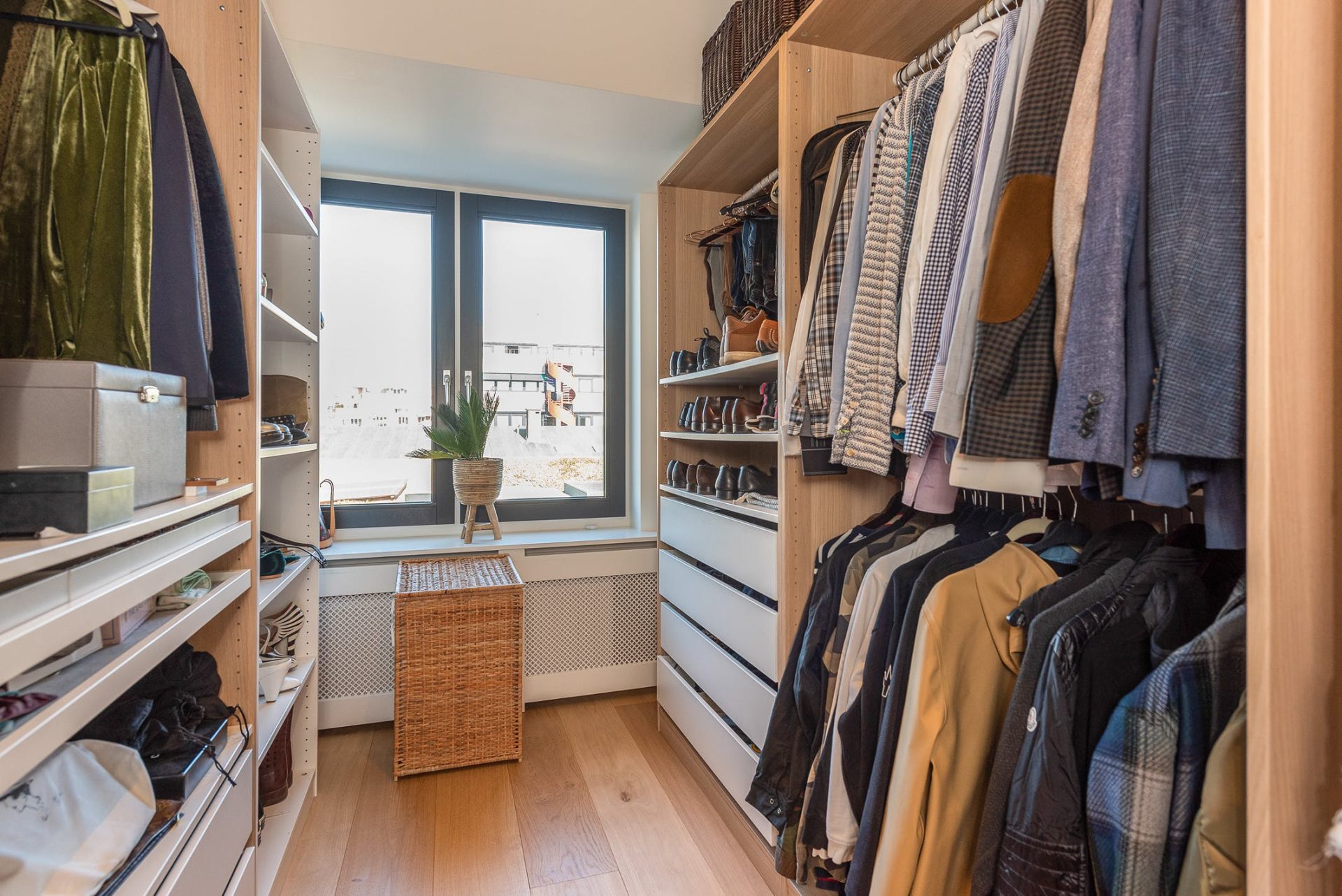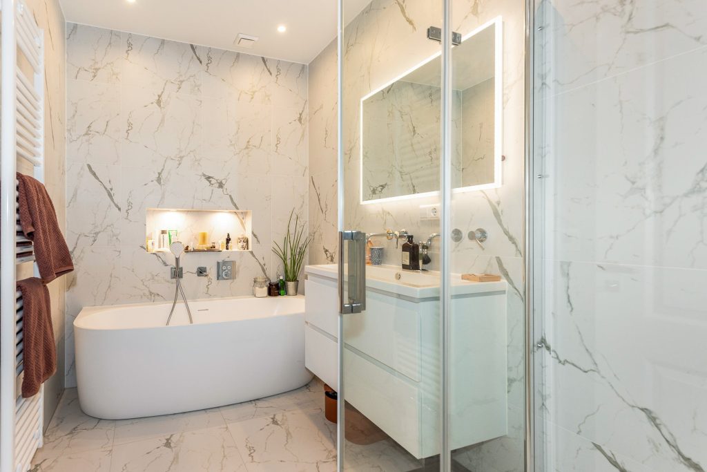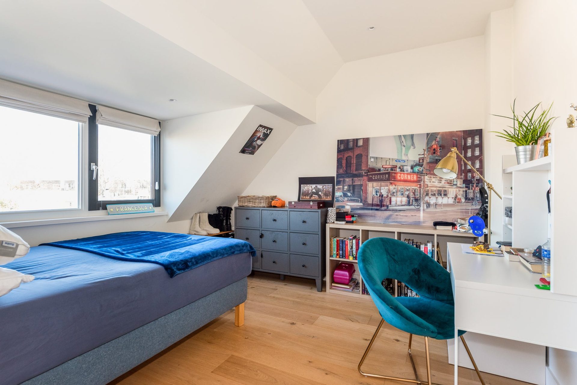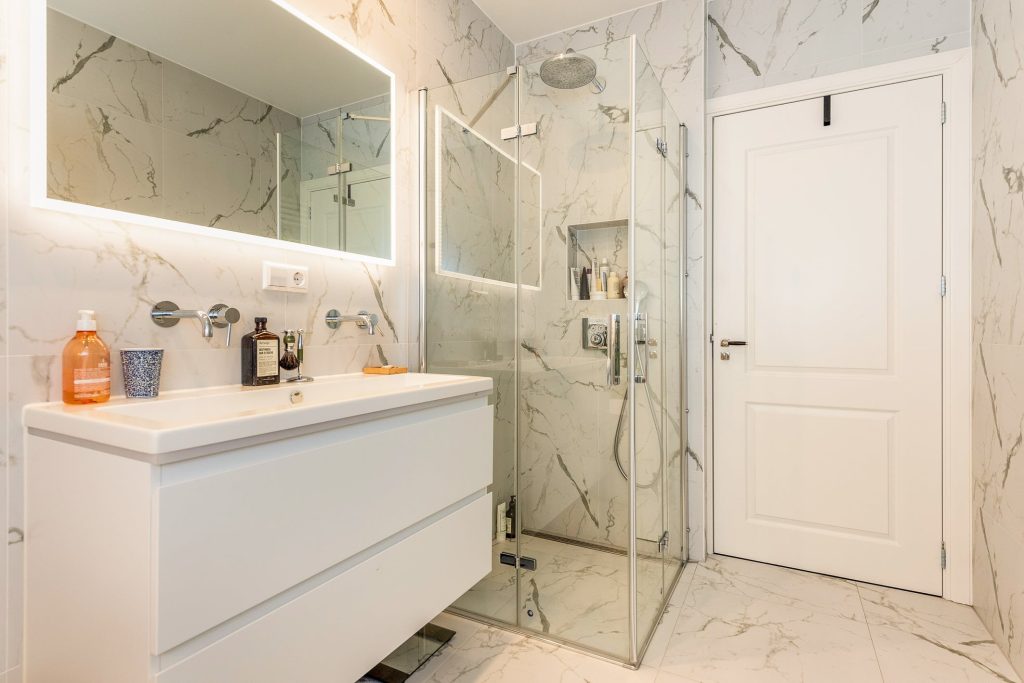 Trap naar de eerste verdieping, overloop, modern tweede toilet met hangend closet en fontein, op deze verdieping bevinden zich vier slaapkamers waarvan aan de voorzijde momenteel wordt gebruikt als werkkamer. Riante luxueuze badkamer voorzien van ligbad, separate douche, wastafelmeubel, designradiator en vloerverwarming.