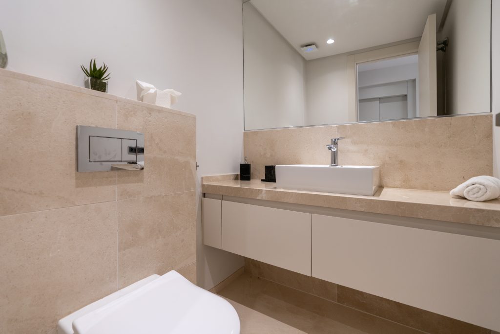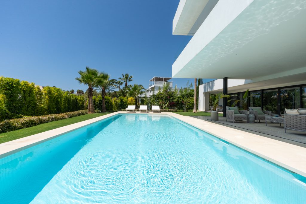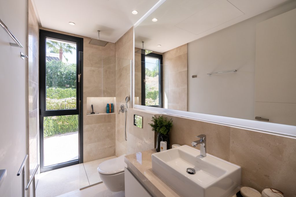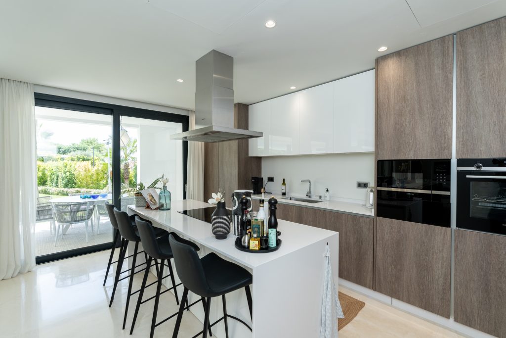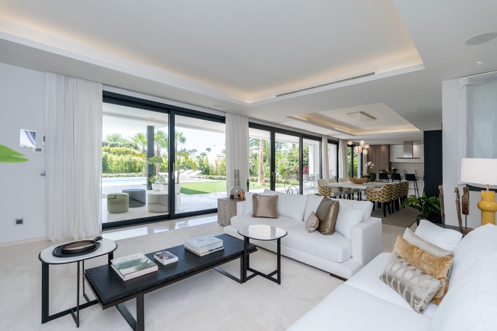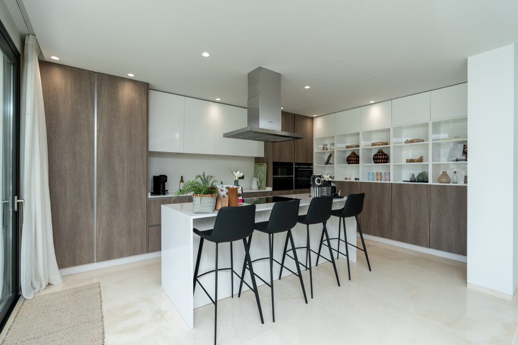 Entreehal leidt naar de lichte en open leefruimte, voorzien van vloer-tot-plafond ramen en directe toegang tot de overdekte en open terrassen en het privézwembad en de tuin. Volledig open leefruimte, eetgedeelte en volledig uitgeruste keuken met hoogwaardige apparatuur. De begane grond biedt ook een gastentoilet en twee gastenslaapkamers met eigen badkamers.