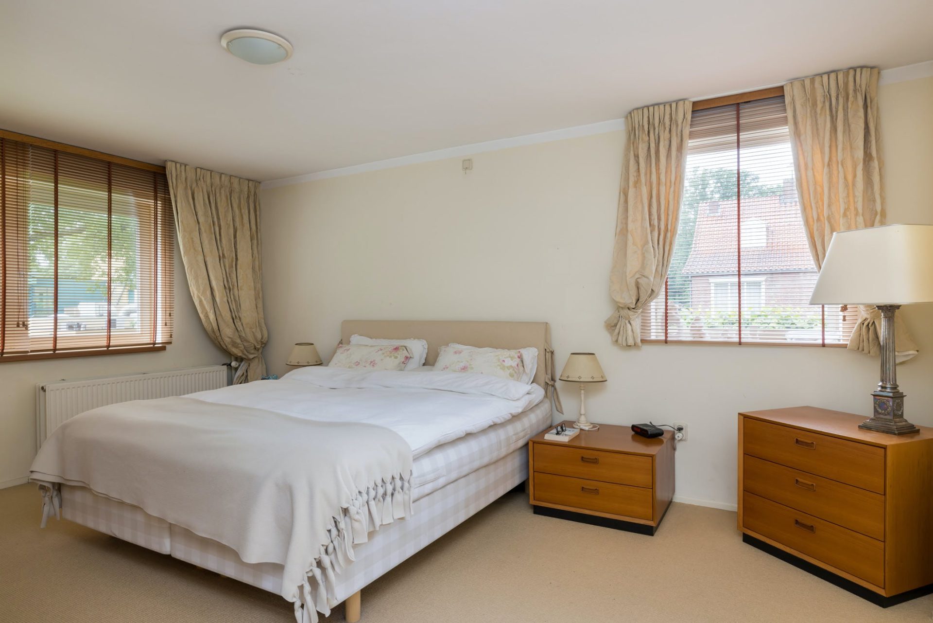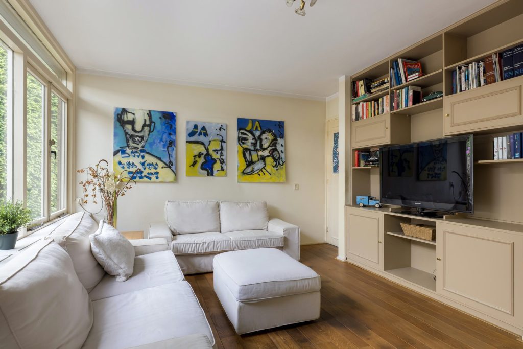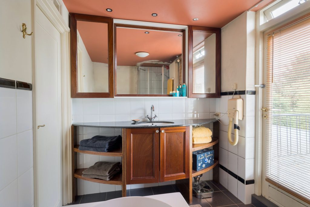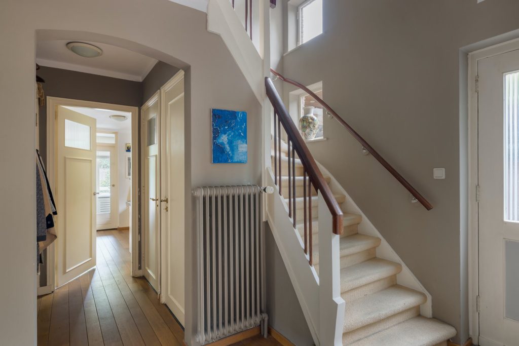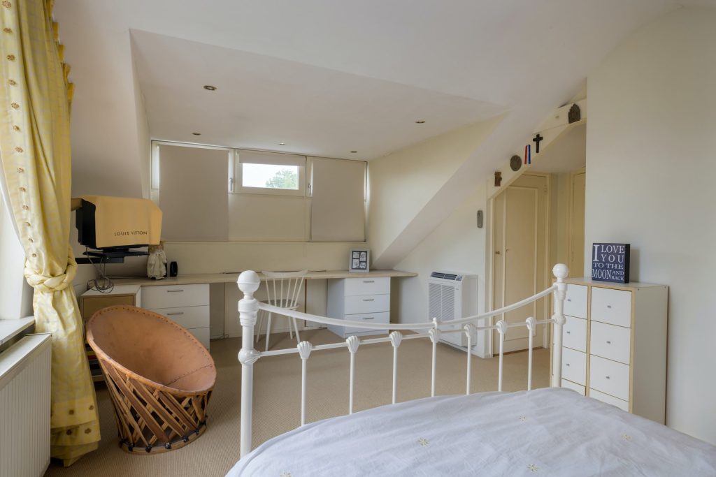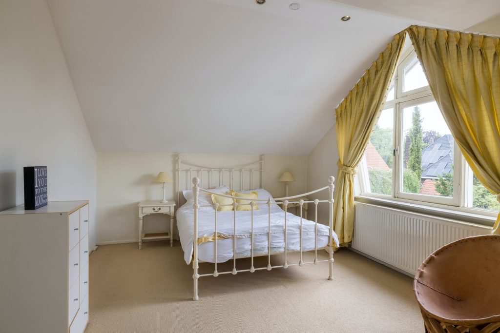 Dit is een echt familiehuis want op de tweede verdieping zijn nog twee slaapkamers, een tweede badkamer en een toiletruimte. De slaapkamer aan de achterzijde heeft een dakkapel en airconditioning. Grote ramen in beide kamers is een van de typische stijlelementen uit de jaren ’50. Vanaf de overloop zijn de badkamer met douchegelegenheid en de toiletruimte te bereiken, uitgevoerd in dezelfde stijl.