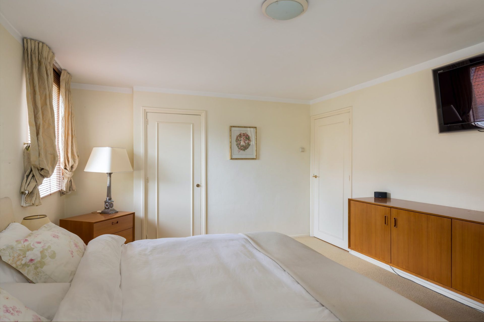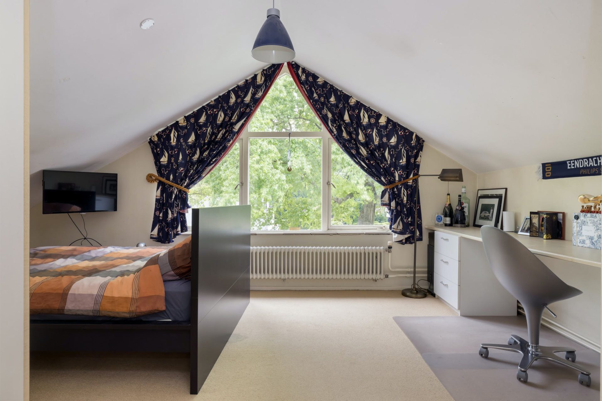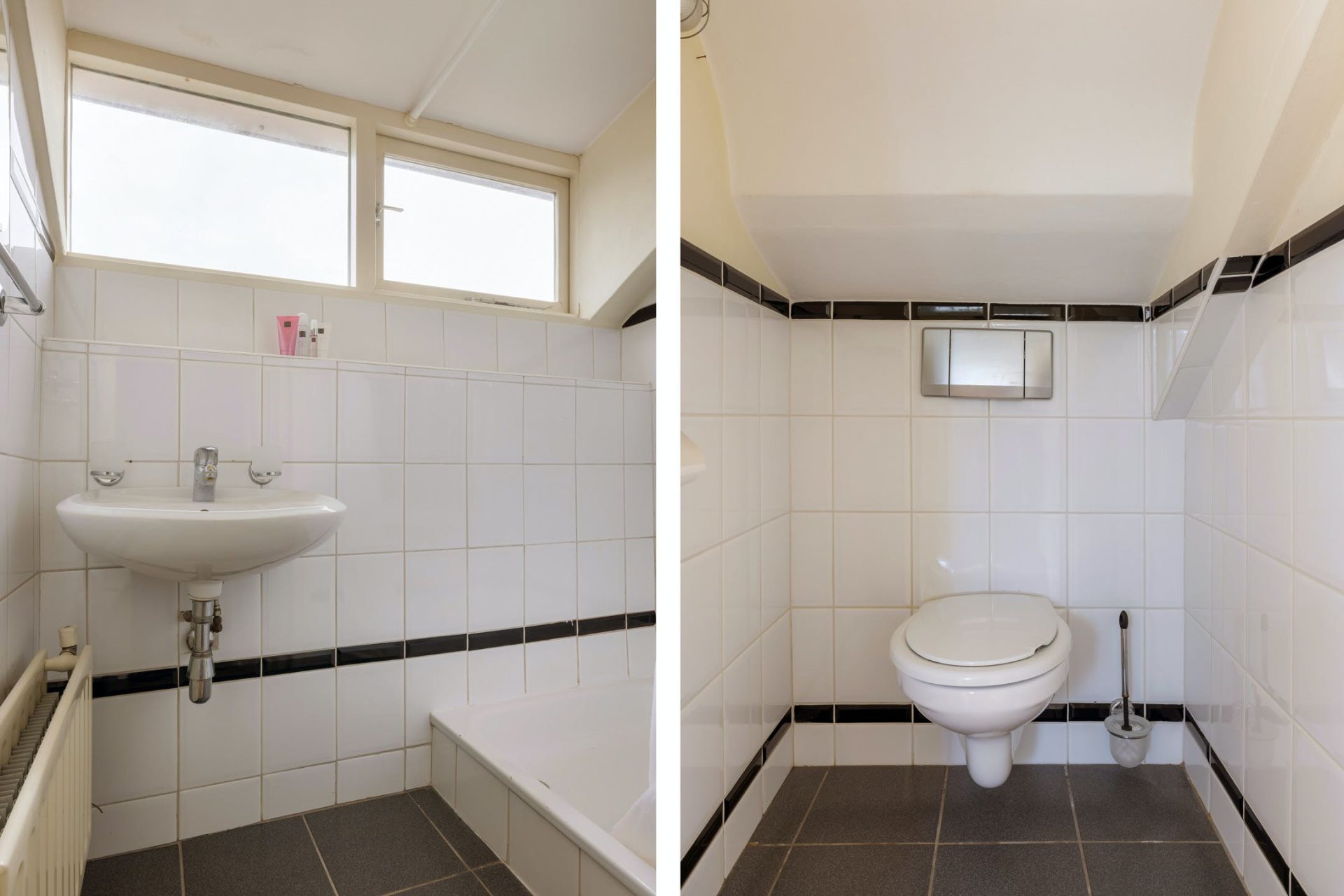 Dit is een echt familiehuis want op de tweede verdieping zijn nog twee slaapkamers, een tweede badkamer en een toiletruimte. De slaapkamer aan de achterzijde heeft een dakkapel en airconditioning. Grote ramen in beide kamers is een van de typische stijlelementen uit de jaren ’50. Vanaf de overloop zijn de badkamer met douchegelegenheid en de toiletruimte te bereiken, uitgevoerd in dezelfde stijl.
