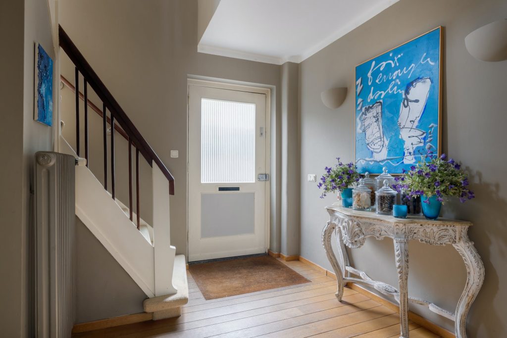Aan de rechterzijde is de entree met een kleine overkapping en verhoogd plateau. Vanuit de hal met vide zijn de woonkamer, keuken, kelder en de toiletruimte met fonteintje te bereiken. Naast de toiletruimte is de trap naar de wijn-/provisiekelder en aan de andere zijde van de hal is de garderobenis. De paneeldeuren en houten vloer, die op nagenoeg de hele begane grond ligt, geven de hal karakter.