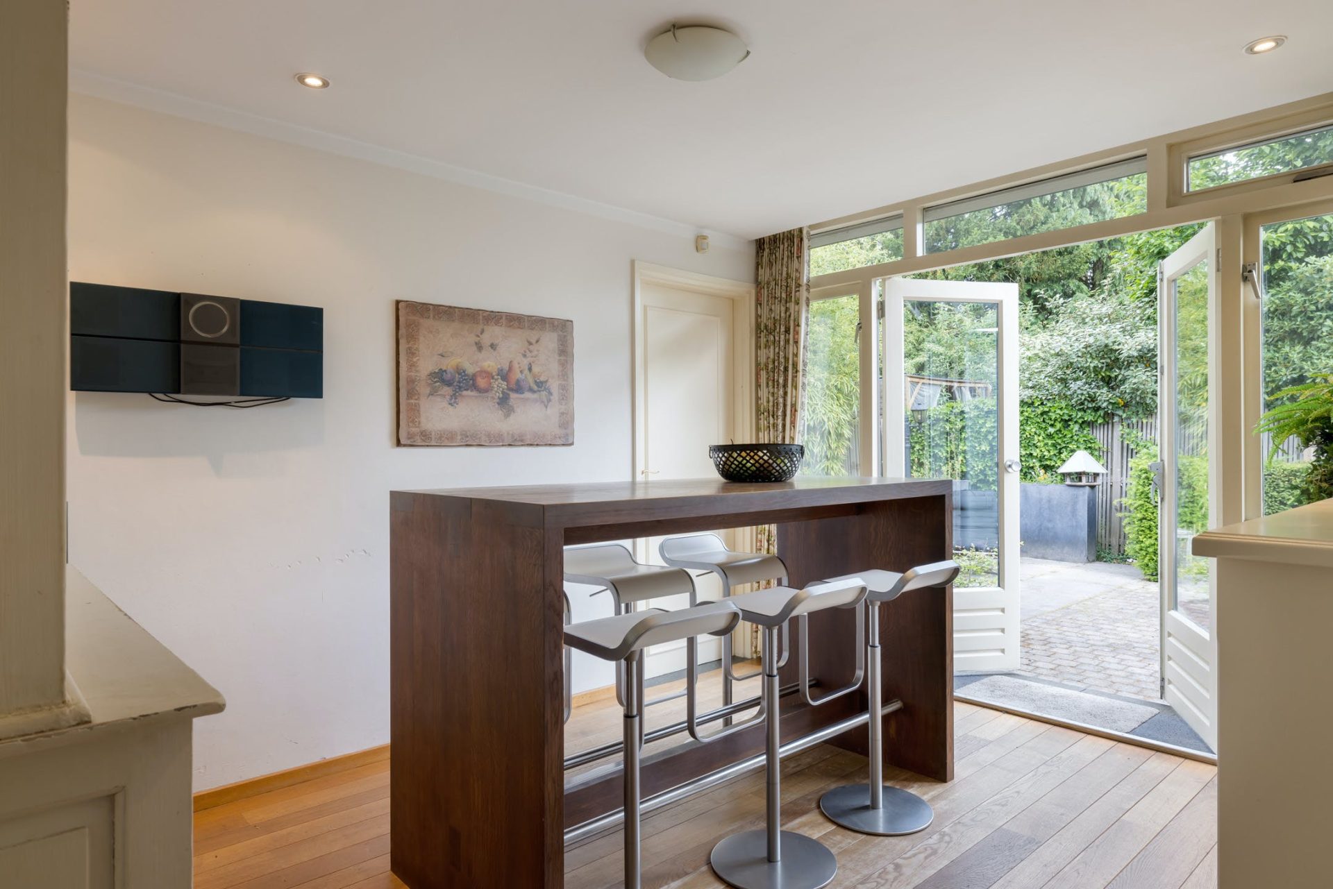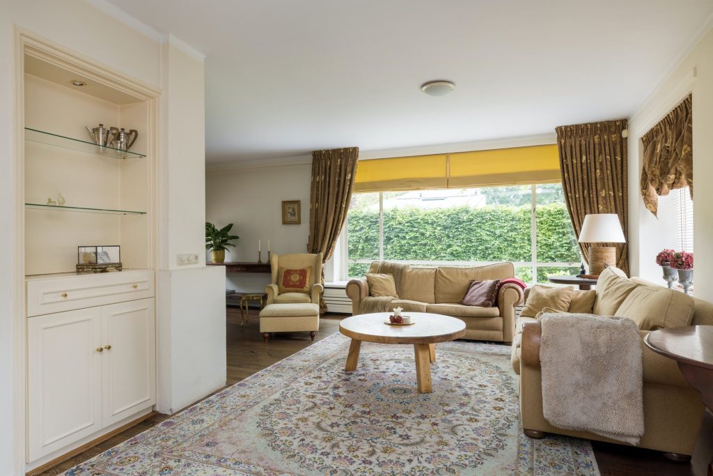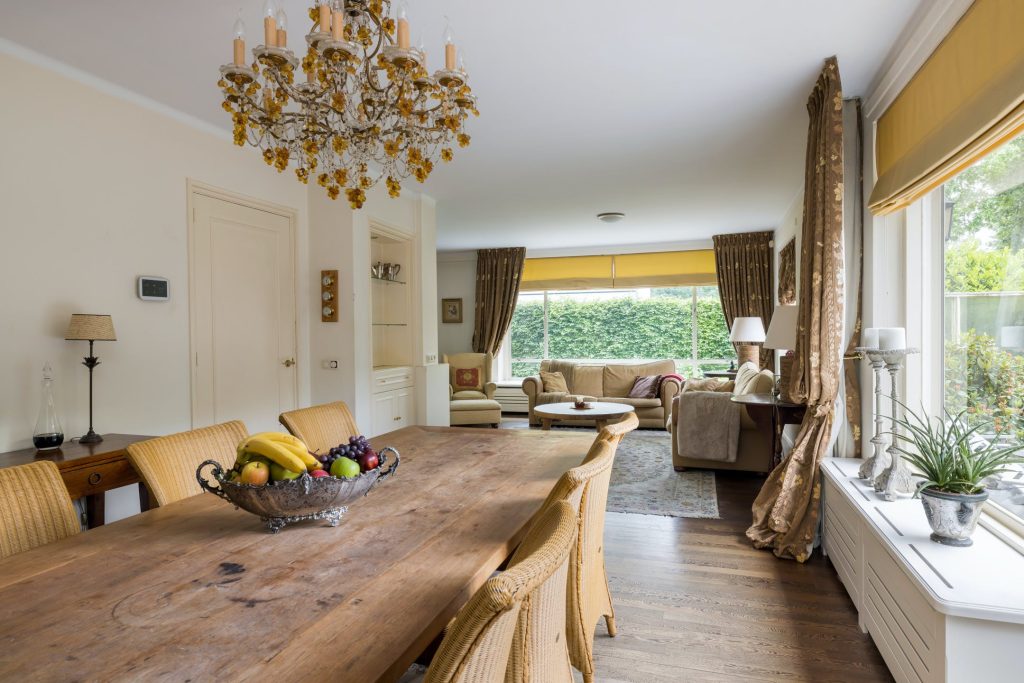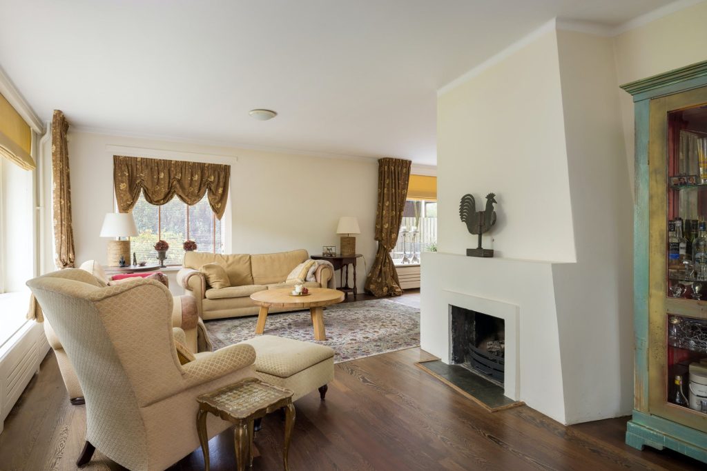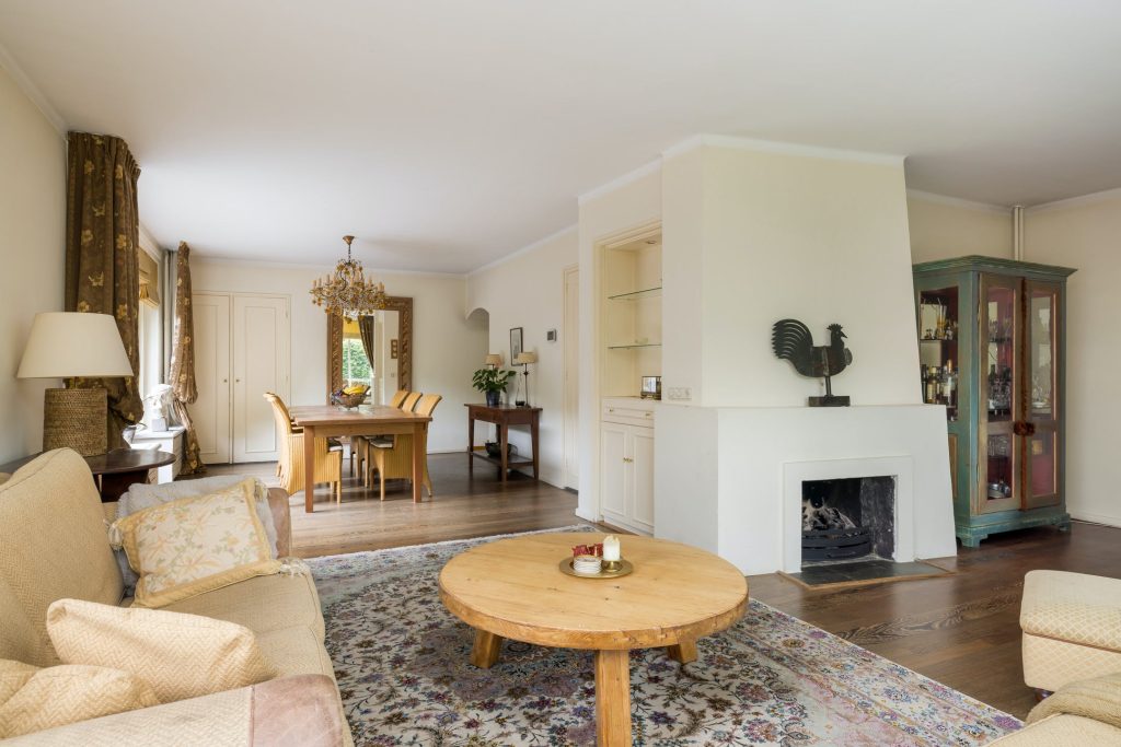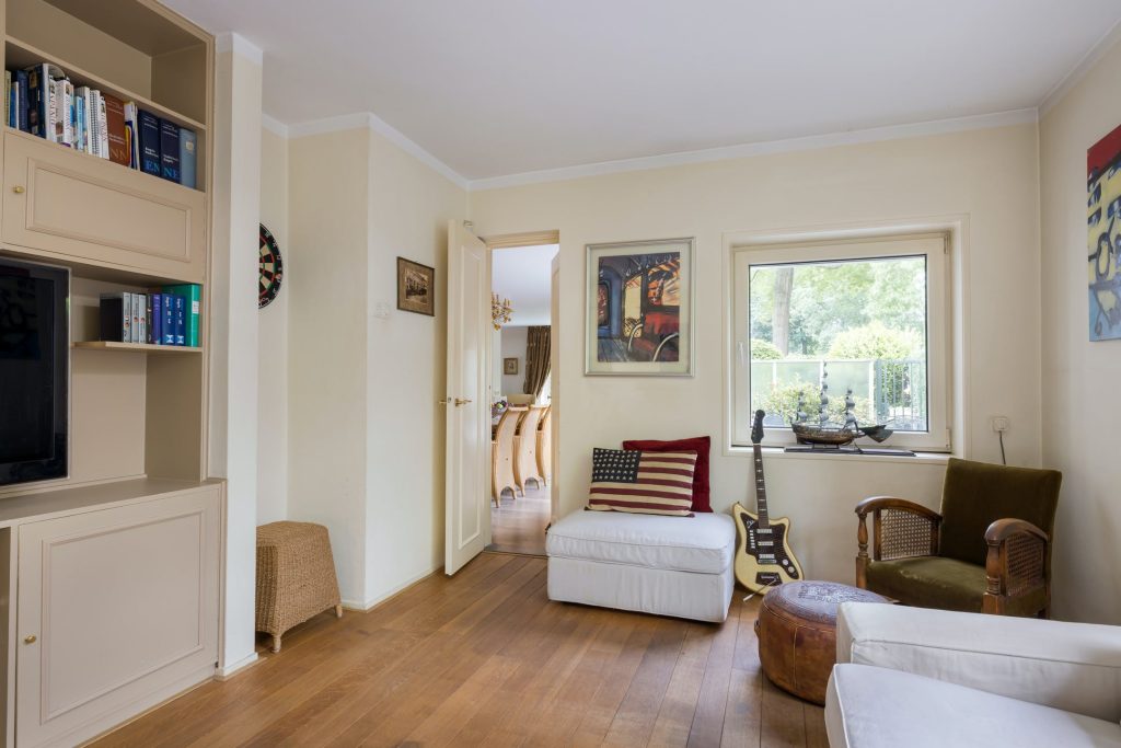 Grote ramen aan de zuid- en westkant zorgen voor een woonkamer met veel lichtinval en optimaal tuincontact. Aan de voorzijde is het bijna 7 meter brede zitgedeelte met open haard en aan de westkant is het eetgedeelte, van waaruit het terras aan de westkant te bereiken is. Achter één van de paneeldeuren bij het eetgedeelte is een ruime speel-/werkkamer met op maat gemaakte kasten en uitzicht naar de zijtuin.