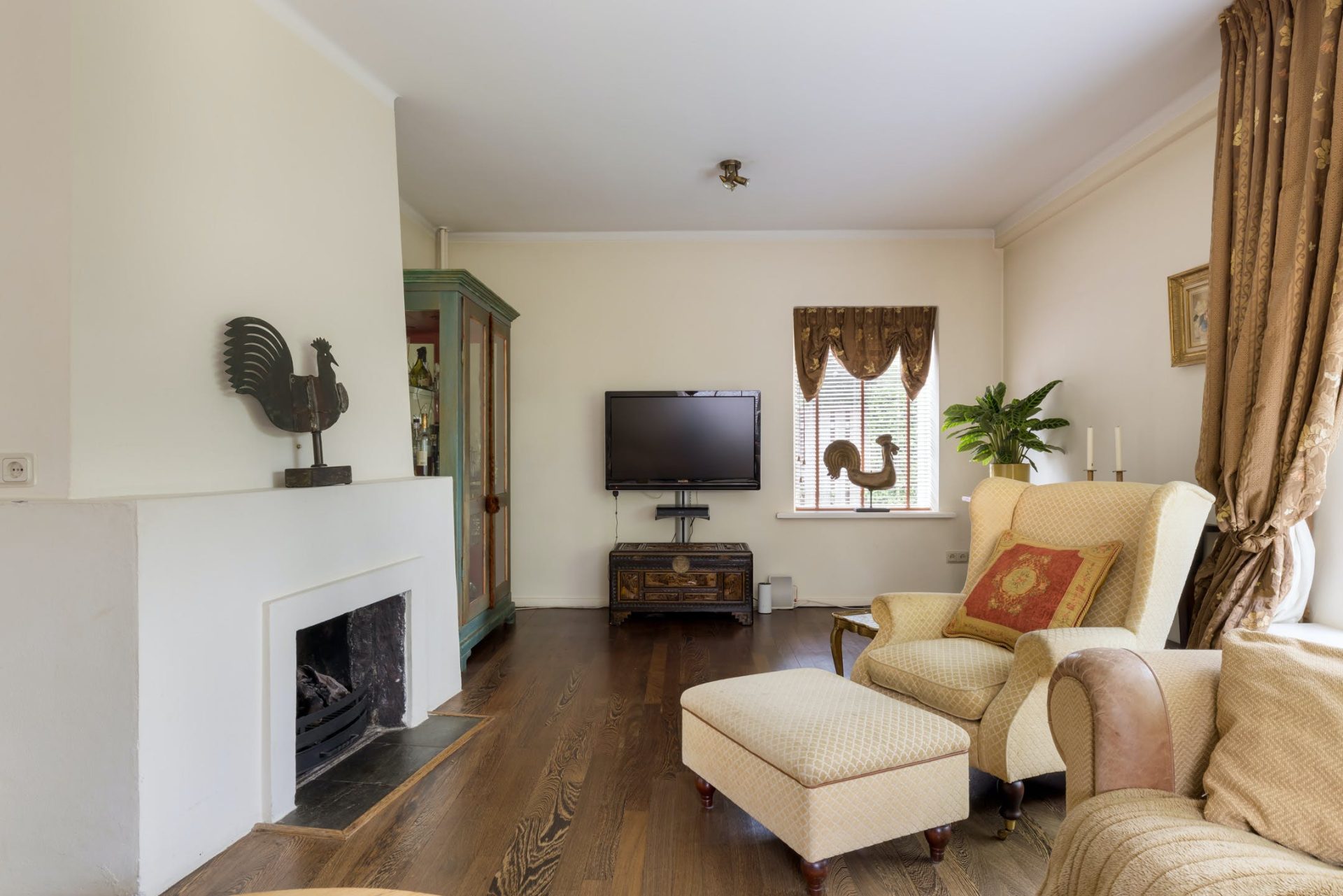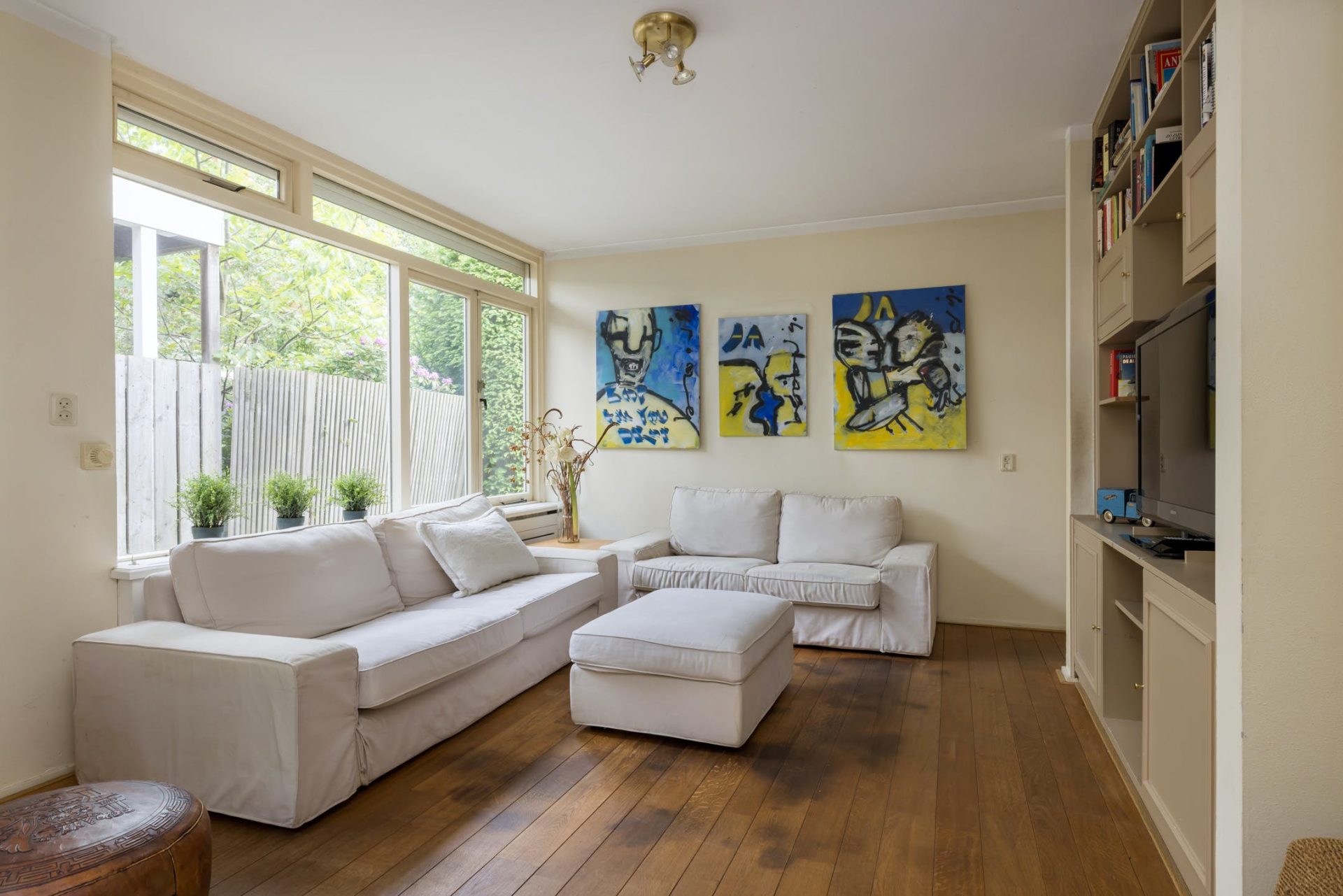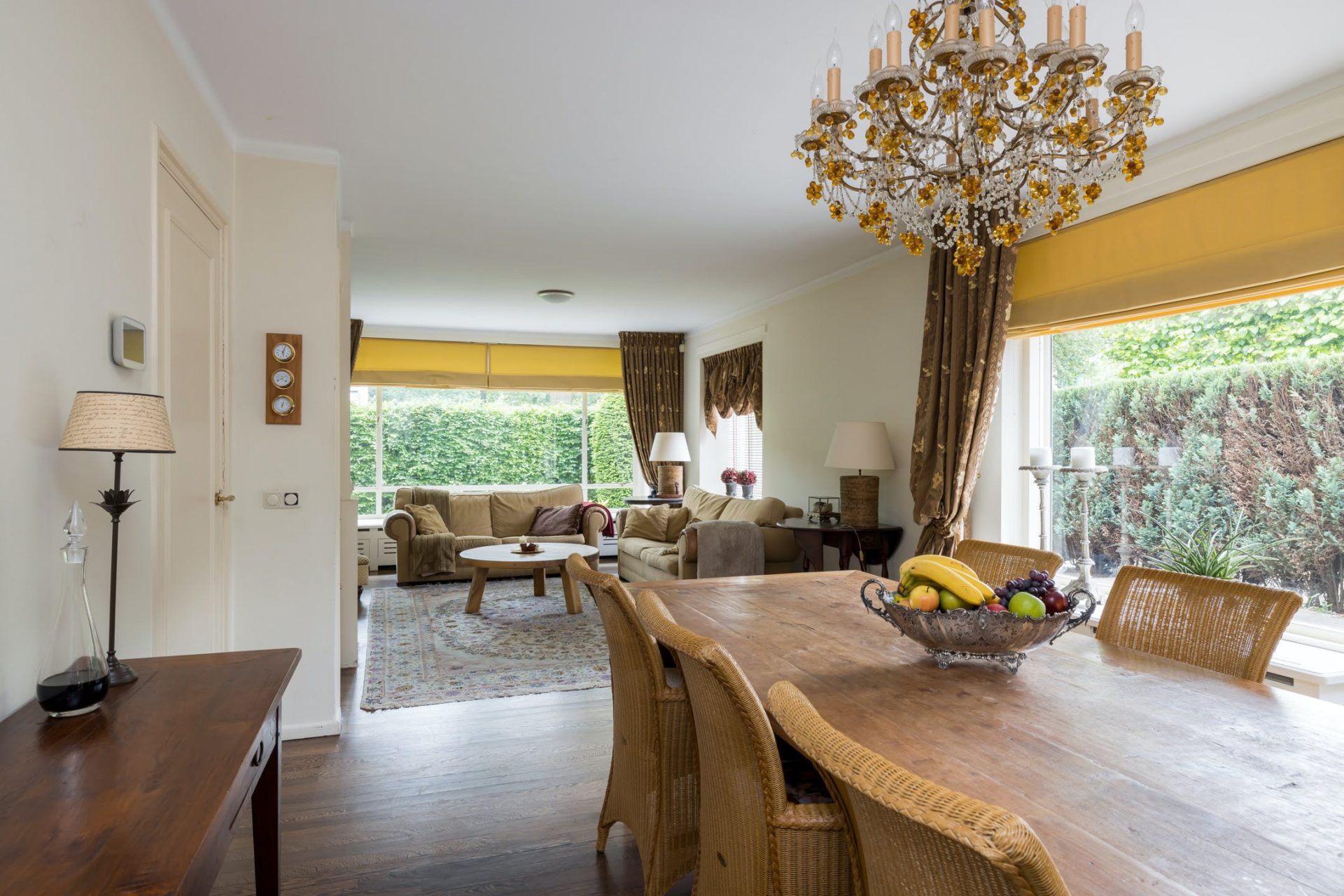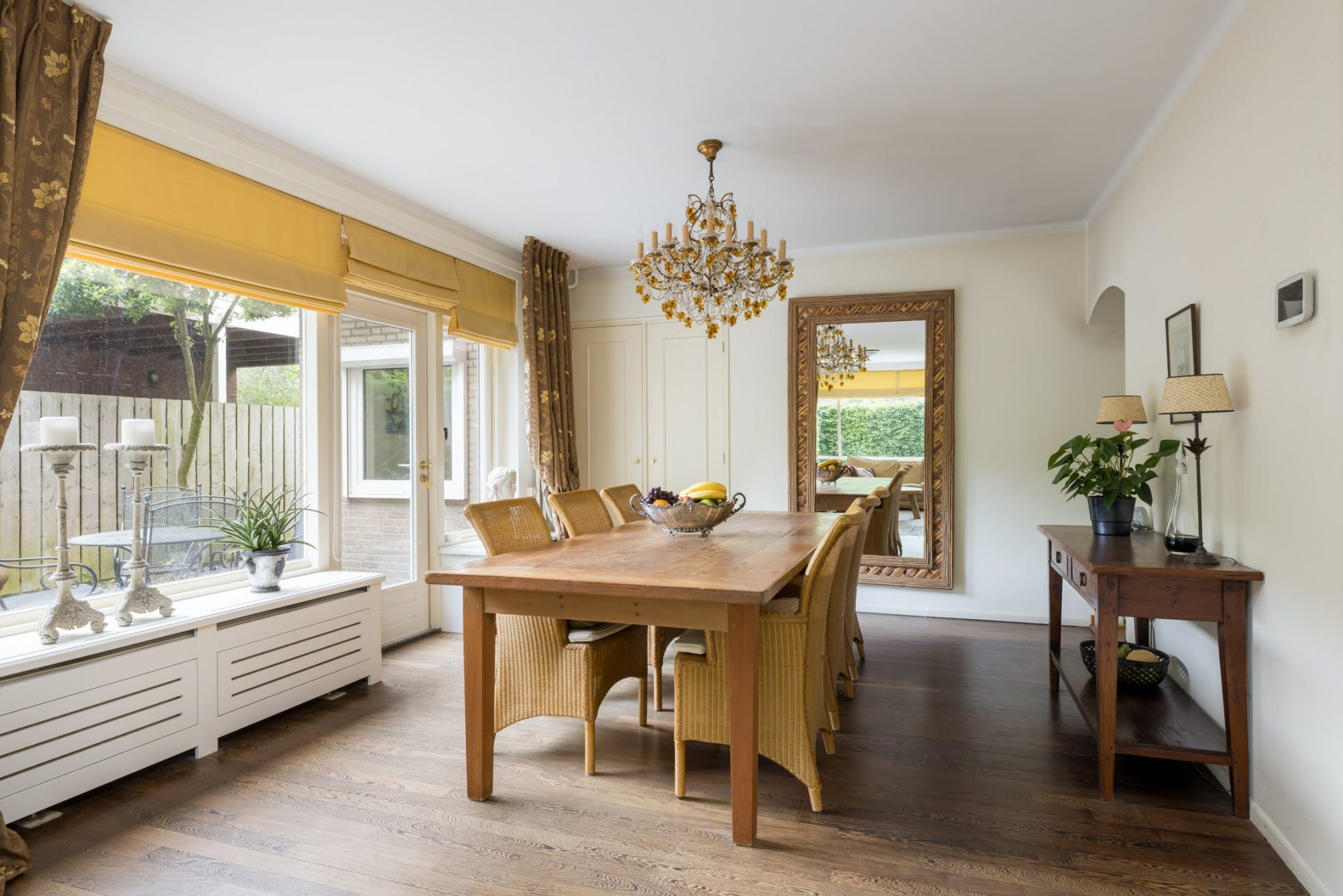 Grote ramen aan de zuid- en westkant zorgen voor een woonkamer met veel lichtinval en optimaal tuincontact. Aan de voorzijde is het bijna 7 meter brede zitgedeelte met open haard en aan de westkant is het eetgedeelte, van waaruit het terras aan de westkant te bereiken is. Achter één van de paneeldeuren bij het eetgedeelte is een ruime speel-/werkkamer met op maat gemaakte kasten en uitzicht naar de zijtuin.