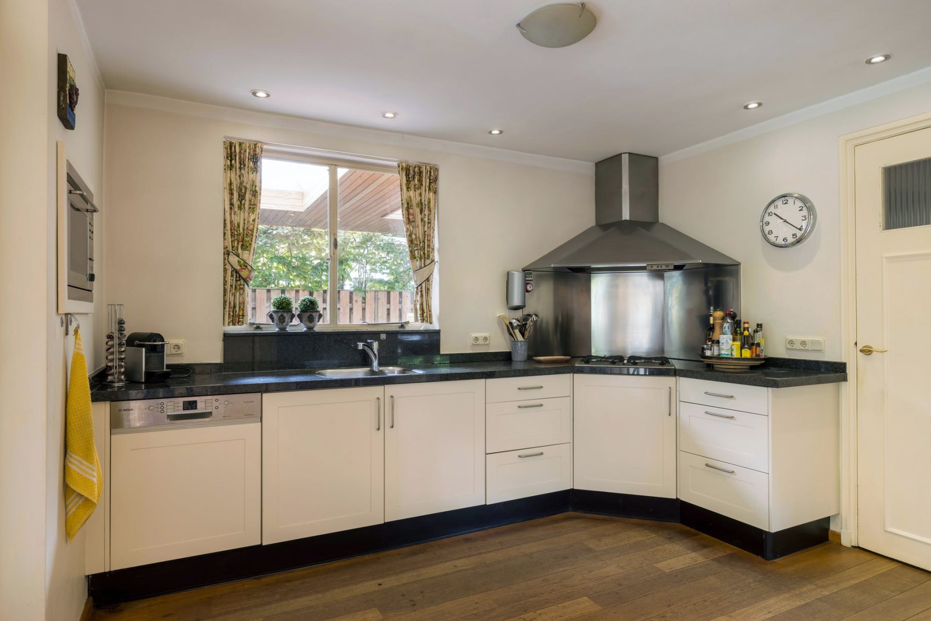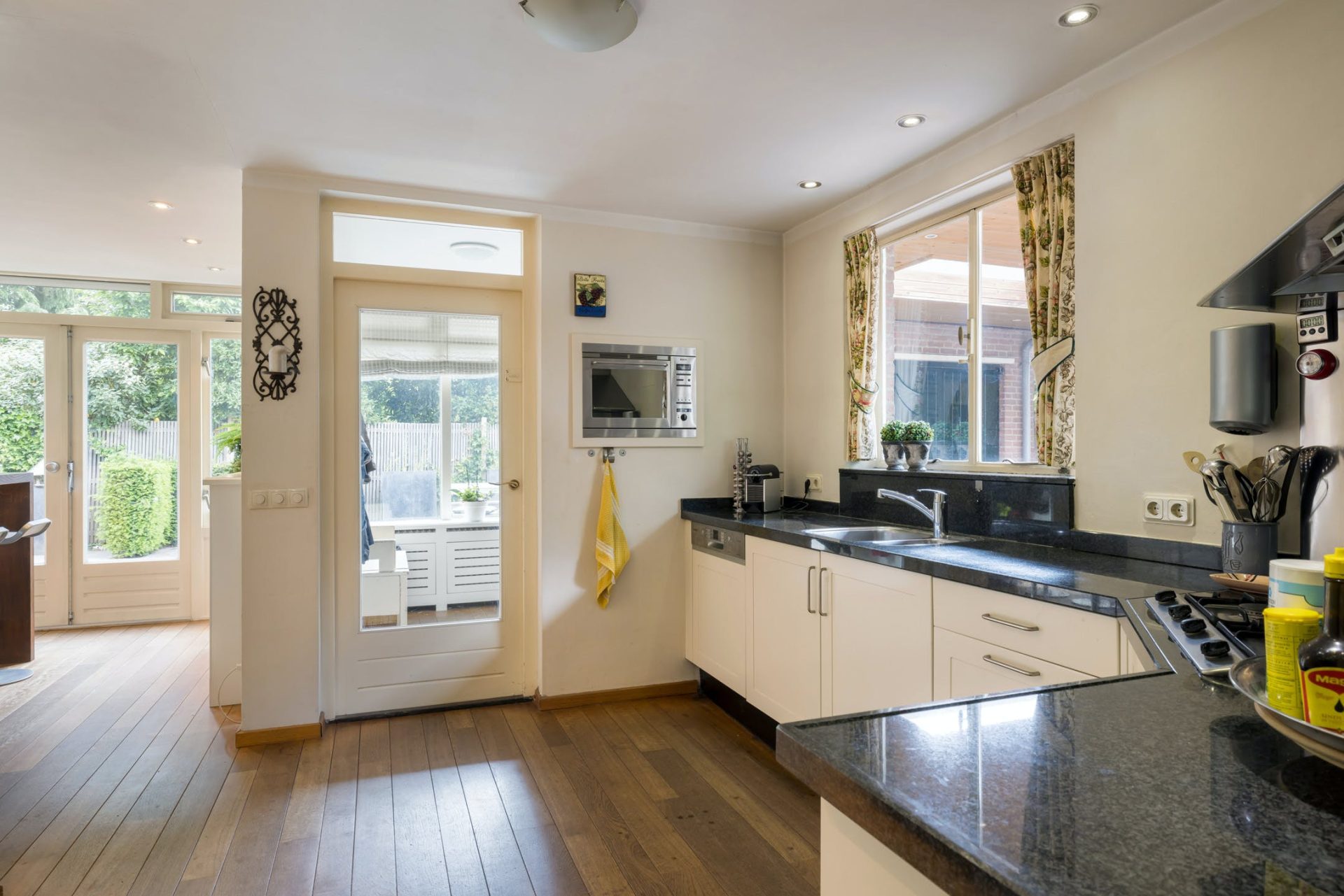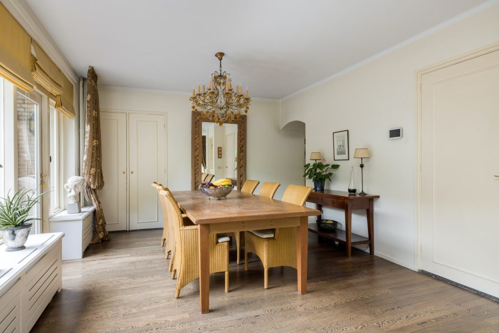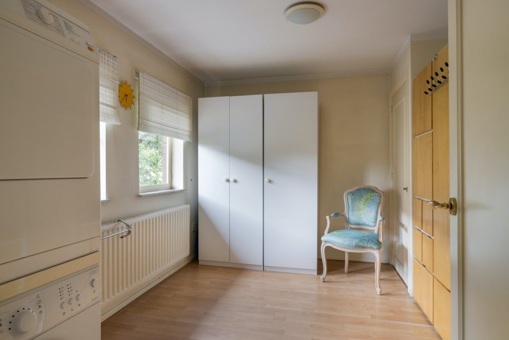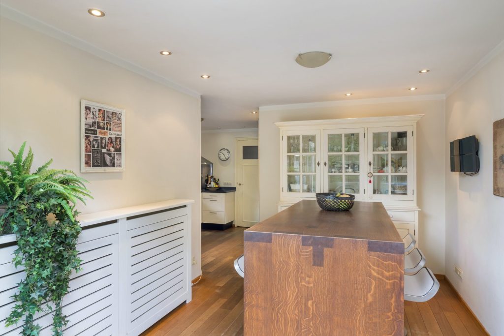 De keuken staat in verbinding met de bijkeuken en tuingerichte eetkamer, voorzien van openslaande deuren. Ook in de keuken ligt een houten vloer wat zorgt voor een aangename, huiselijke sfeer. De hoekopstelling heeft een granieten werkblad en alle benodigde apparatuur is ingebouwd. In de bijkeuken is een deur naar de carport met aansluitende oprit.