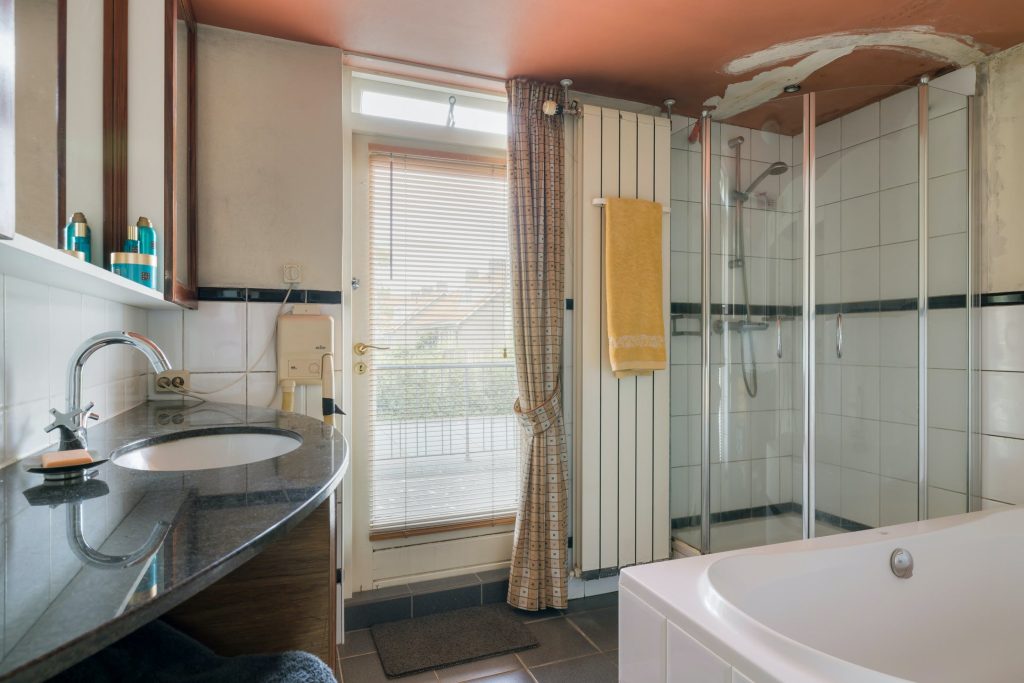 Aan de achterzijde is de badkamer met een bad, aparte douche en een breed wastafelmeubel. Via de deur met groot raam is het balkon te bereiken. Het toilet met wandcloset zit in een aparte ruimte, te bereiken vanaf de overloop.