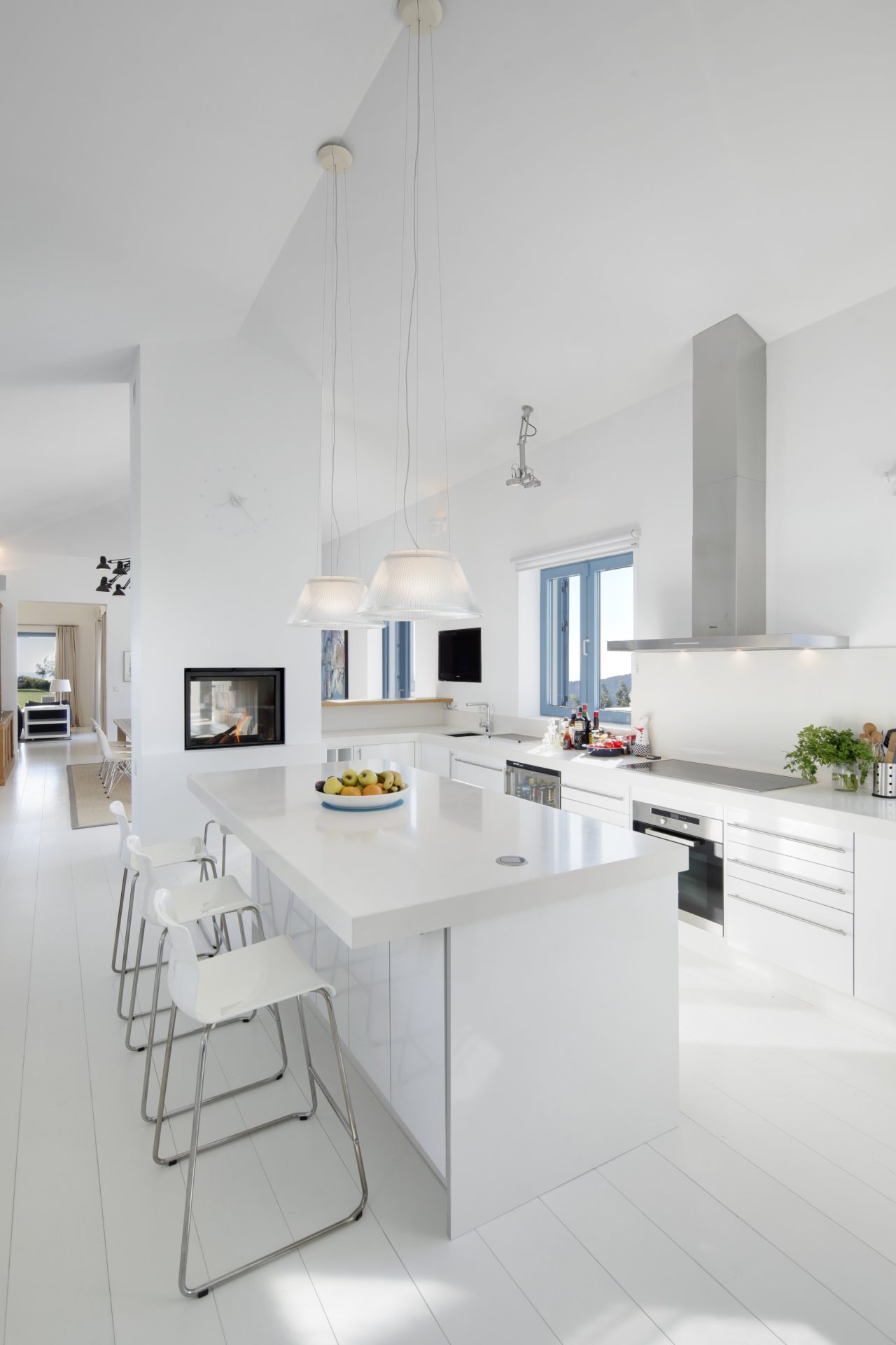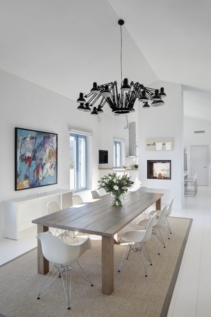 Op de hoofdverdieping bevindt zich een royale woonruimte met hoge plafonds, een open haard, een aparte eetkamer en een volledig uitgeruste keuken in open plan. Een mezzanine biedt ruimte voor een kantoor of tv-ruimte. De master slaapkamer en suite is voorzien van een kleedruimte, terwijl twee gastenkamers ook elk een eigen badkamer hebben. Daarnaast is er nog een kleine slaapkamer naast de keuken.