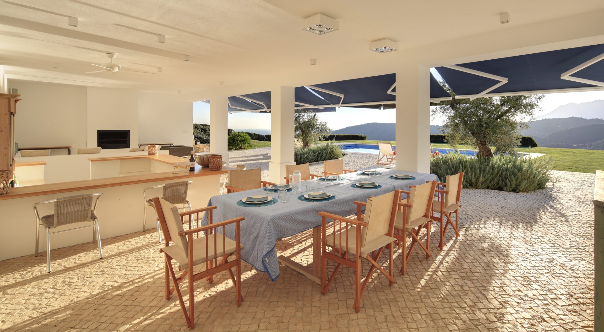 De overdekte en open terrassen met een totale oppervlakte van meer dan 240 m² bieden directe toegang tot de prachtig onderhouden tuinen en het verleidelijke zwembadgedeelte.