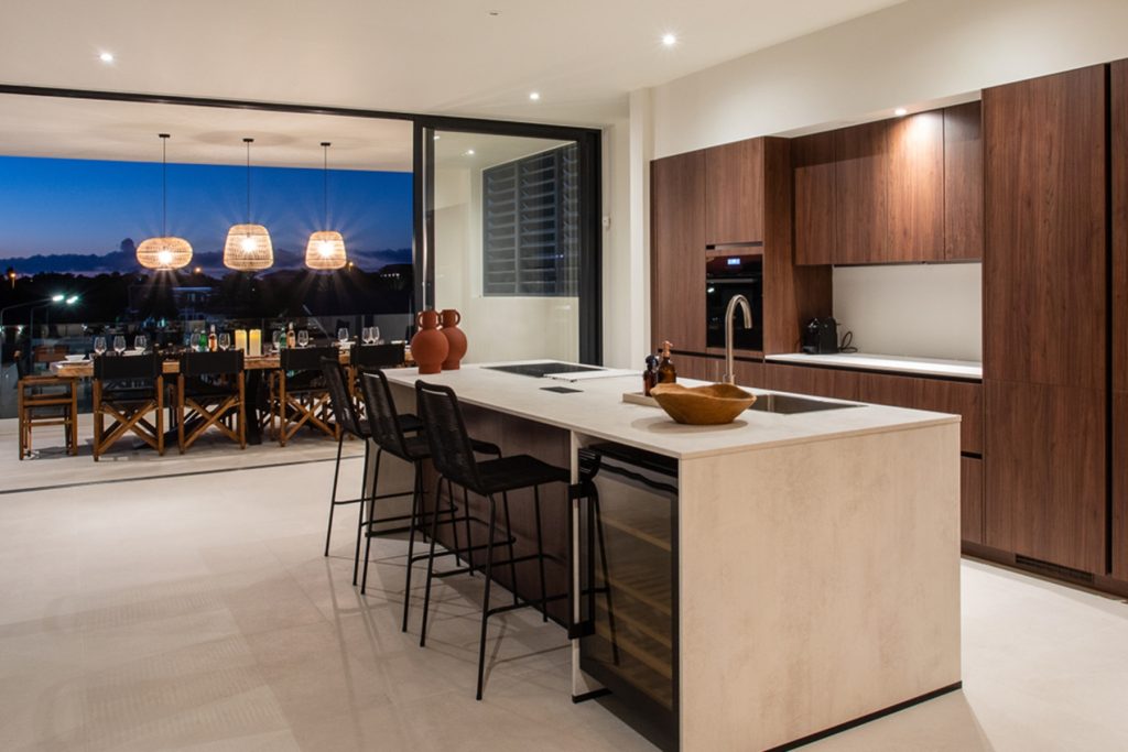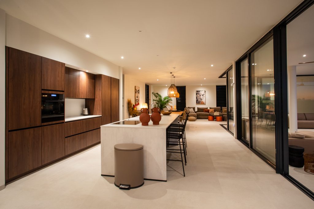 Via de met LED’s verlichte trap ga je naar de tweede verdieping. De open woonkamer en keuken bieden direct uitzicht op het overdekte terras, het zwembad en Vista Royal. De hoofdslaapkamer met directe toegang tot het zwembad en het overdekte terras heeft ook een ingebouwde kast, een eigen badkamer en uitzicht op Vista Royal. Terug in de open L-vormige ruimte is een woonruimte gevolgd door een eetruimte en vervolgens de keuken. Houten kasten in contrast met het witte design zijn voorzien van oven, vaatwasser en ingebouwde koelkast. Het kookeiland met uitzicht op het zwembad is voorzien van kastjes, een gootsteen en een inductiekookplaat.