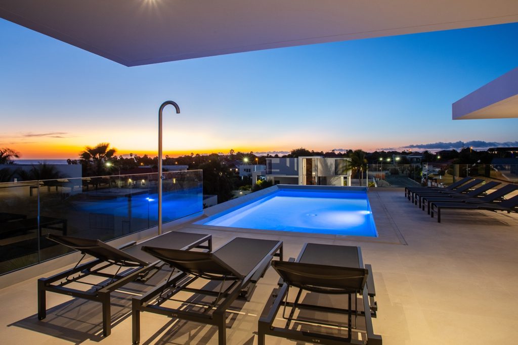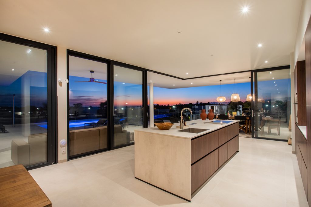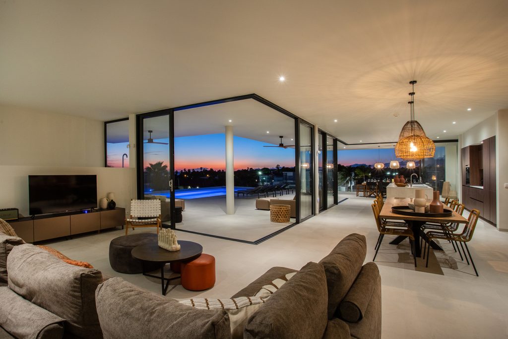 Glazen schuifdeuren en ramen omzomen het overdekte terras, waardoor de hele tweede verdieping volledig uitzicht en buitengewone zonsondergangen heeft over Vista Royal. Buiten zitten, dineren en ruimte voor loungebedden vindt u op het zwembadterras van 90 m² plus.