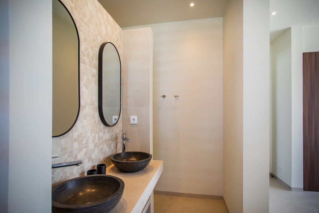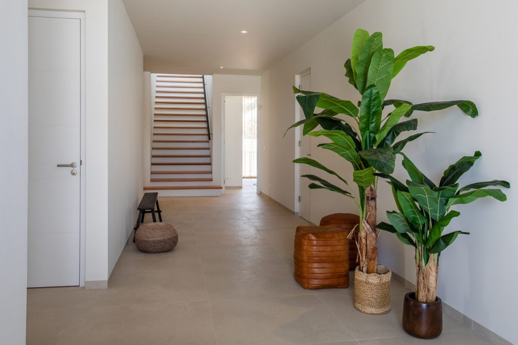 Een elektrische poort en toegangsdeur openen respectievelijk naar de verharde parkeerplaats en het betegelde pad. Graven en palmbomen verwelkomen je bij de S-vormige gevel van de villa. Eenmaal binnen liggen aan de linkerkant vier slaapkamers met eigen badkamer, elk met eigen douchecabine, dubbele wastafel en apart toilet. Aan de rechterkant is de resterende slaapkamer, gelijkaardig in stijl, ook met ingebouwde kast en schuifdeuren naar de tuin. Drie bergruimtes, een gastenbadkamer en toegang naar de achtertuin en de tweede verdieping bevinden zich allemaal in de gang.