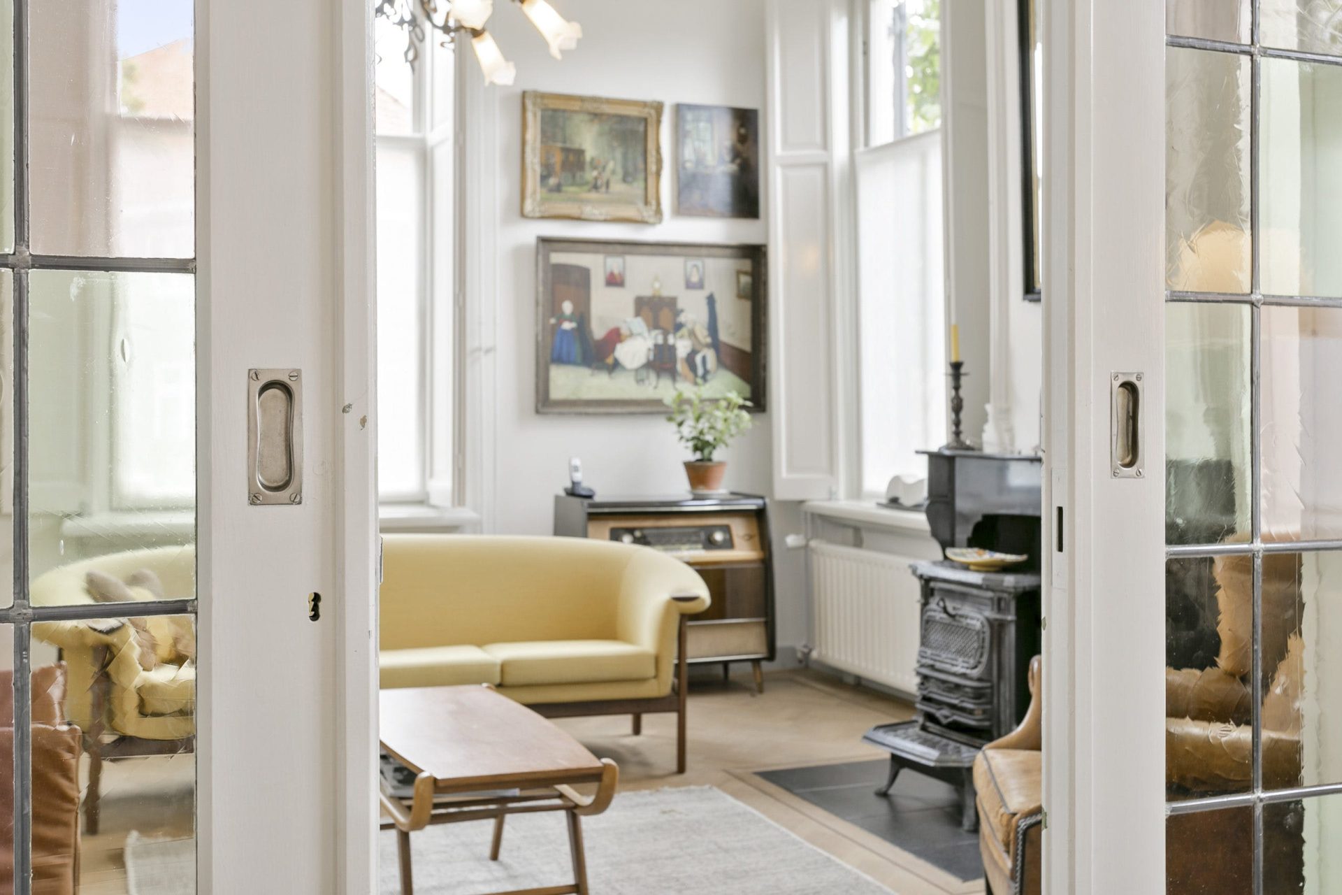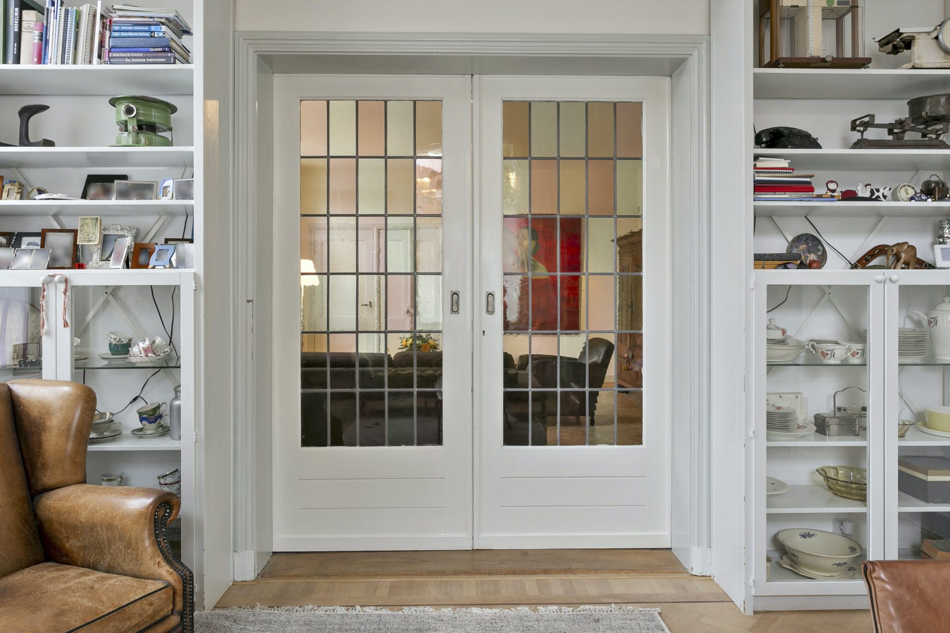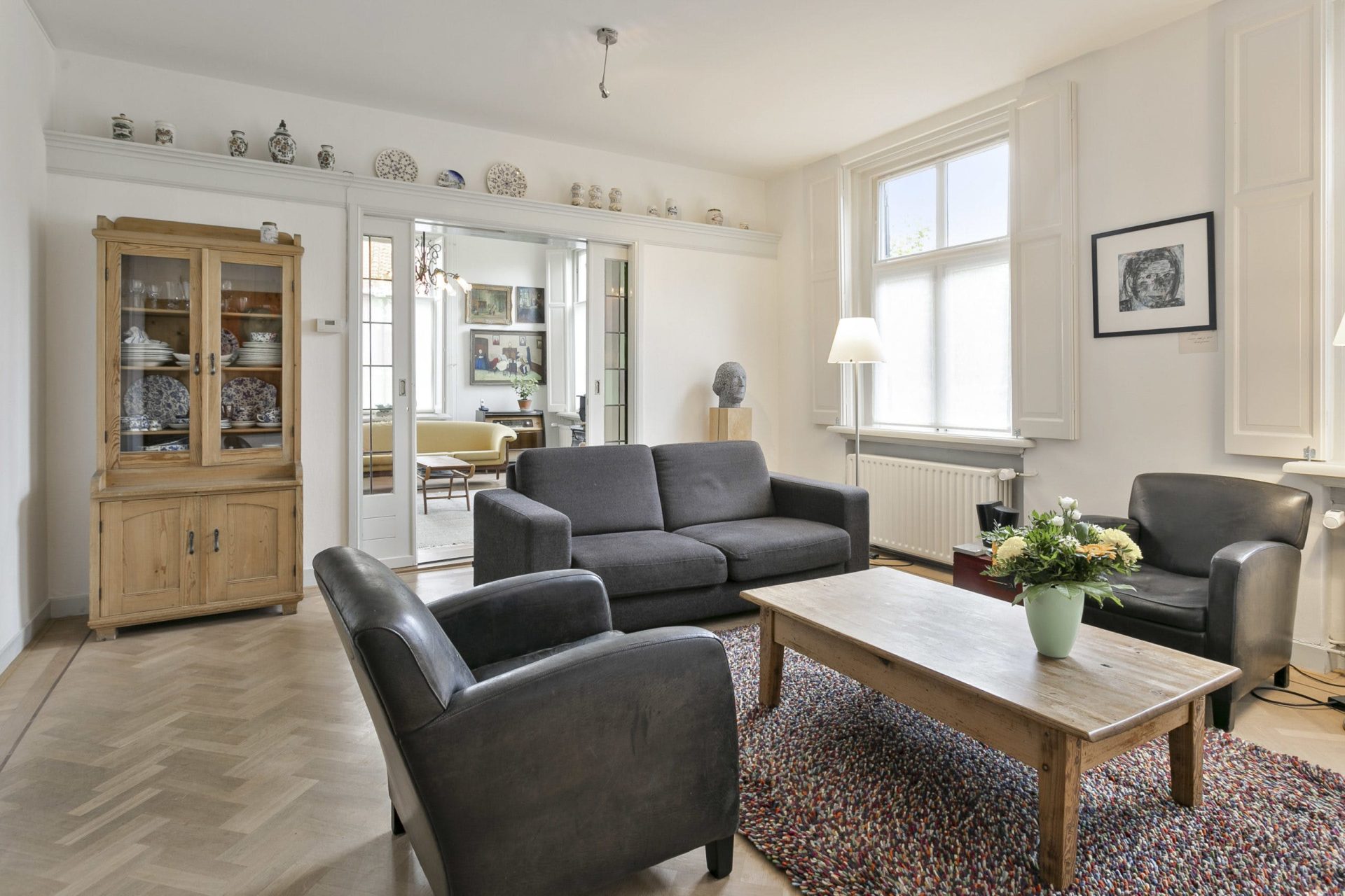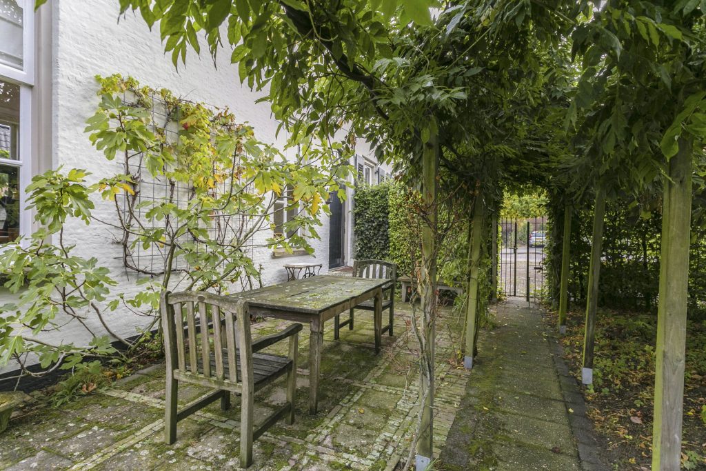 Entree naar imposante hal met natuurstenen vloer, hoog plafond, lambrisering en mooie doorkijk naar de tuin. Vanuit de hal zijn diverse vertrekken te bereiken als ook de trapopgang naar de verdieping. Aan de linkerzijde van de hal is er toegang tot een woonkamer en-suite met aan de voorzijde een zitkamer met houten visgraat parketvloer, hoog plafond met sierlijsten en een originele schouw met houtkachel. De schuifdeuren met rondom op maat gemaakte boekenkast, geven toegang tot de achterkamer met zit/tv-hoek, inbouwkast en deur naar tussenportaal. Ook in deze kamer ligt een houten visgraat parketvloer. Het tussenportaal geeft toegang tot de tuin en de eetkamer aan de achterzijde van de woning. De eetkamer is een prachtig, lichte ruimte met ramen rondom en uitzicht op de tuin. Ook hier een hoog plafond met sierlijsten, schouw met houtkachel, houten lambrisering onder de raampartijen, houten vloerdelen en een praktische trapkast.