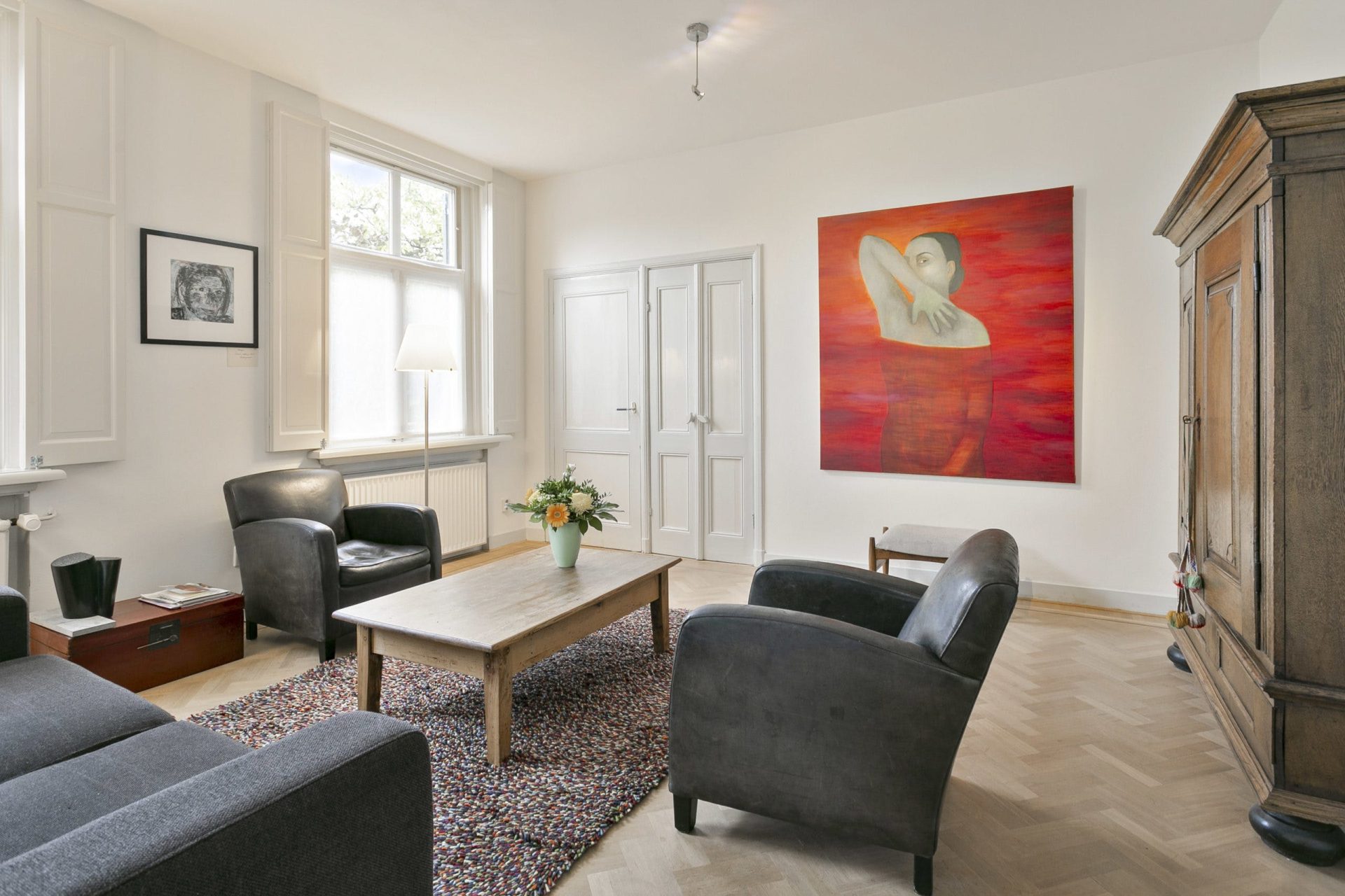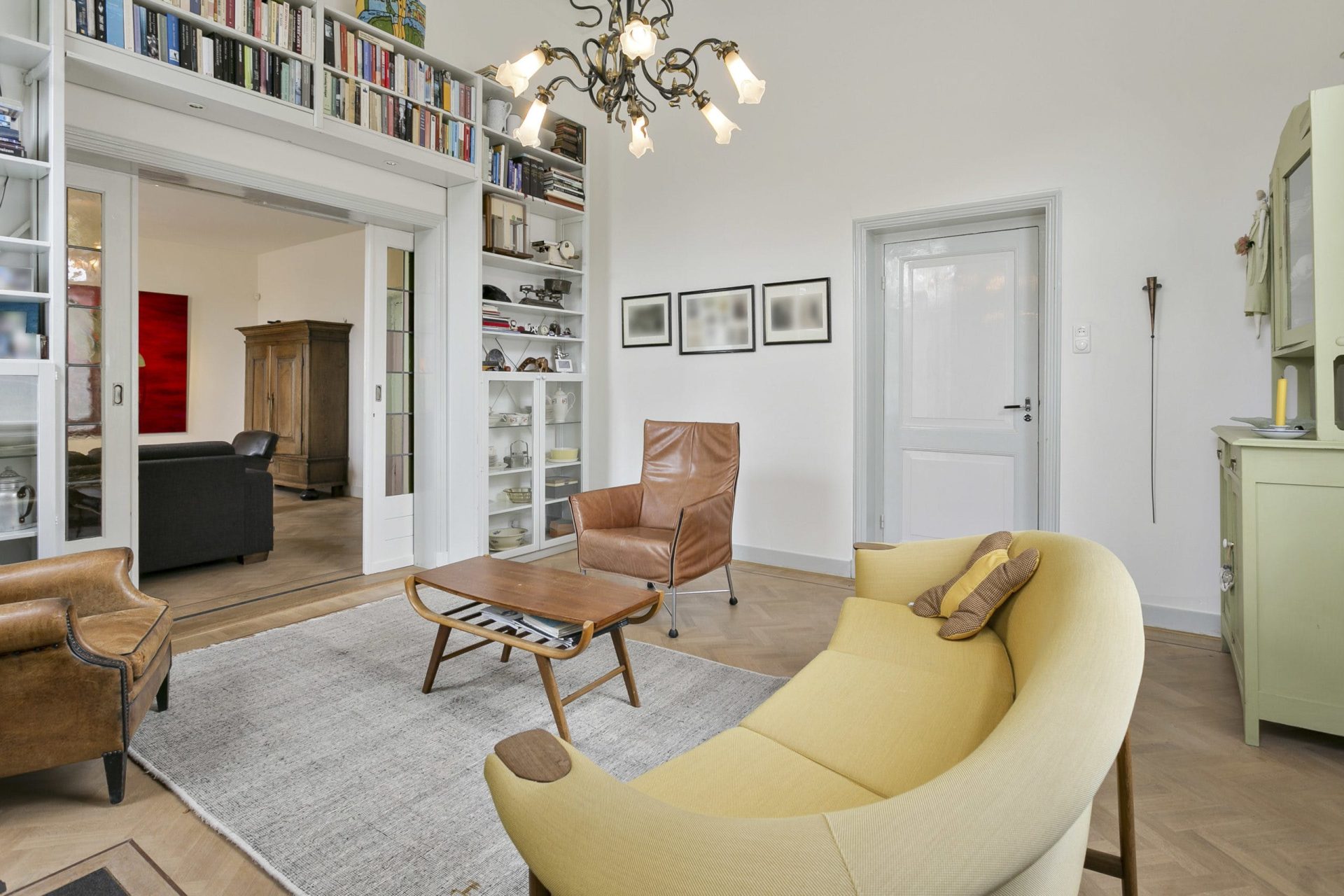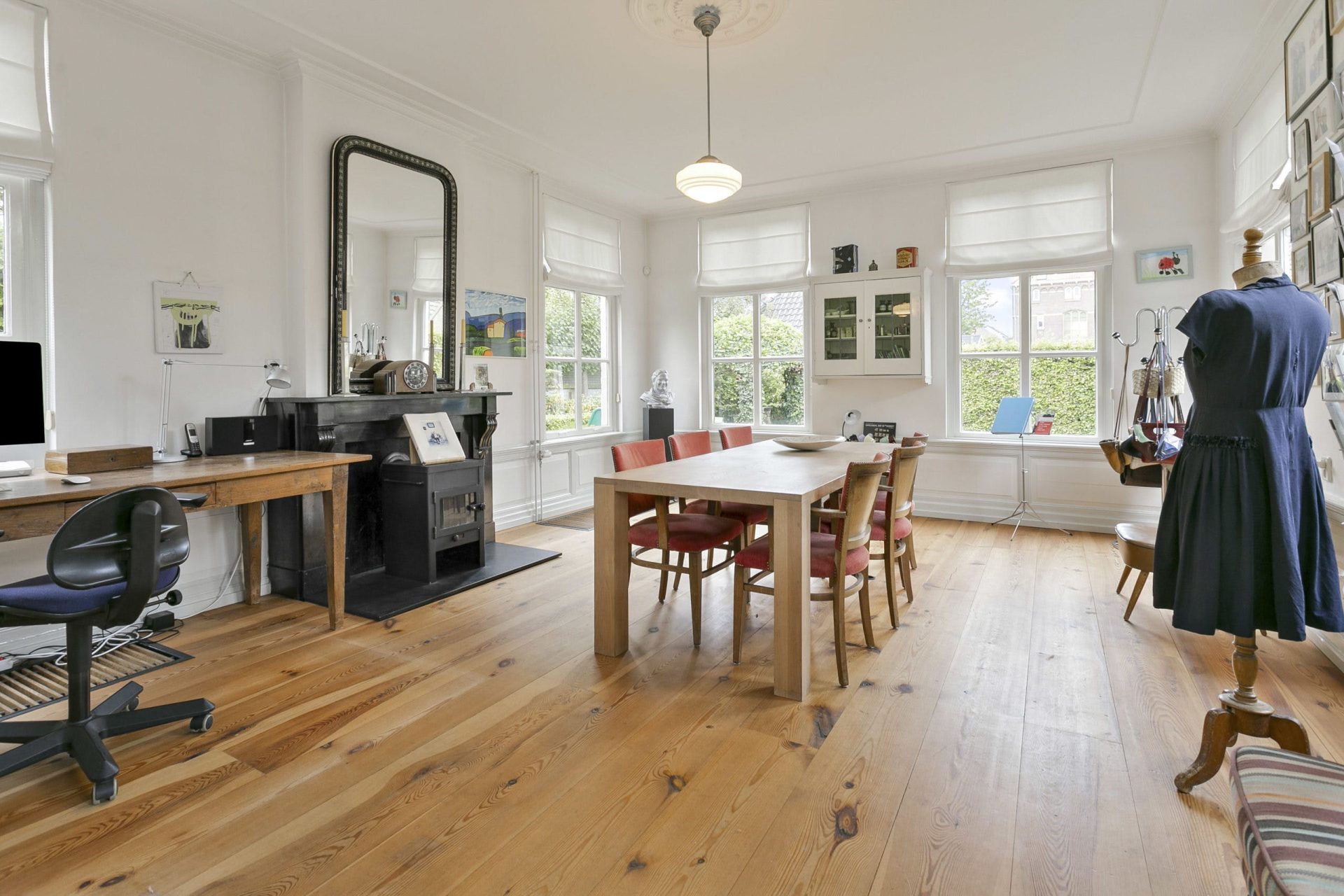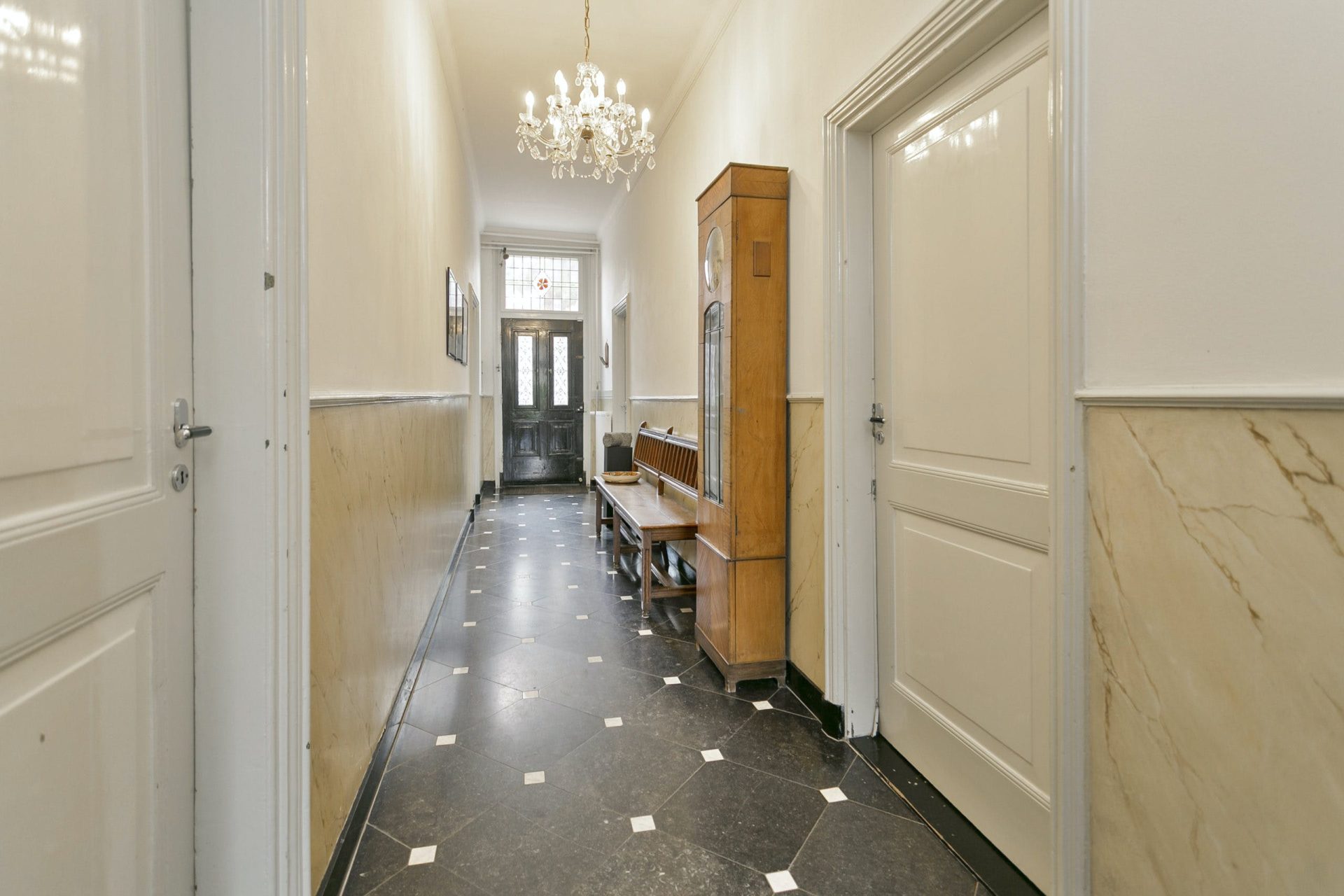 Entree naar imposante hal met natuurstenen vloer, hoog plafond, lambrisering en mooie doorkijk naar de tuin. Vanuit de hal zijn diverse vertrekken te bereiken als ook de trapopgang naar de verdieping. Aan de linkerzijde van de hal is er toegang tot een woonkamer en-suite met aan de voorzijde een zitkamer met houten visgraat parketvloer, hoog plafond met sierlijsten en een originele schouw met houtkachel. De schuifdeuren met rondom op maat gemaakte boekenkast, geven toegang tot de achterkamer met zit/tv-hoek, inbouwkast en deur naar tussenportaal. Ook in deze kamer ligt een houten visgraat parketvloer. Het tussenportaal geeft toegang tot de tuin en de eetkamer aan de achterzijde van de woning. De eetkamer is een prachtig, lichte ruimte met ramen rondom en uitzicht op de tuin. Ook hier een hoog plafond met sierlijsten, schouw met houtkachel, houten lambrisering onder de raampartijen, houten vloerdelen en een praktische trapkast.