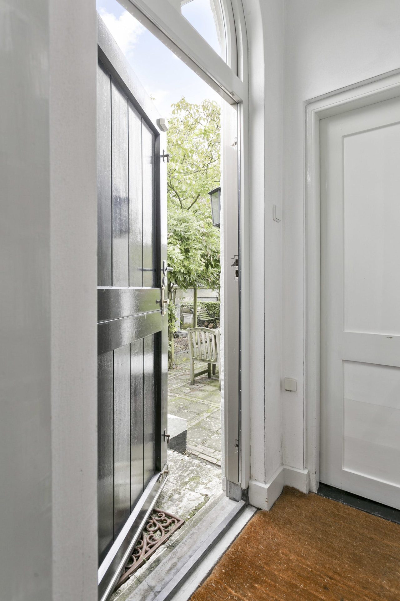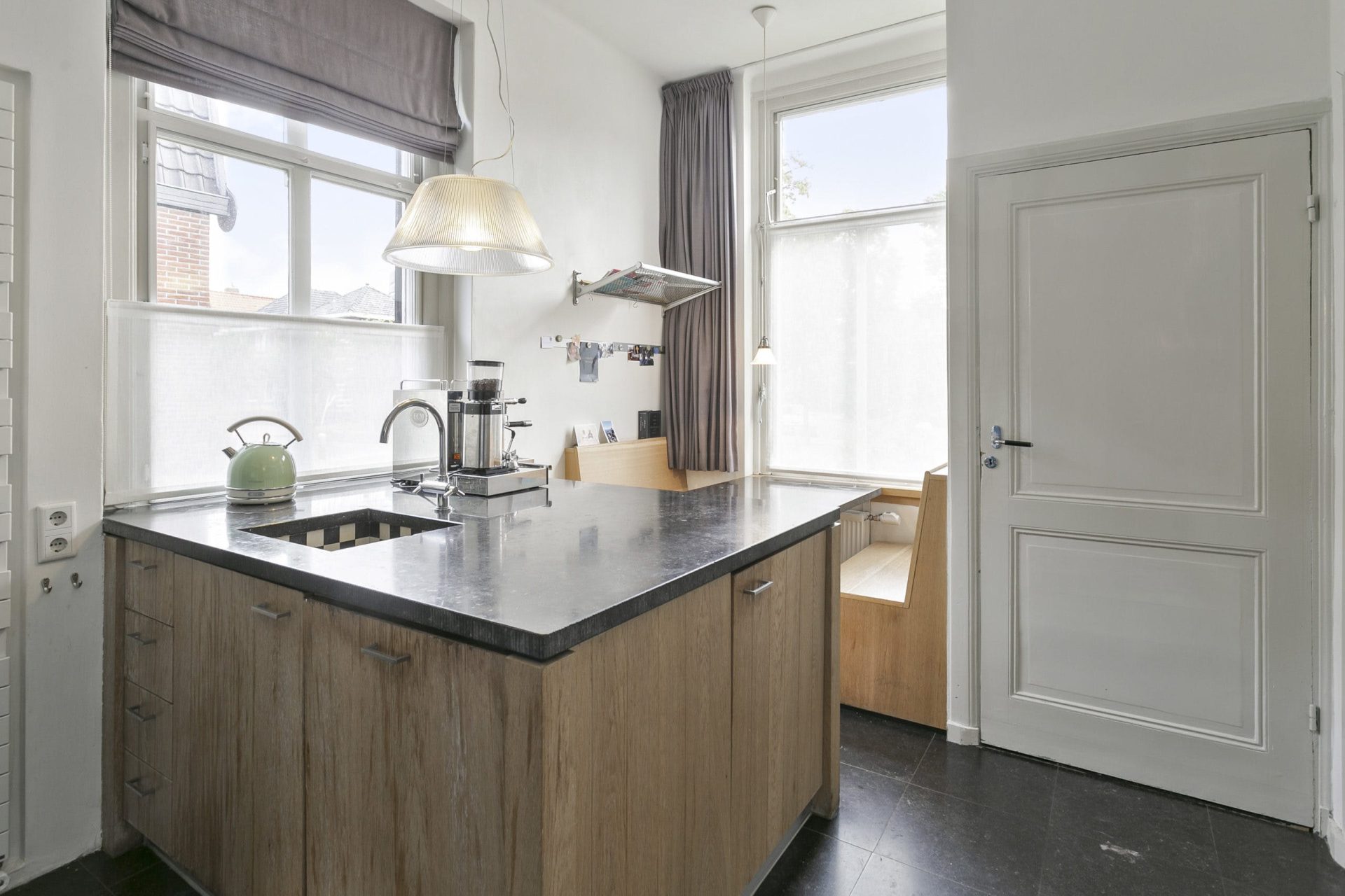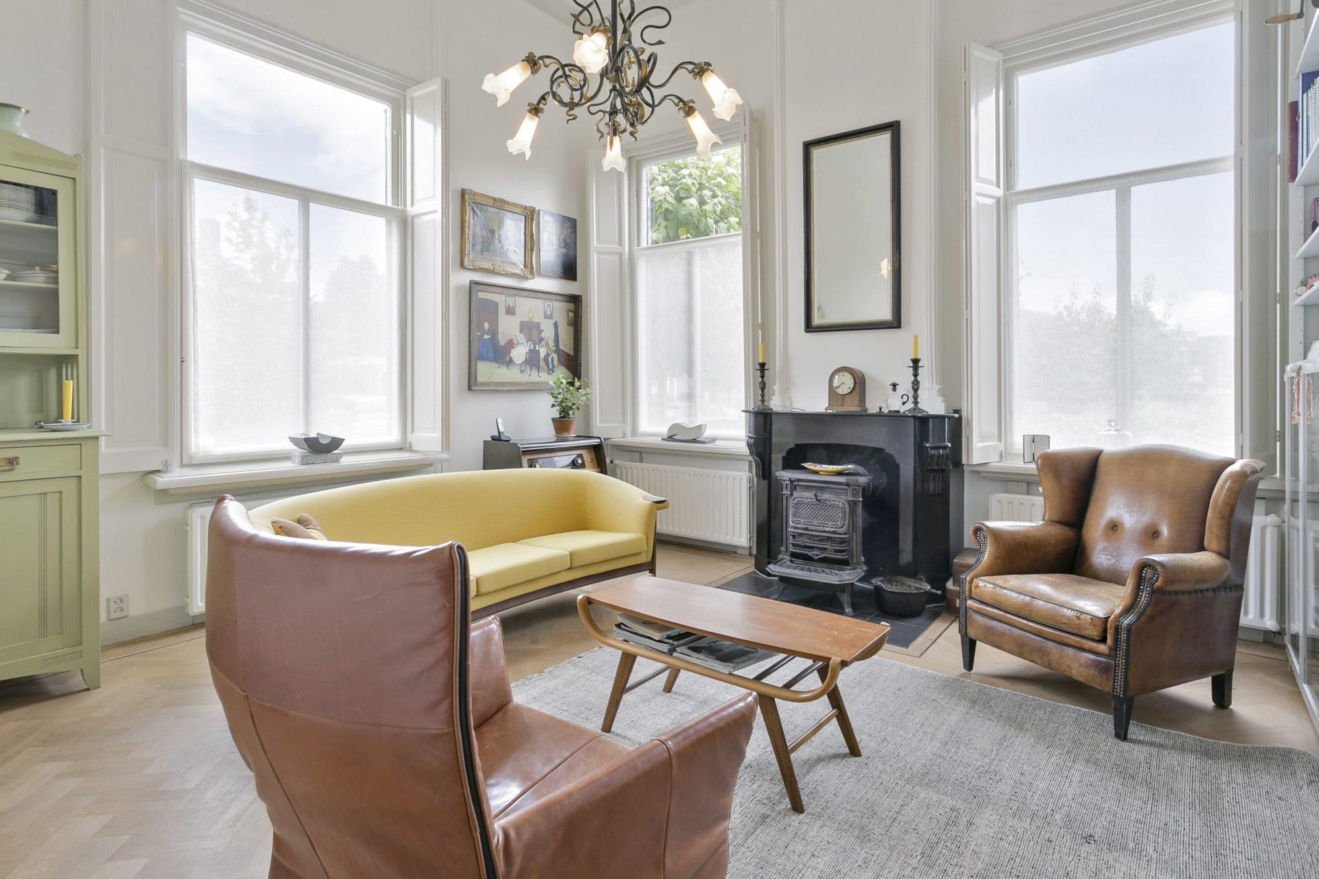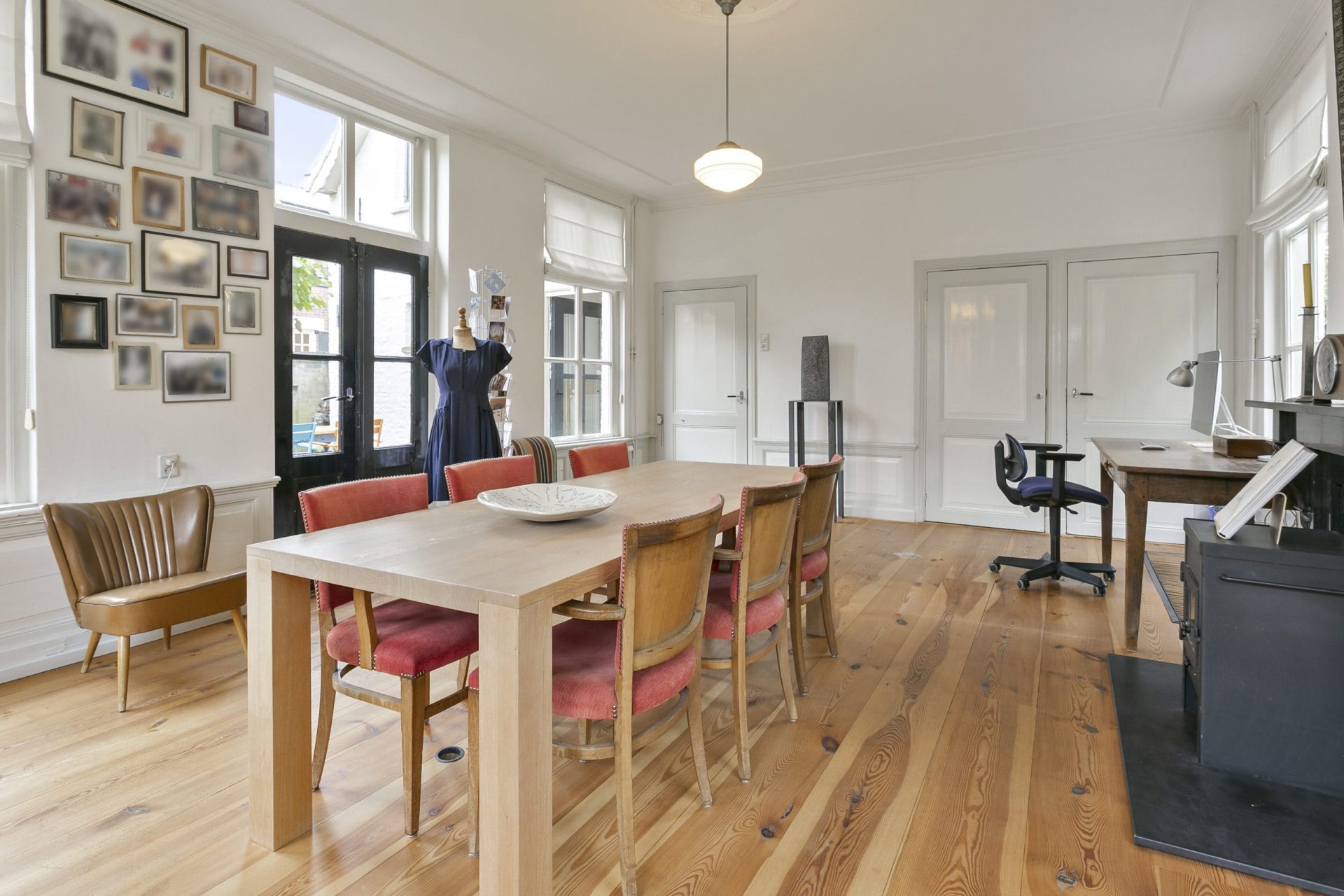Entree naar imposante hal met natuurstenen vloer, hoog plafond, lambrisering en mooie doorkijk naar de tuin. Vanuit de hal zijn diverse vertrekken te bereiken als ook de trapopgang naar de verdieping. Aan de linkerzijde van de hal is er toegang tot een woonkamer en-suite met aan de voorzijde een zitkamer met houten visgraat parketvloer, hoog plafond met sierlijsten en een originele schouw met houtkachel. De schuifdeuren met rondom op maat gemaakte boekenkast, geven toegang tot de achterkamer met zit/tv-hoek, inbouwkast en deur naar tussenportaal. Ook in deze kamer ligt een houten visgraat parketvloer. Het tussenportaal geeft toegang tot de tuin en de eetkamer aan de achterzijde van de woning. De eetkamer is een prachtig, lichte ruimte met ramen rondom en uitzicht op de tuin. Ook hier een hoog plafond met sierlijsten, schouw met houtkachel, houten lambrisering onder de raampartijen, houten vloerdelen en een praktische trapkast.