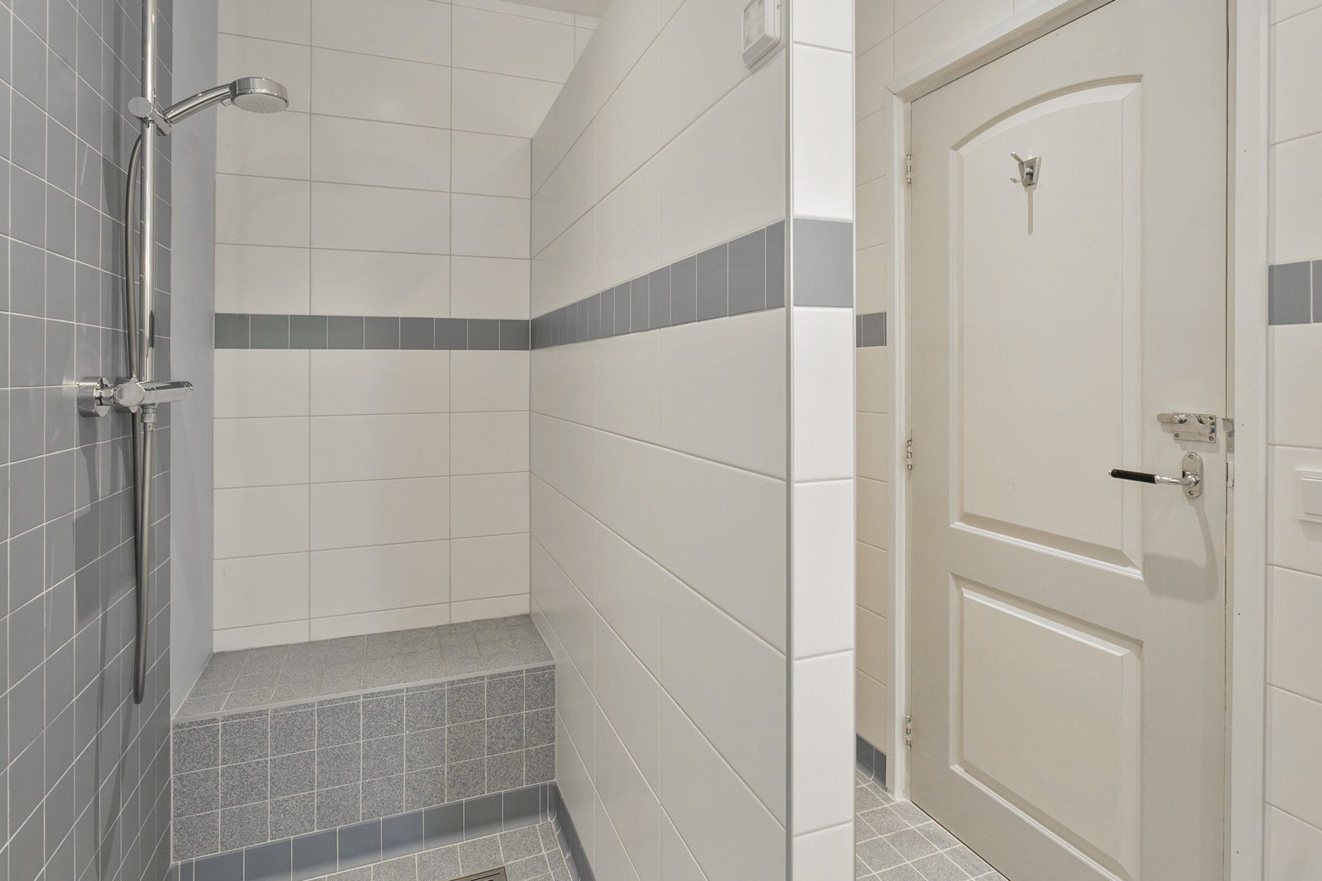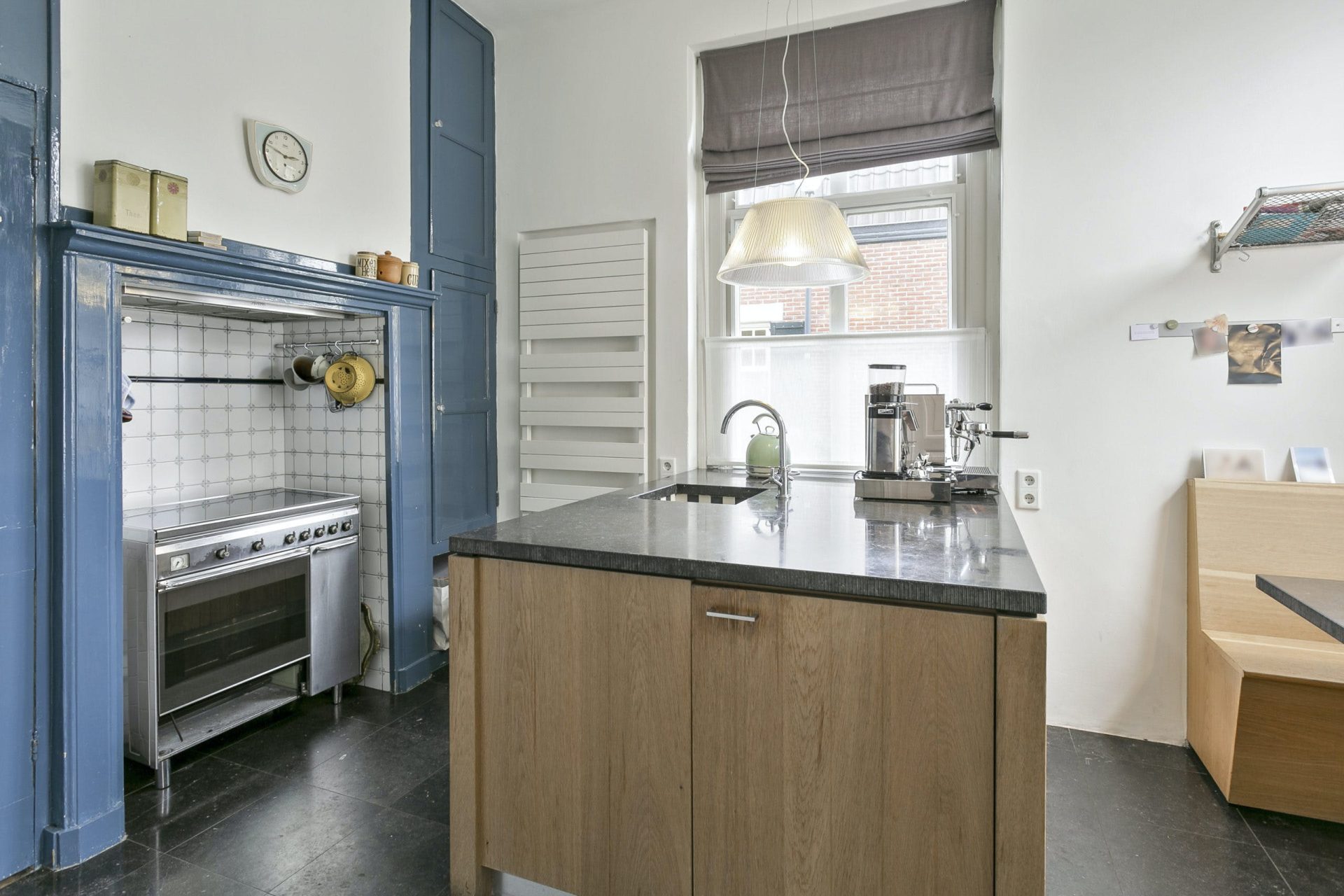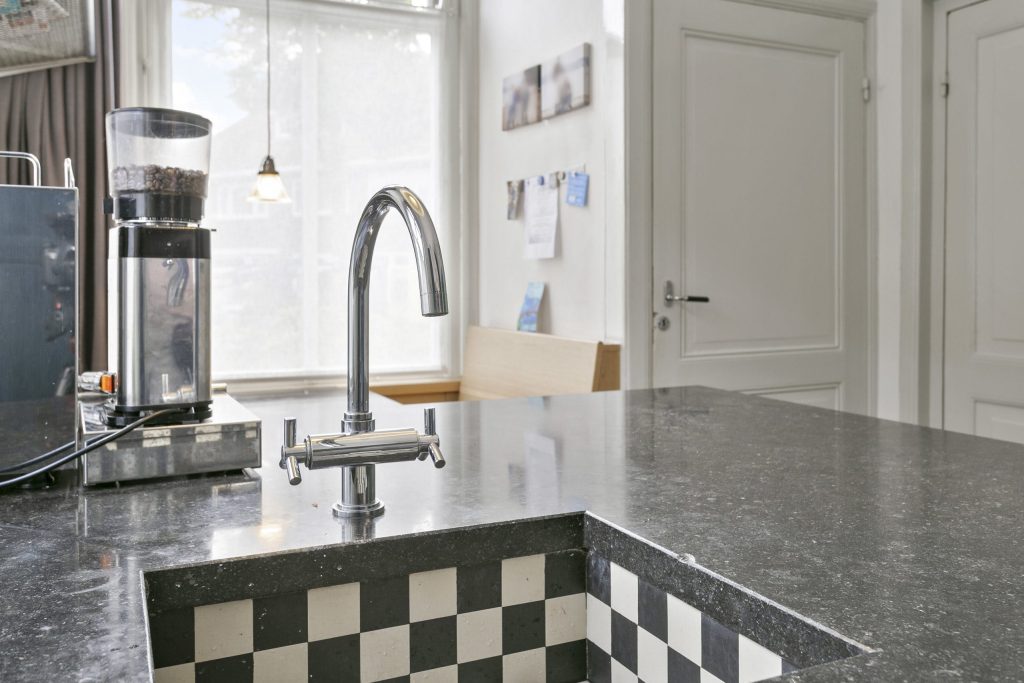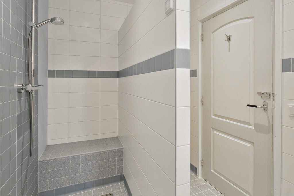 Aan de rechterzijde van de hal is er toegang tot de keuken, gelegen aan de voorzijde. De keuken heeft een op maat gemaakte zithoek aan de voorzijde en een spoeleiland in het midden met hardstenen werkblad, houten kasten, vaatwasser en koelkast. In de originele kooknis staat een fornuis met gaskookplaat en oven. Aan weerszijden van de nis zijn nog de originele inbouwkasten bewaard gebleven. Vanuit de keuken is een provisiekelder bereikbaar (hoogte 1.50) met tevens de groepenkast, gas -en watermeter. Achter de keuken is een bijkeuken met plafond, hoge inbouwkasten en opstelling wasapparatuur. Vanuit de hal is middels een toog een toiletruimte bereikbaar met wandcloset en fonteintje alsmede de badkamer. De badkamer is betegeld en voorzien van een inloopdouche en extra brede wastafel. Boven de badkamer, bijkeuken en keuken is nog een bergzolder bereikbaar, toegankelijk vanuit de toog alsmede vanaf de buitenzijde van de woning.