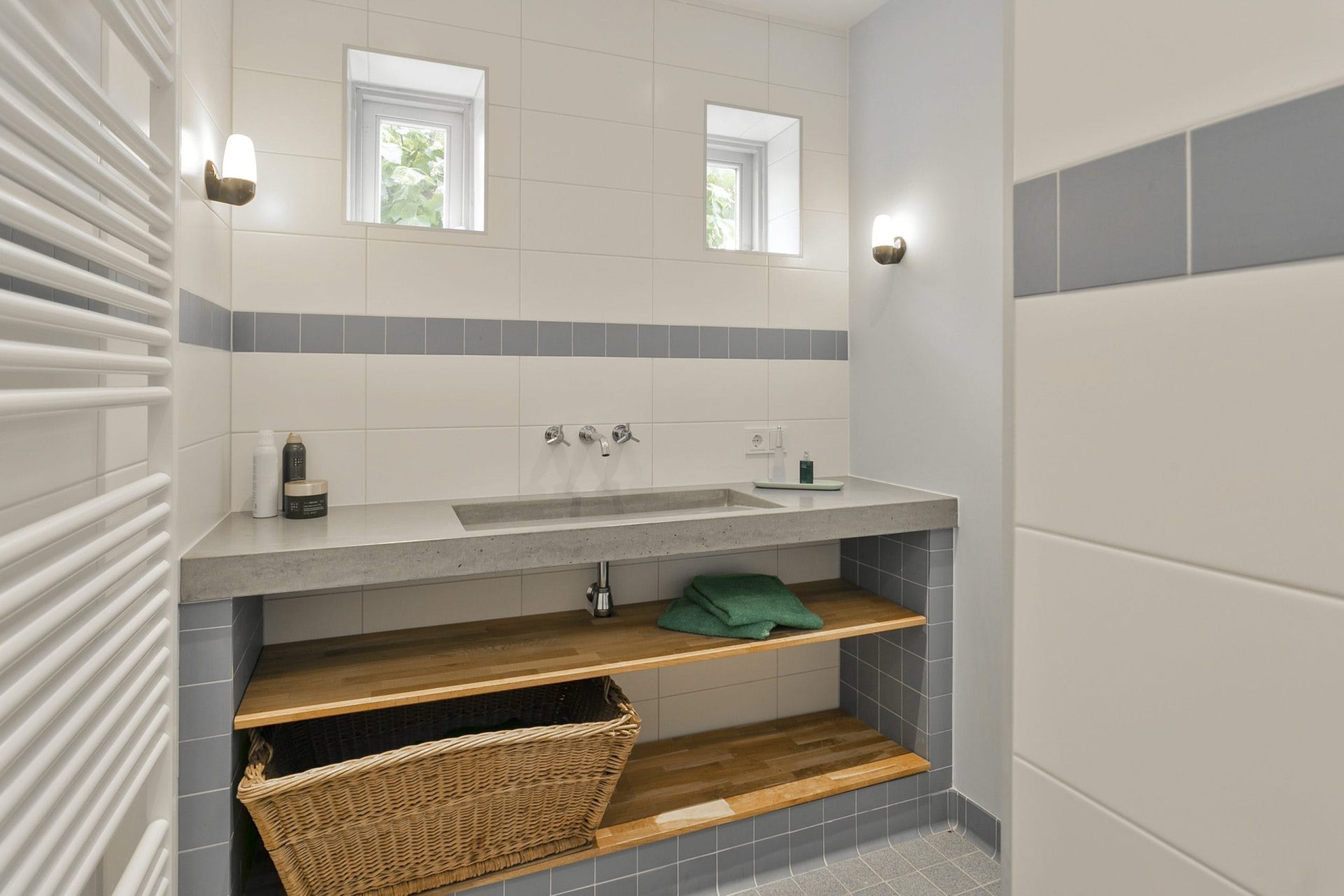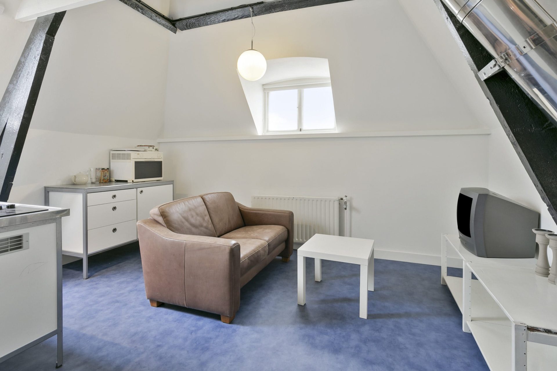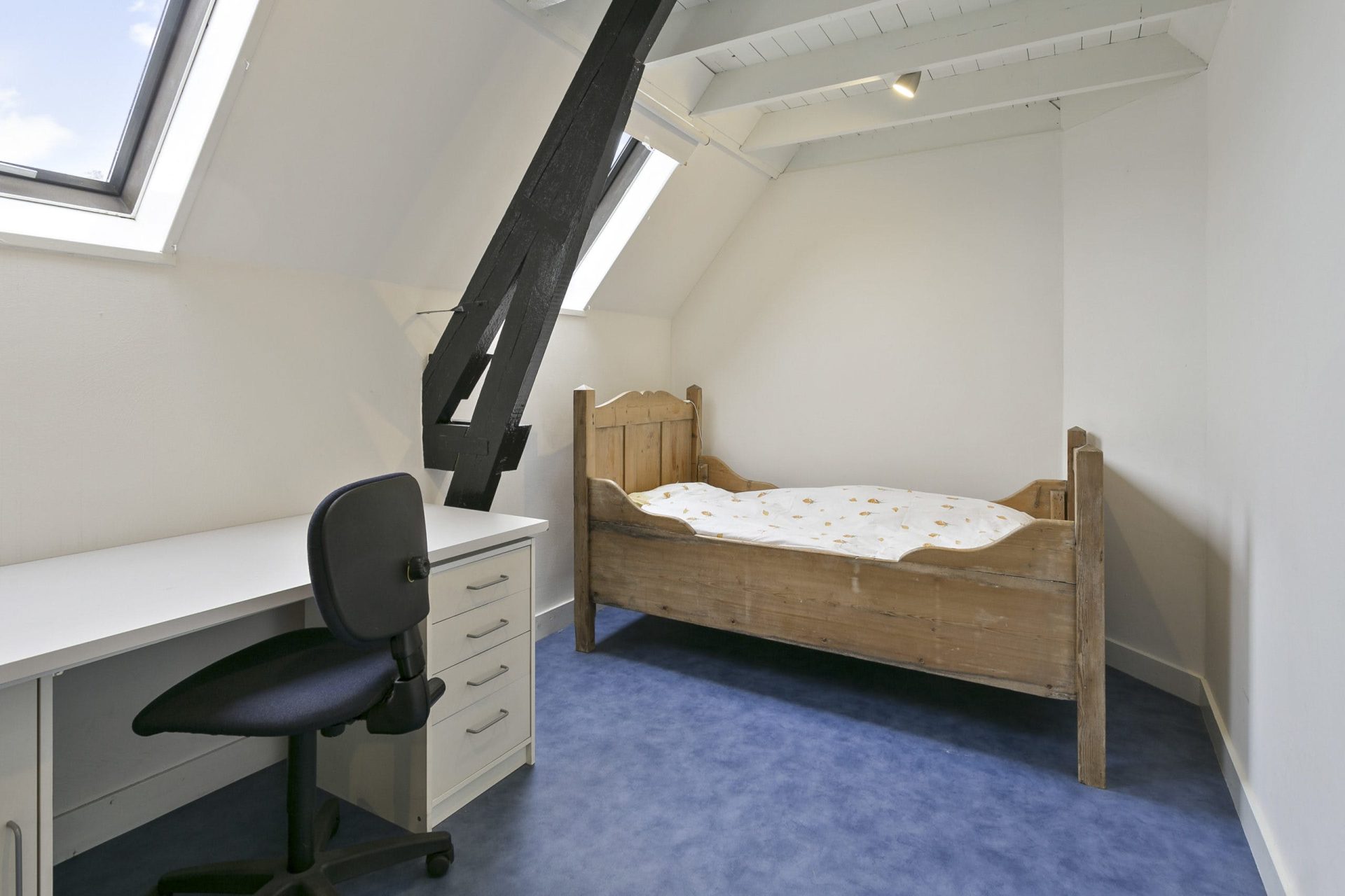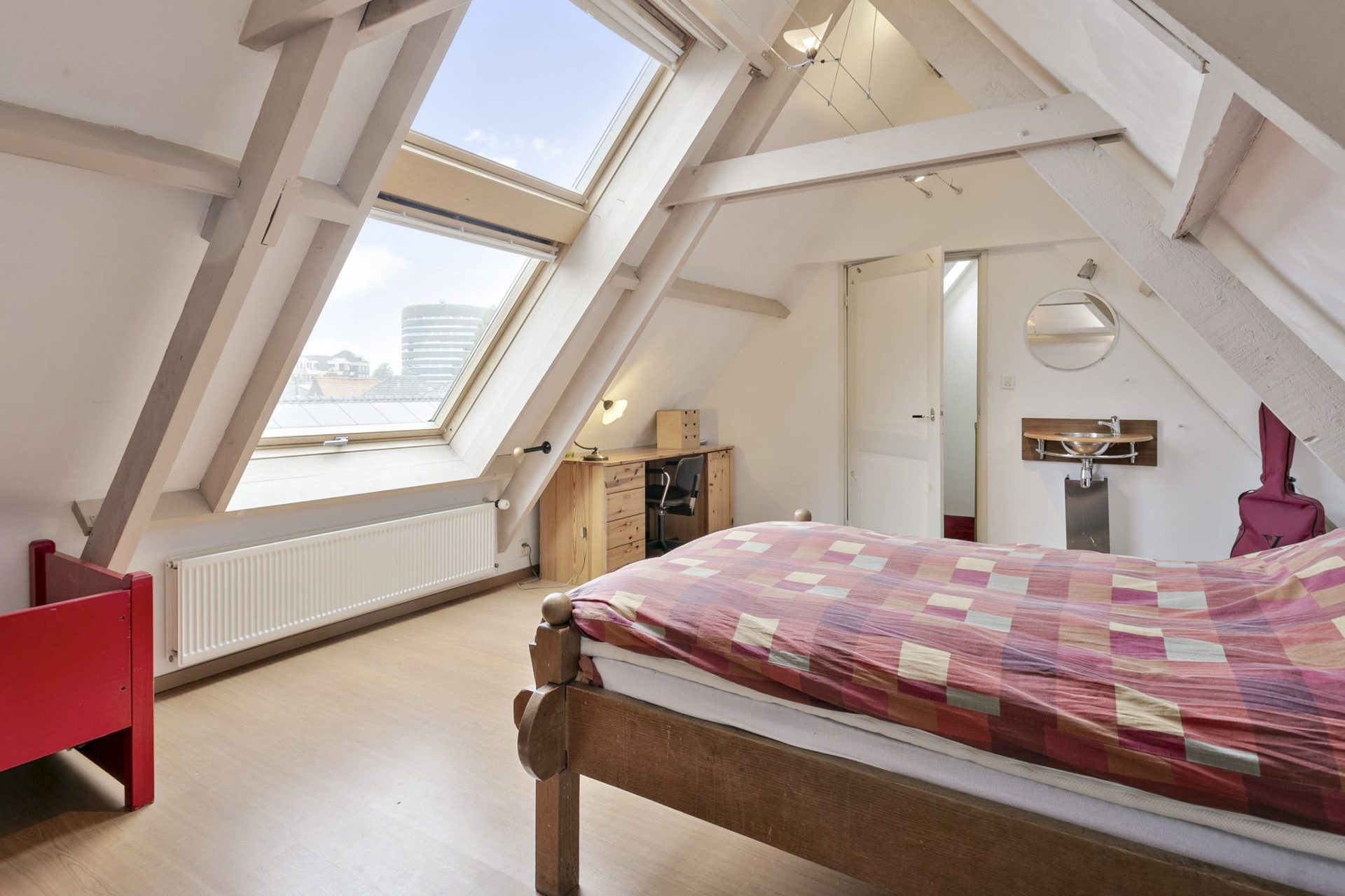 Via een trapopgang is een slaapkamer te bereiken met een dubbel dakraam en wastafel. De kamer is afgewerkt met een laminaatvloer. Ook hier is de hoge nok in het zicht gehouden.