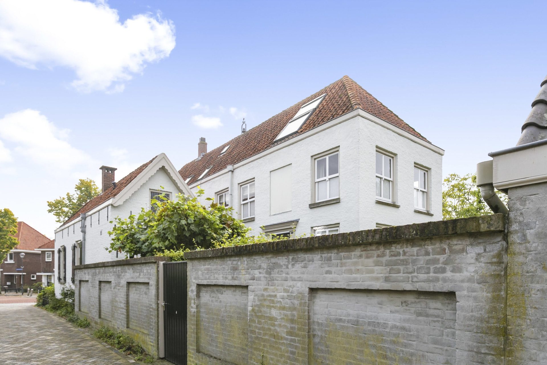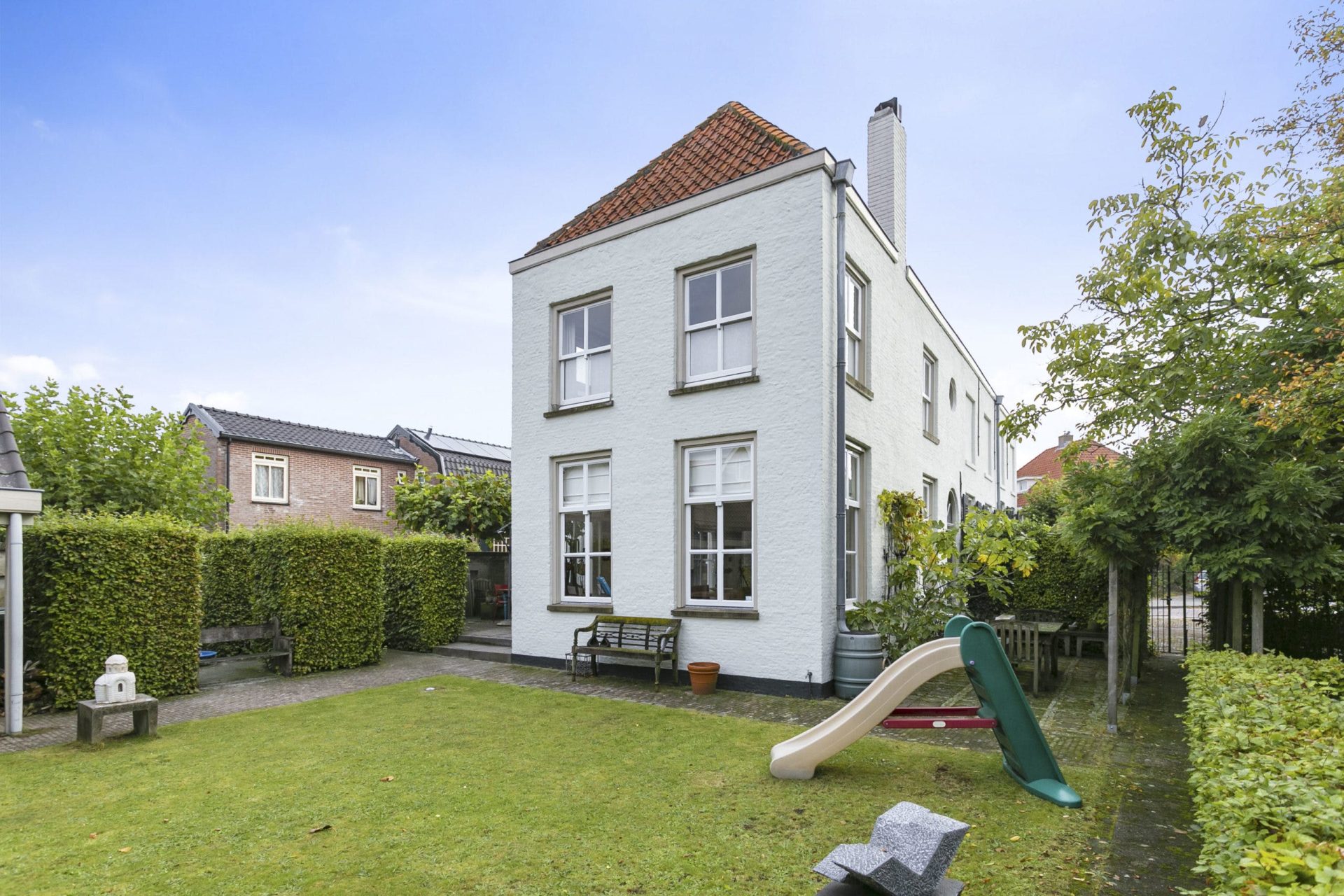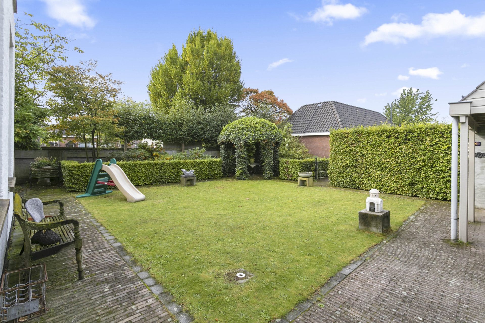 Aan de voorzijde is er naast de woning een oprit met ruimte voor 3 auto’s. Vanaf de oprit geeft een poort toegang tot de tuin, tevens is er vanuit de achter gelegen garage toegang tot de tuin alsmede aan de zijkant van de woning middels een poort. De tuin is in Engelse sfeer aangelegd met sierbestrating, gazon, borders, prieeltjes en beukenhagen en ommuurd met een Vughtse tuinmuur met zogeheten ‘spiegels’. De vrijstaande, stenen garage met geïsoleerde wanden en vloer, heeft een bergvliering, een loopdeur en dubbele openslaande deuren naar achtergelegen binnenterrein.