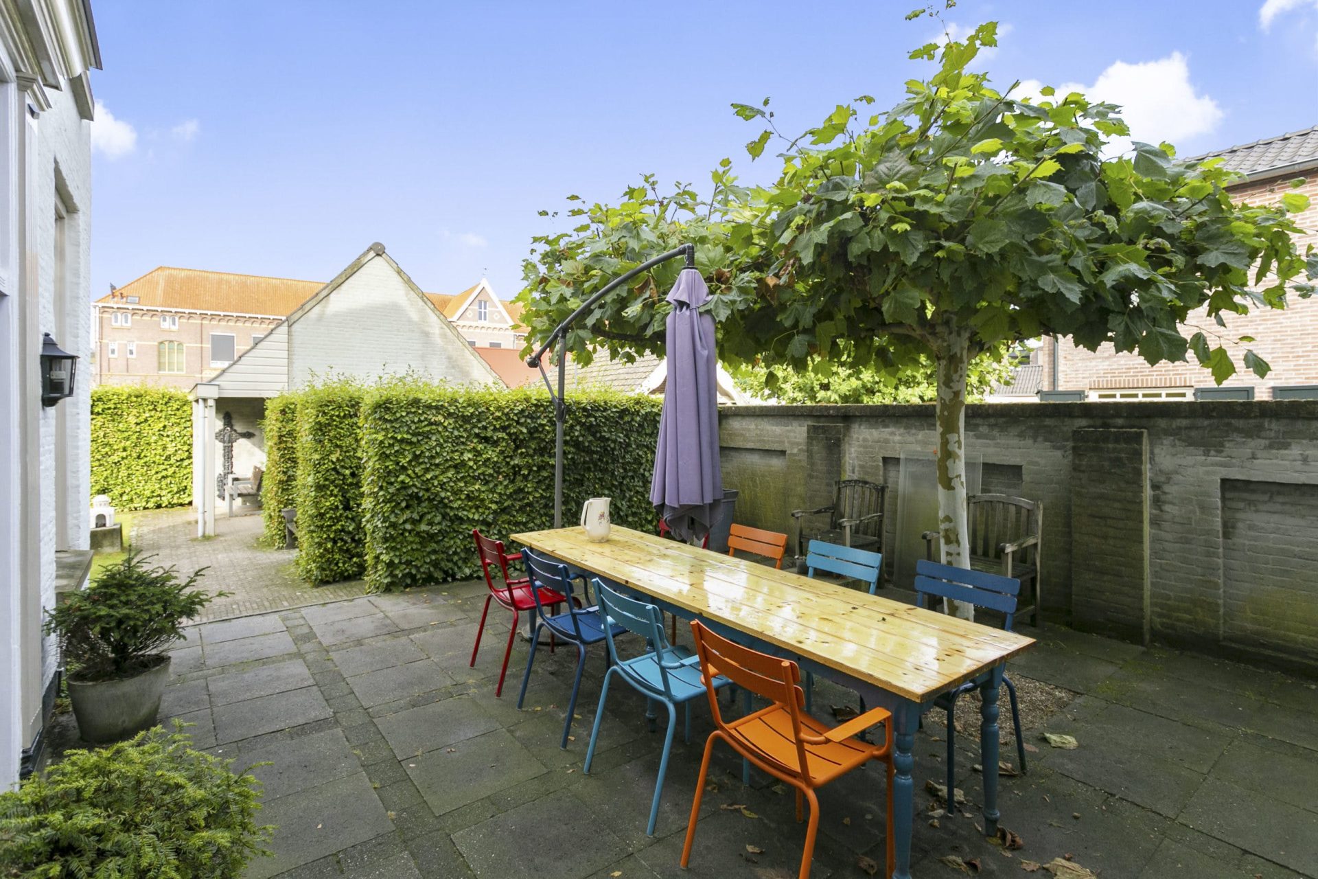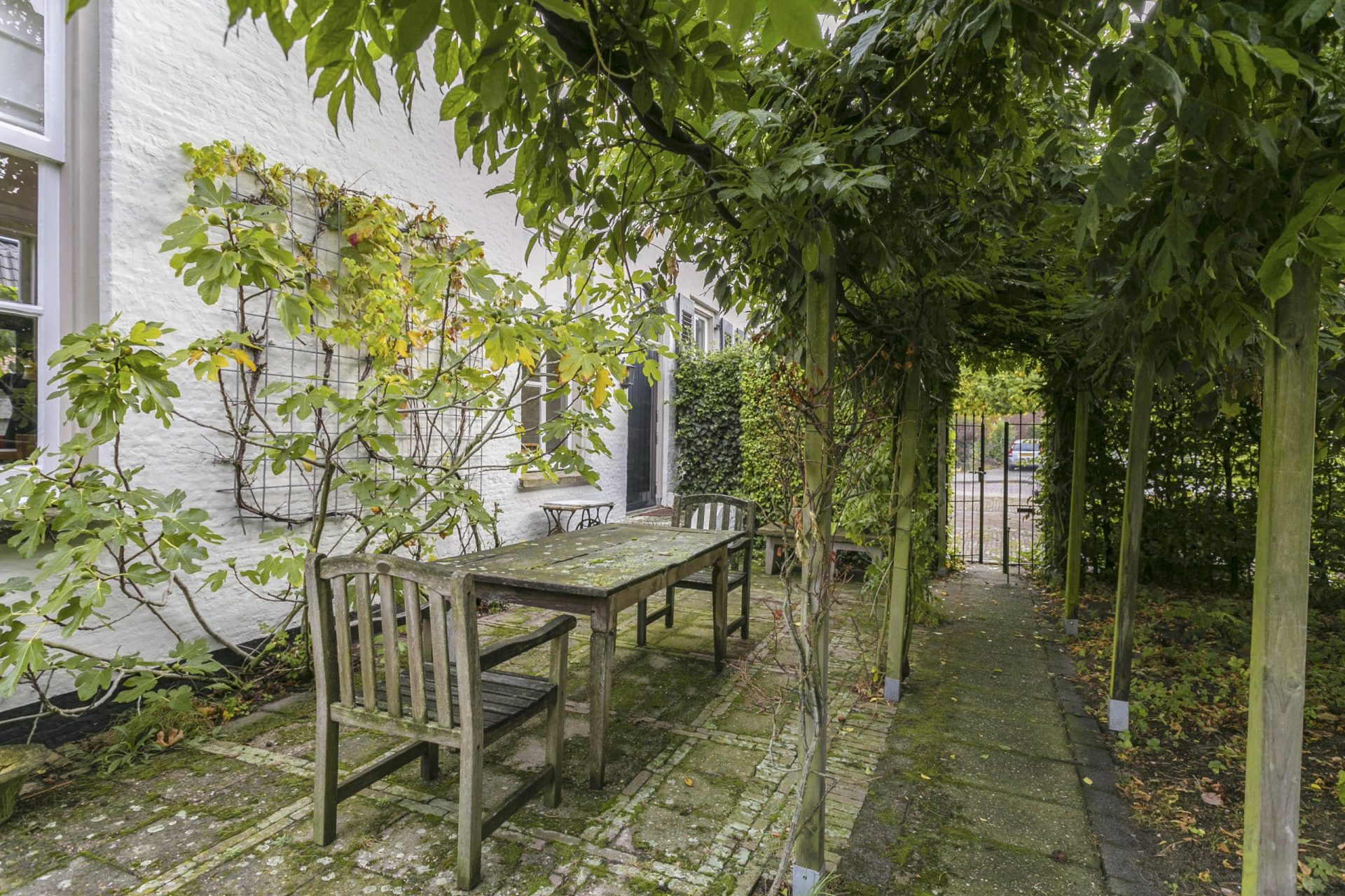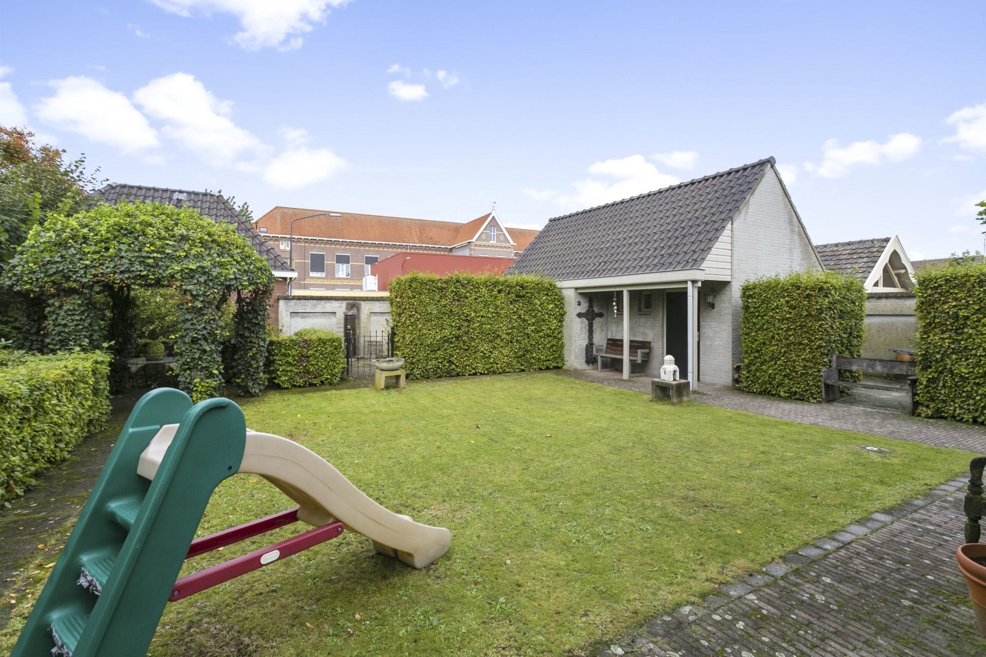 Aan de voorzijde is er naast de woning een oprit met ruimte voor 3 auto’s. Vanaf de oprit geeft een poort toegang tot de tuin, tevens is er vanuit de achter gelegen garage toegang tot de tuin alsmede aan de zijkant van de woning middels een poort. De tuin is in Engelse sfeer aangelegd met sierbestrating, gazon, borders, prieeltjes en beukenhagen en ommuurd met een Vughtse tuinmuur met zogeheten ‘spiegels’. De vrijstaande, stenen garage met geïsoleerde wanden en vloer, heeft een bergvliering, een loopdeur en dubbele openslaande deuren naar achtergelegen binnenterrein.