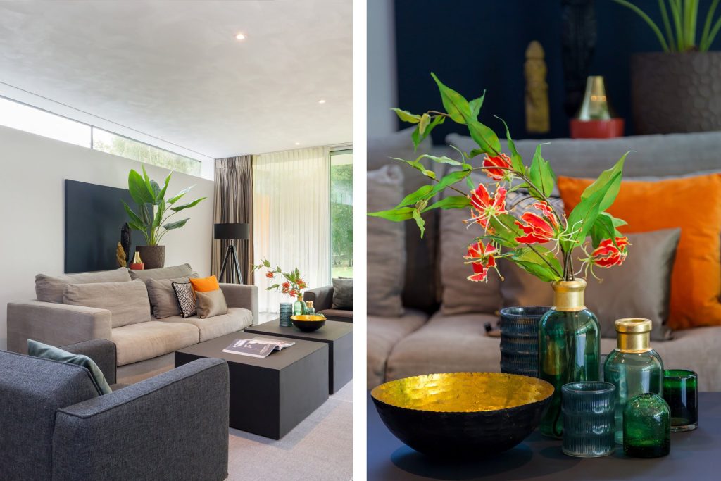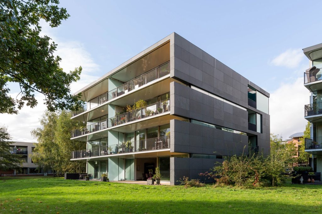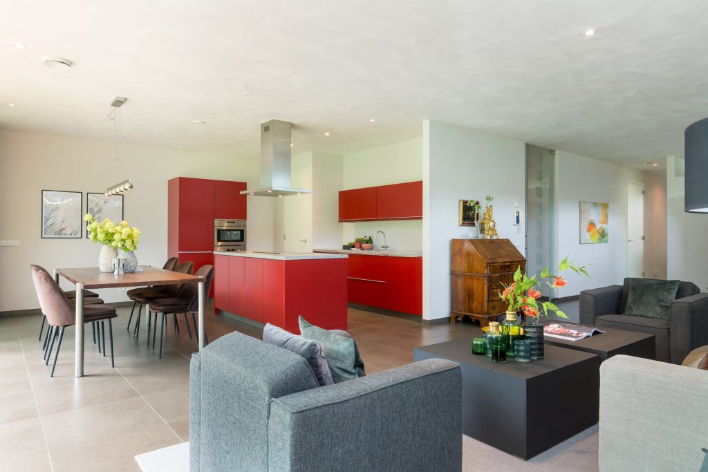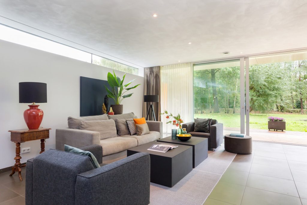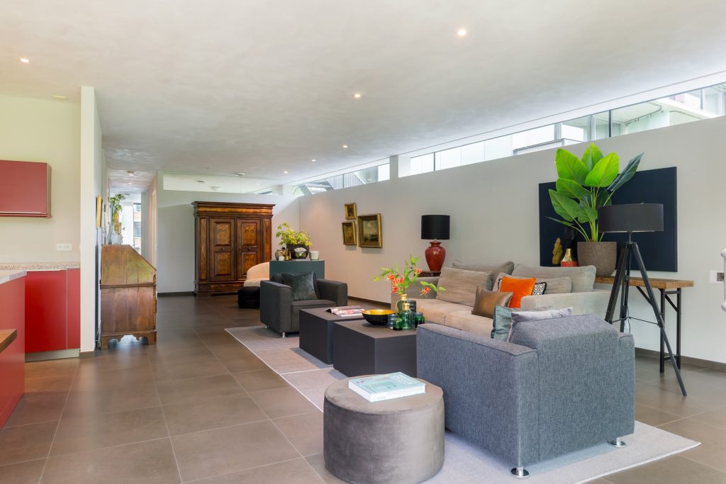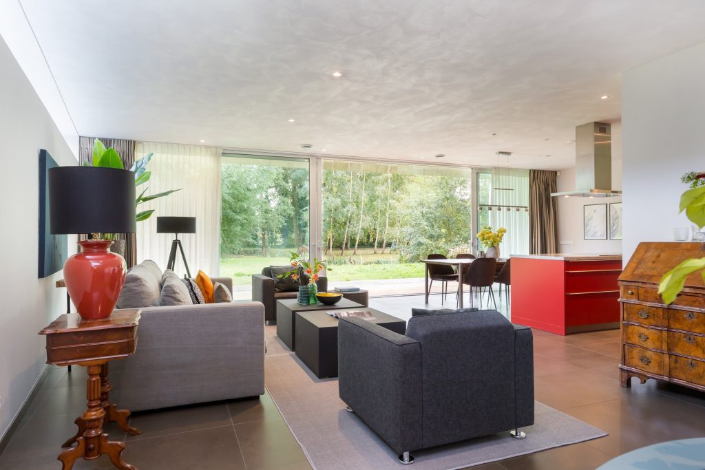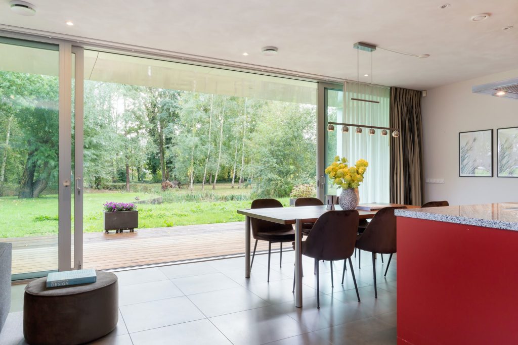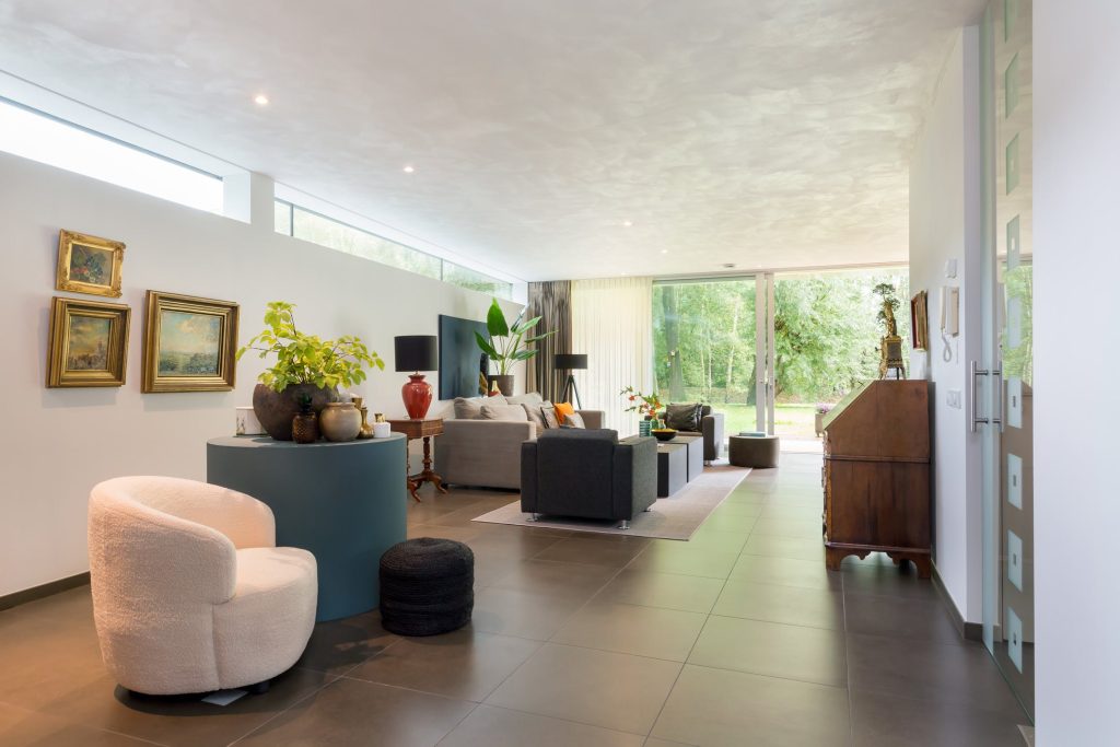 De L-vormige woonkamer met open keuken is een zeer lichte leefruimte met een dubbele schuifpui naar het terras en prachtig uitzicht naar het park. De horizontale ramen over een lengte van bijna 9 meter zorgen voor mooi lichtinval en onder de plavuizen vloer ligt behaaglijke vloerverwarming.