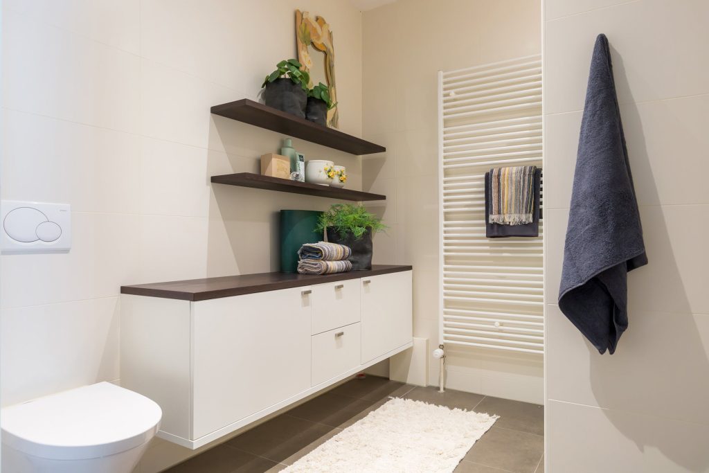 De badkamer is ingedeeld met een inloopdouche, handdoekenradiator, bergmeubel, een wastafelmeubel met spiegelkast en een tweede toilet. Naast de badkamer is een aparte wasruimte/berging met een wastafel en ruim voldoende plek voor de wasapparatuur.