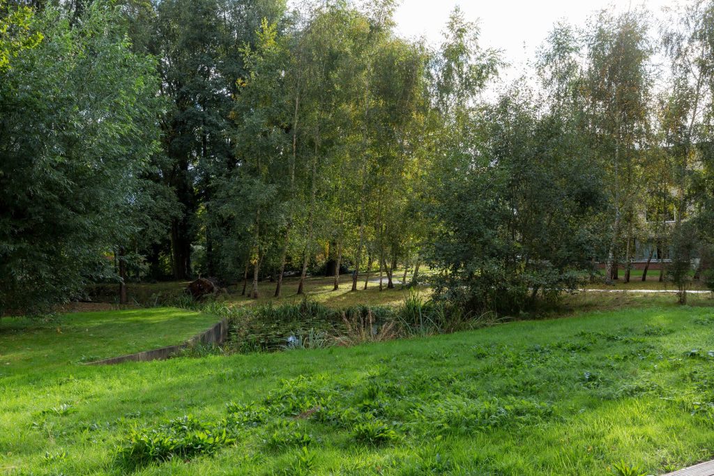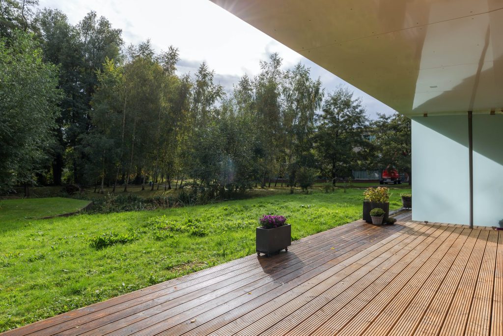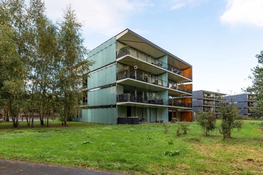 Via een van de schuifpuien heeft u toegang tot het meer dan 9 meter brede, deels overdekte terras op het zuiden. De hardhouten terrasplanken met antislip profiel geven het terras een mooie uitstraling en het uitzicht naar het park met hoge bomen zijn een van de redenen dat de appartementen op deze locatie heel gewild zijn.