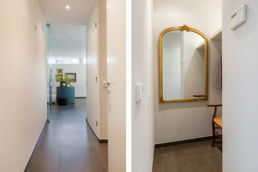 Het appartement heeft een uitnodigende, lichte hal met een glazen deur naar de woonkamer en een garderobenis, om de hoek van de meterkast. Naast de garderobenis is de moderne toiletruimte met een wandcloset en fonteintje die, net als de rest van het appartement, in een uitstekende staat verkeert.