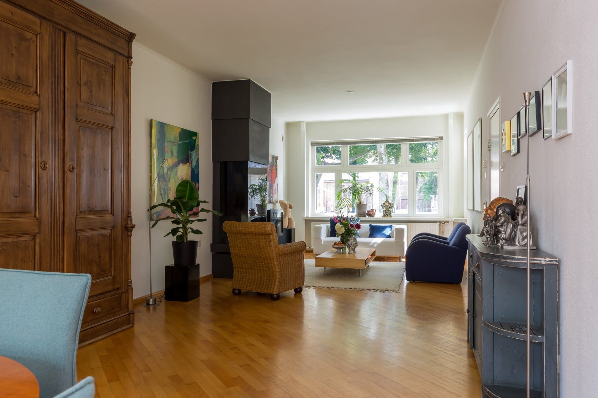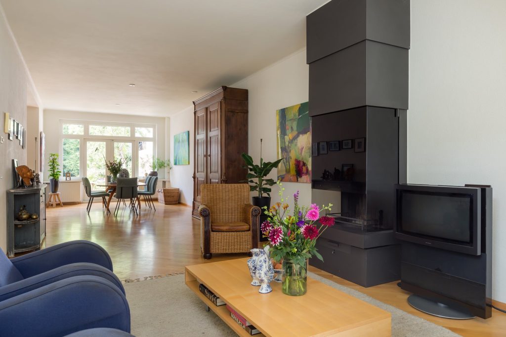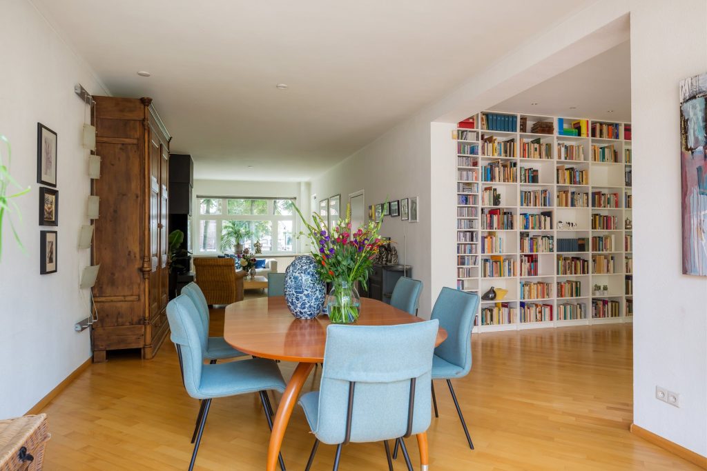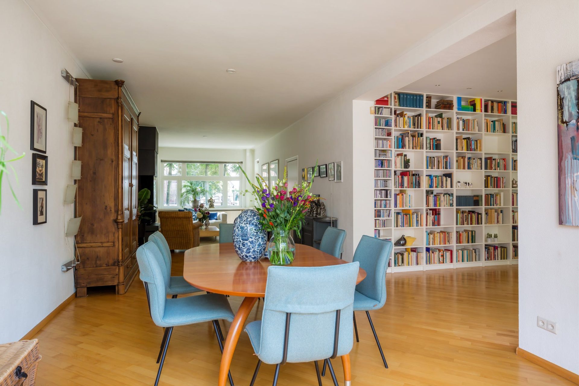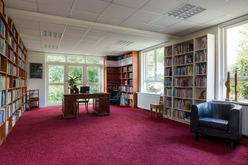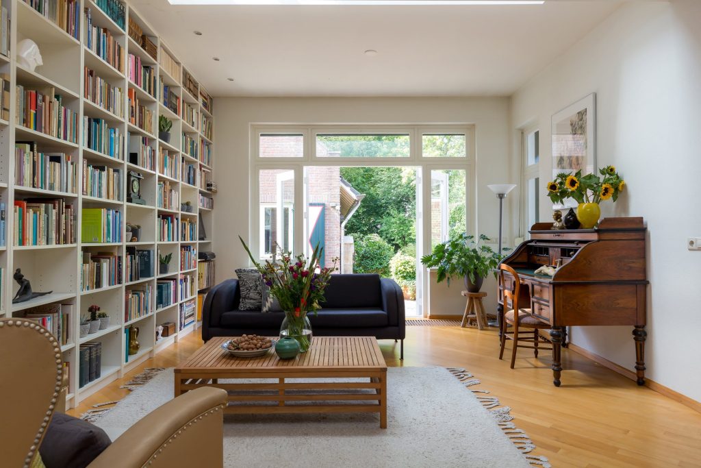 Aan de woonkamer (13,25 m x 3,85 m), met uitzicht op de Vrijthof en die loopt van de voor- tot aan de achterkant van het woonhuis met o.a. een glazen open haard, is een bibliotheek (5,90 m x 4,30 m) geschakeld. Er ligt parket, en door de gestuukte plafonds heeft het een strak uiterlijk.