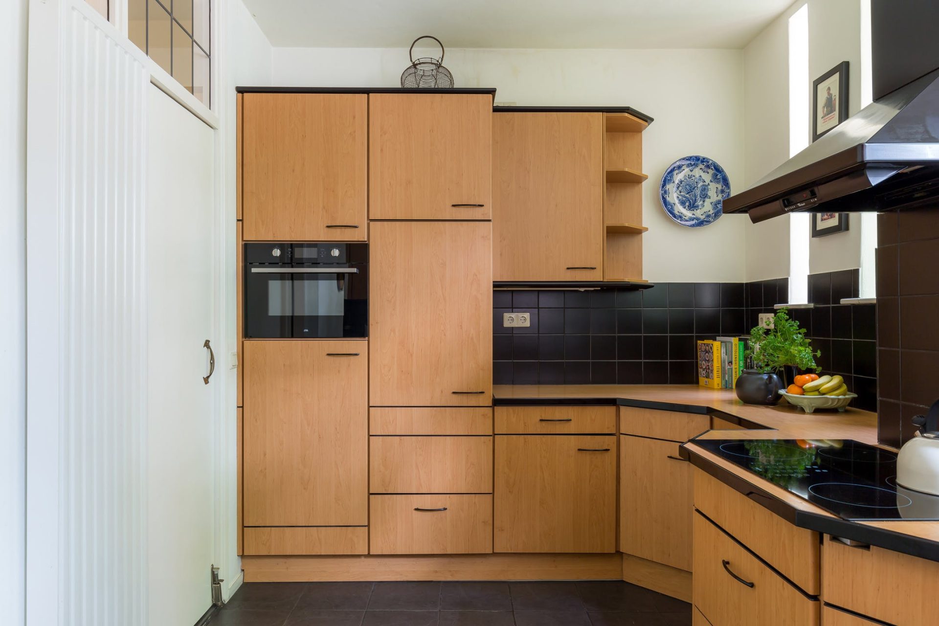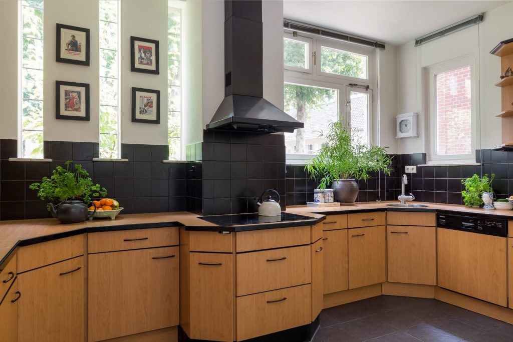 De keuken (4,50 m x 2,80 m) ligt aan de voorkant van het huis en is adequaat ingericht met een ingebouwde ijskast, diepvries, oven/magnetron, afwasmachine, een inductiekookplaat met afzuigkap, en veel aanrecht. Het aanrechtblad heeft een oppervlakte van 2,4 m² en een totaallengte van 4,5 m. De oorspronkelijke glas-in-lood ramen (nu in dubbel glas gezet) zijn nog aanwezig.