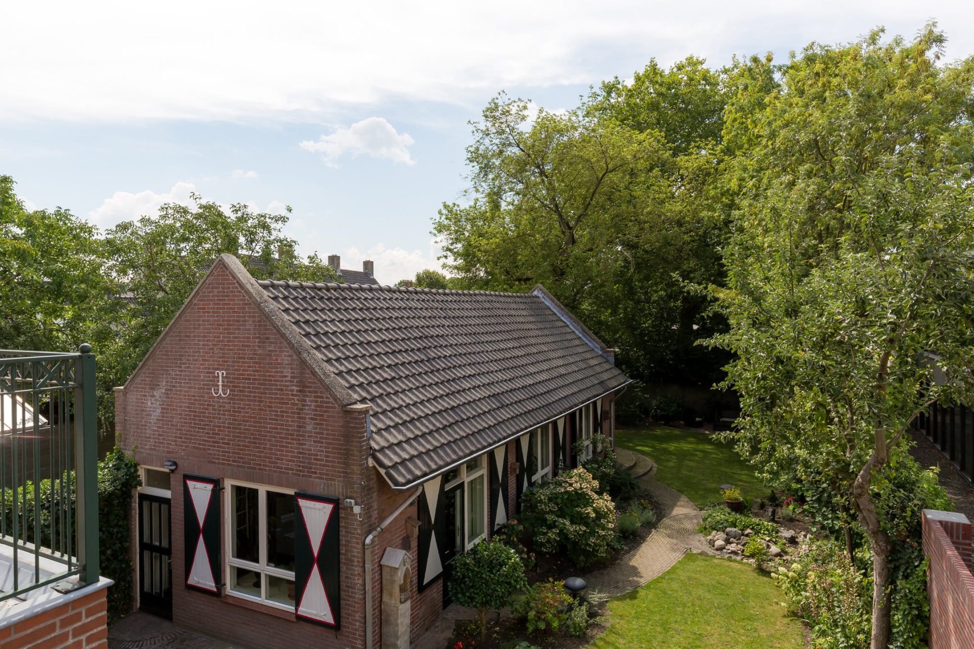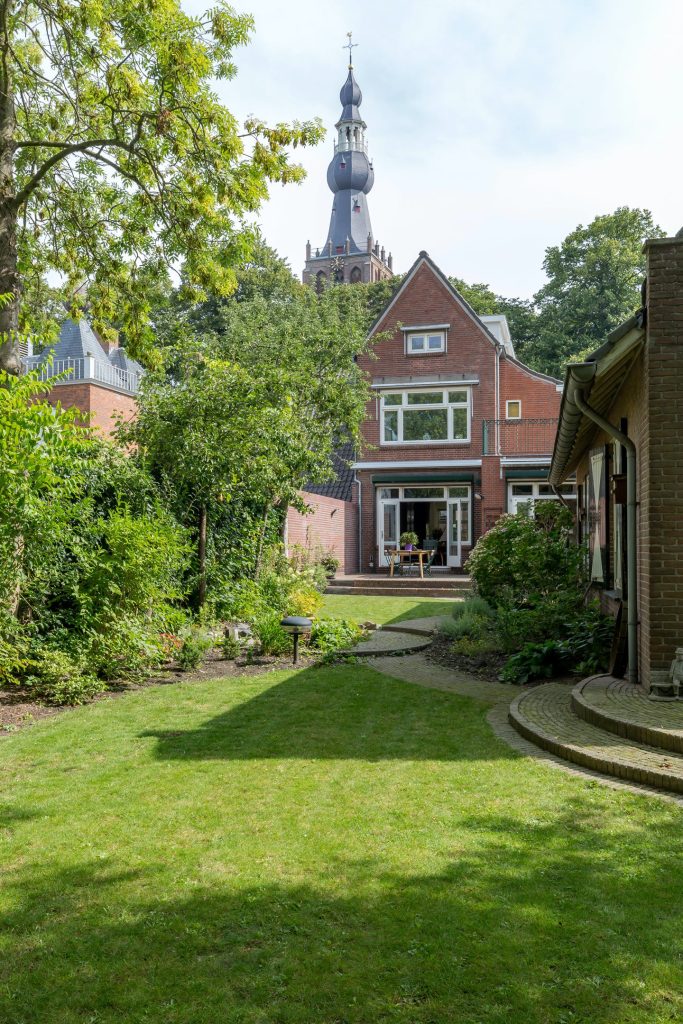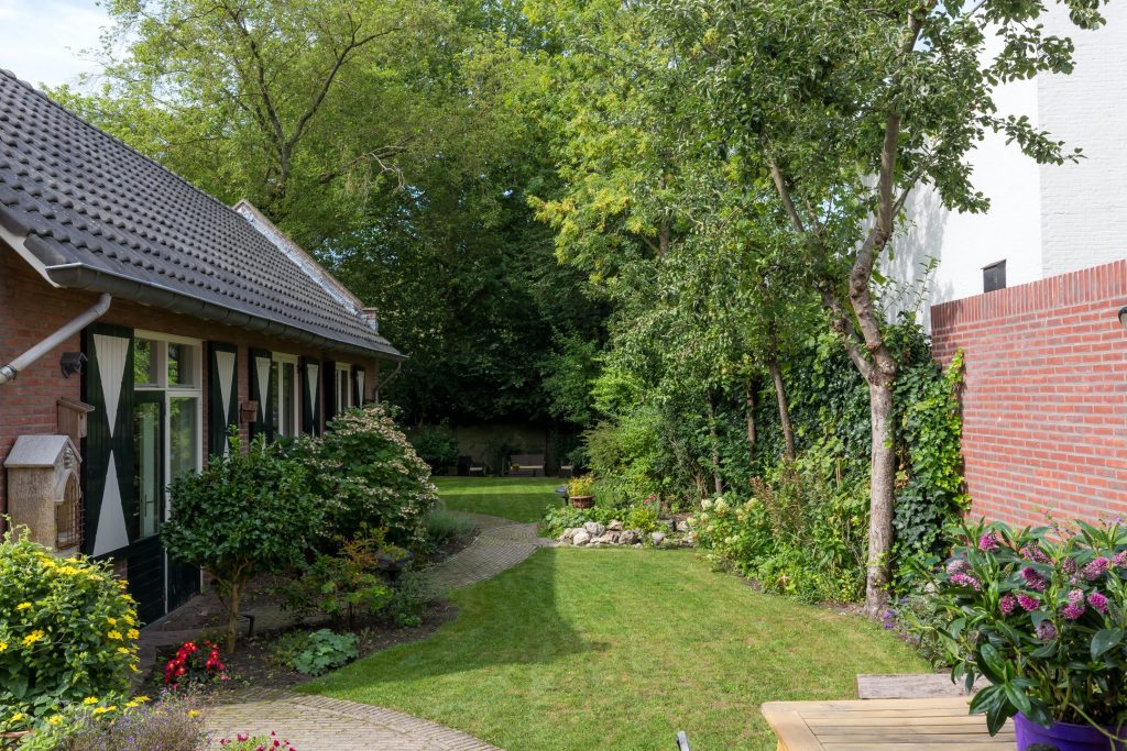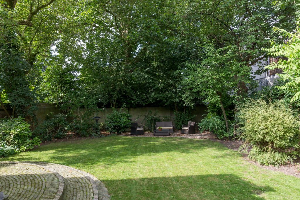 De tuin ligt op het zuidwesten en is ruim 45 meter diep en 10 meter breed. Hoge muren begroeid met klimop en bomen ontnemen het zicht op de belendende panden. U heeft op het ruime terras en in de tuin volledige privacy.