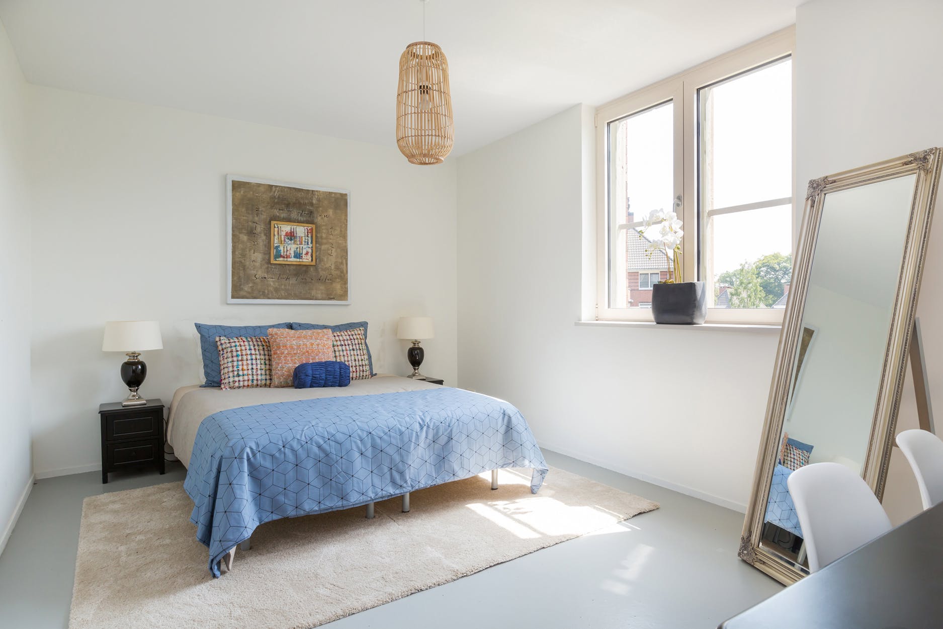Aan weerszijden van de woonkamer liggen de twee nagenoeg identieke slaapkamers van ieder ruim 16 m2.