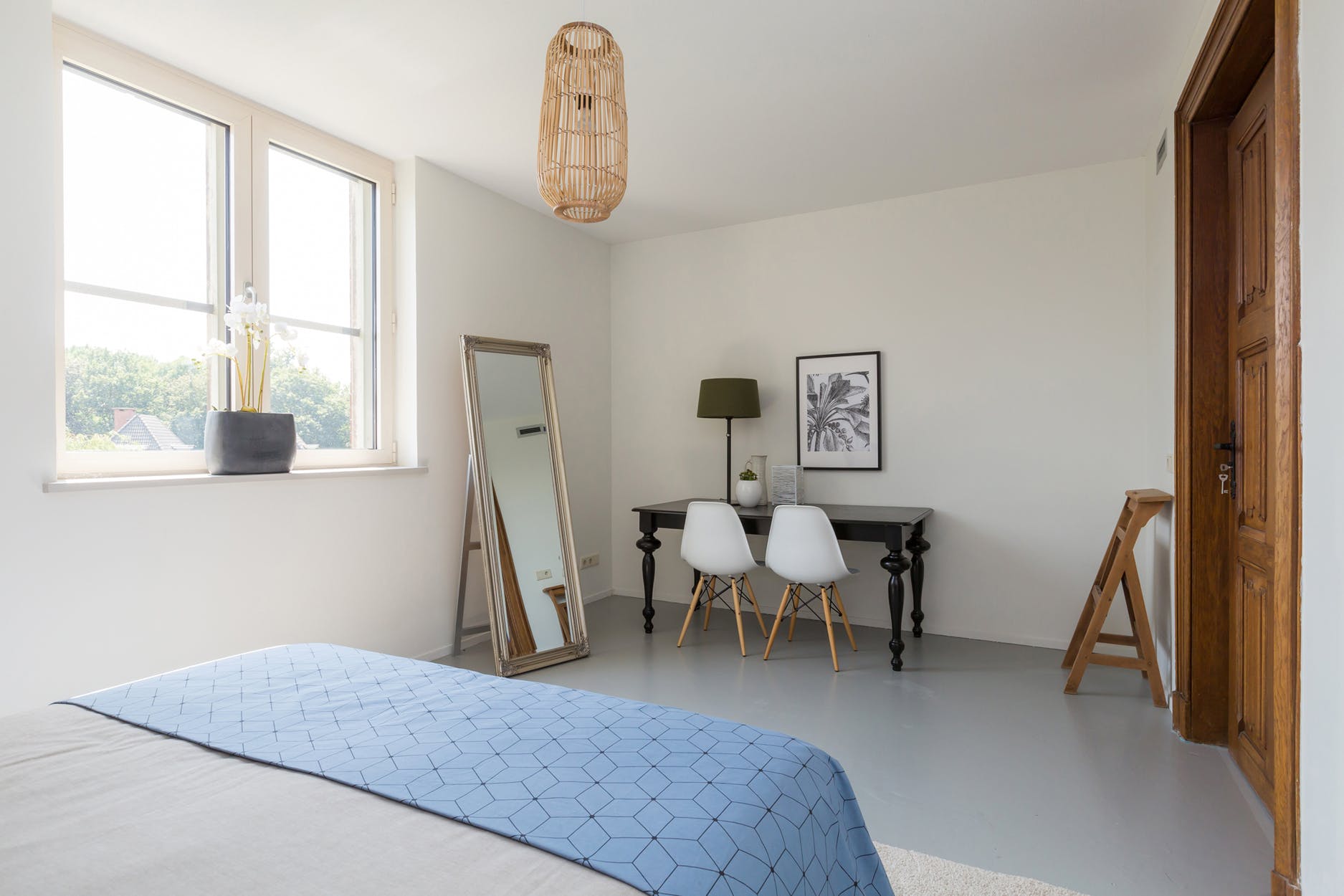 De sfeervolle, ruime en lichte woonkamer heeft een grote inpandige bergkast, 3 grote nissen met raampartijen en een plezierige lichtinval. De kamer is op diverse manieren in te delen. Aan weerszijden heeft u middels de nog originele houten deuren toegang tot twee grote slaap-/werkkamers.