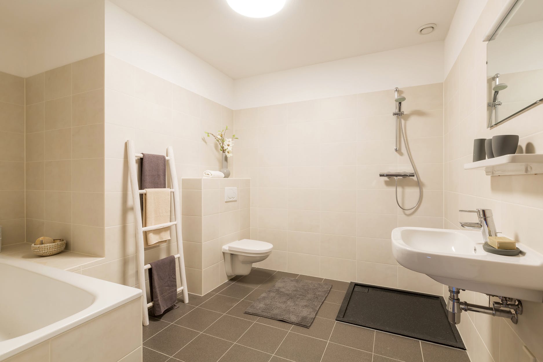 De ruime luxe en moderne badkamer heeft een speelse indeling met ligbad voorzien van thermostaatkraan, inloopdouche met thermostaatkraan, zwevend closet en een wastafel met mengkraan.