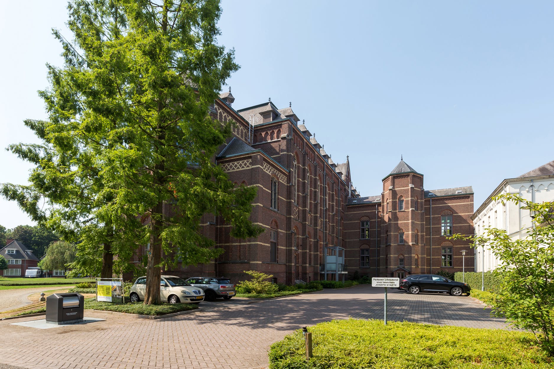 De entree tot het park Bij de ingang van het park is een stijlvolle elektrisch bedienbare toegangspoort met videofoon voor het gehele landgoed. Zo blijft het domein exclusief voor de bewoners en hun gasten. Het park waarin de woningen, appartementen, klooster en Villa Moubis met kapel liggen met zijn vele historische bomen, is eigendom van de bewoners. De Vereniging van Eigenaren voorziet in het onderhoud van het landgoed. Ieder huishouden op Domein Moubis betaalt hiervoor dezelfde maandelijkse parkbijdrage. Het park met het vele groen op Domein Moubis heet van oudsher Waterloopark. Er is een mooie afwisseling tussen dichte bebossing en open groene ruimtes. De landschaparchitect heeft het park in zijn oude glorie hersteld met behoud van de onder Limburgs Landschap authentieke beekrand en historische bomenrand langs de uiterwaarden van de Maas