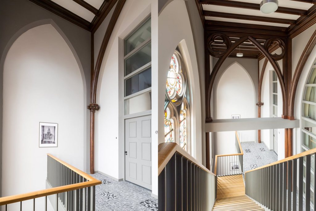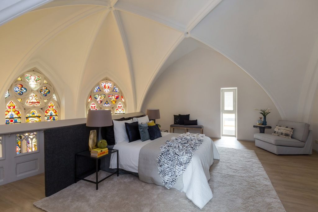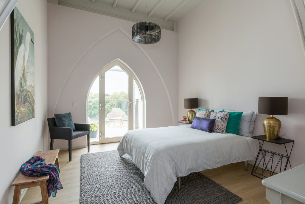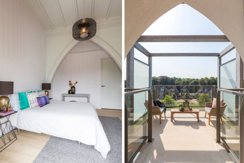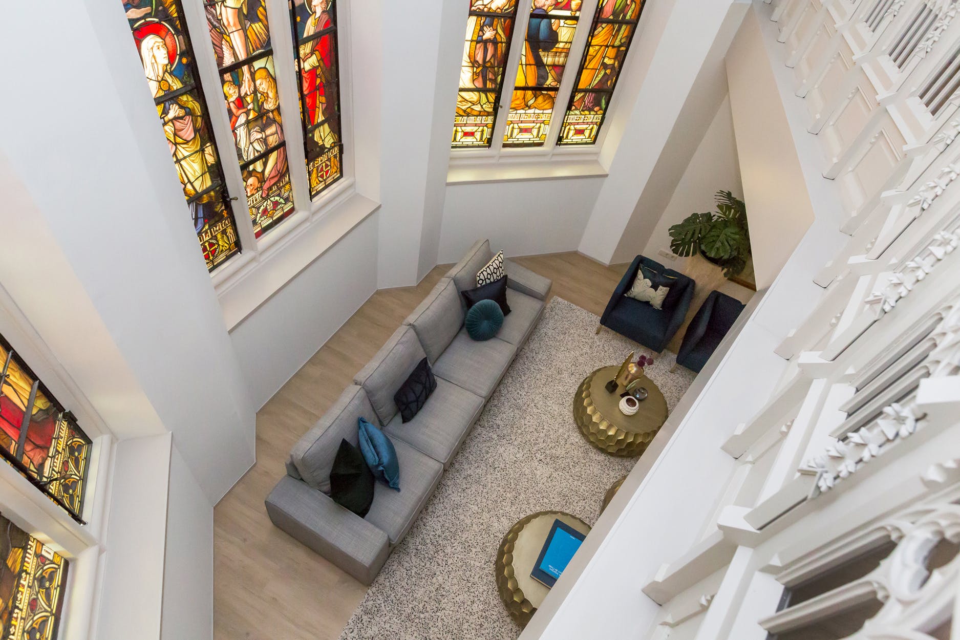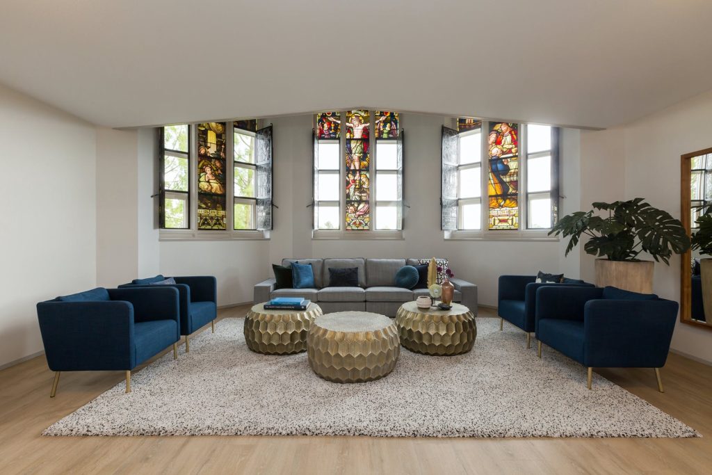 Fantastisch mooie en riante multifunctionele slaap-/werk-/sportkamer (ca. 35 m²), loungeruimte of bibliotheek met balustrade en prachtig zicht op de originele glas in lood ramen/luiken en fraai gestuukte koepel. Er zijn 2 zijramen met uitzicht op de multifunctionele ruimte en eetkamer een etage lager. De mogelijkheid bestaat om de kamer te splitsen, waardoor je een extra kamer creëert.
