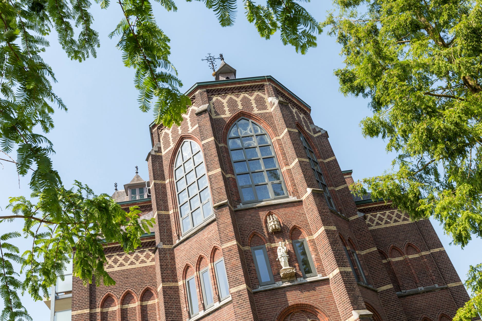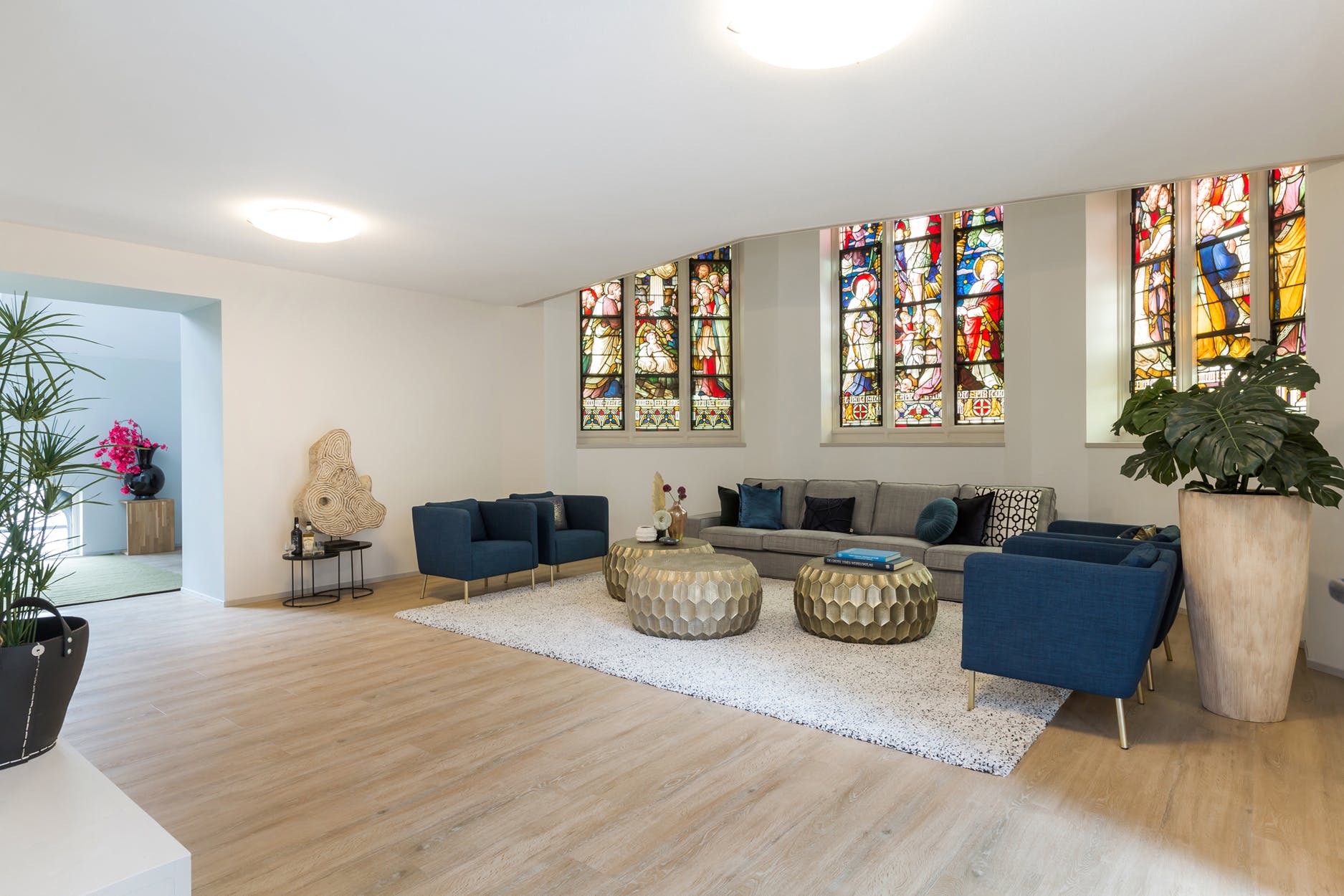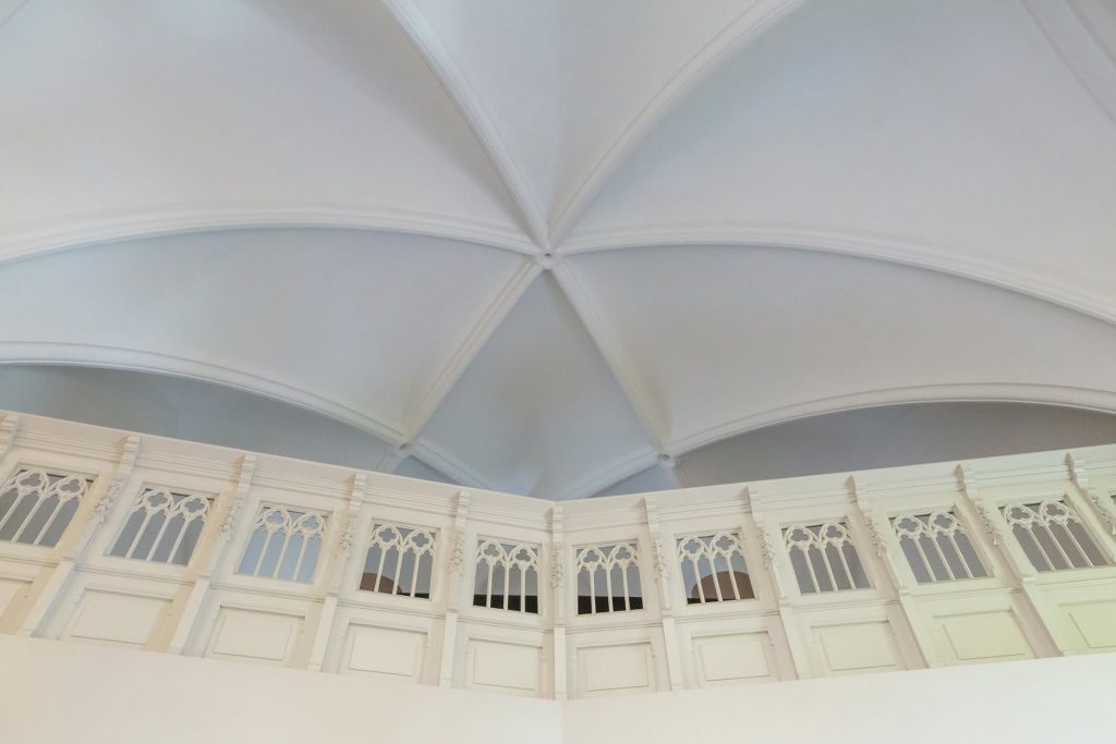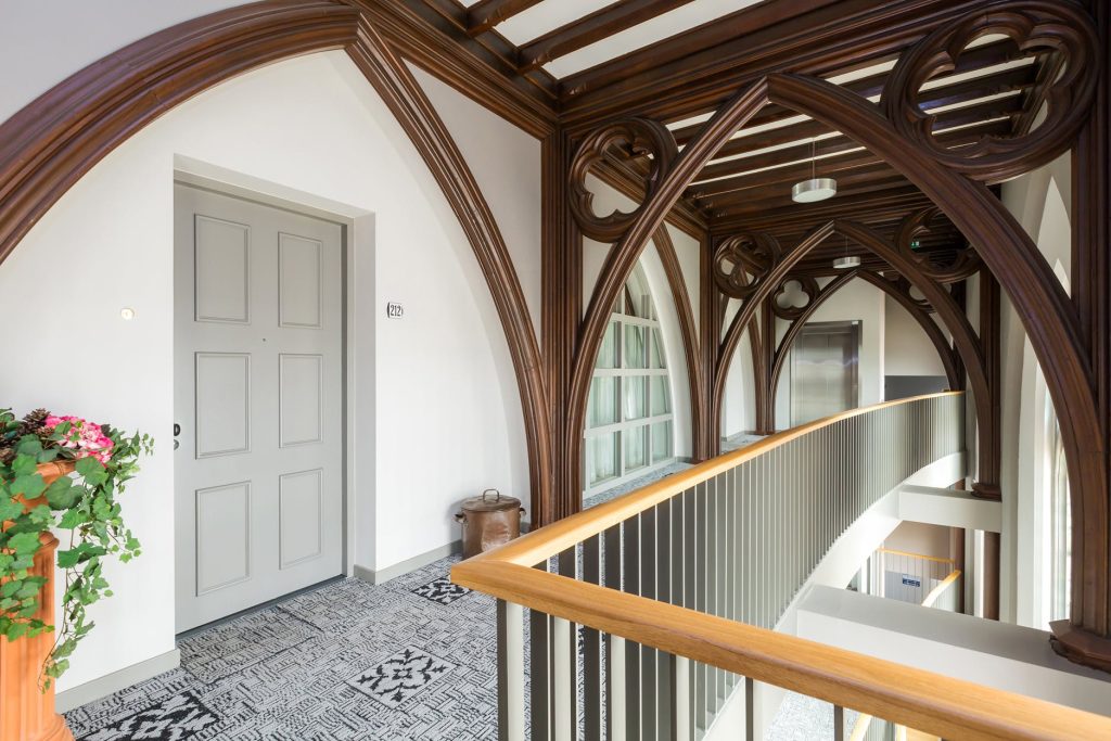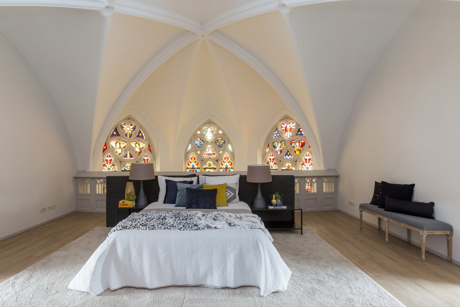 Fantastisch mooie en riante multifunctionele slaap-/werk-/sportkamer (ca. 35 m²), loungeruimte of bibliotheek met balustrade en prachtig zicht op de originele glas in lood ramen/luiken en fraai gestuukte koepel. Er zijn 2 zijramen met uitzicht op de multifunctionele ruimte en eetkamer een etage lager. De mogelijkheid bestaat om de kamer te splitsen, waardoor je een extra kamer creëert.