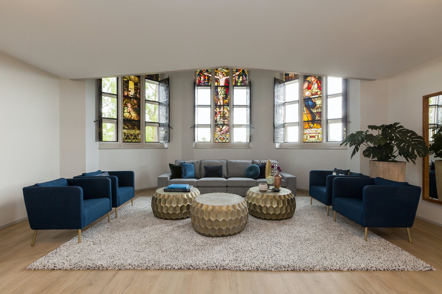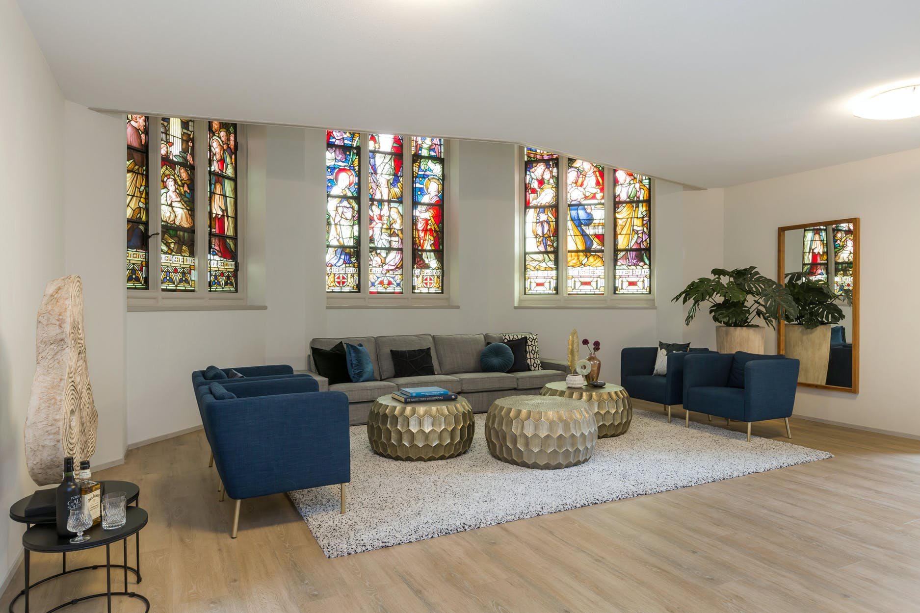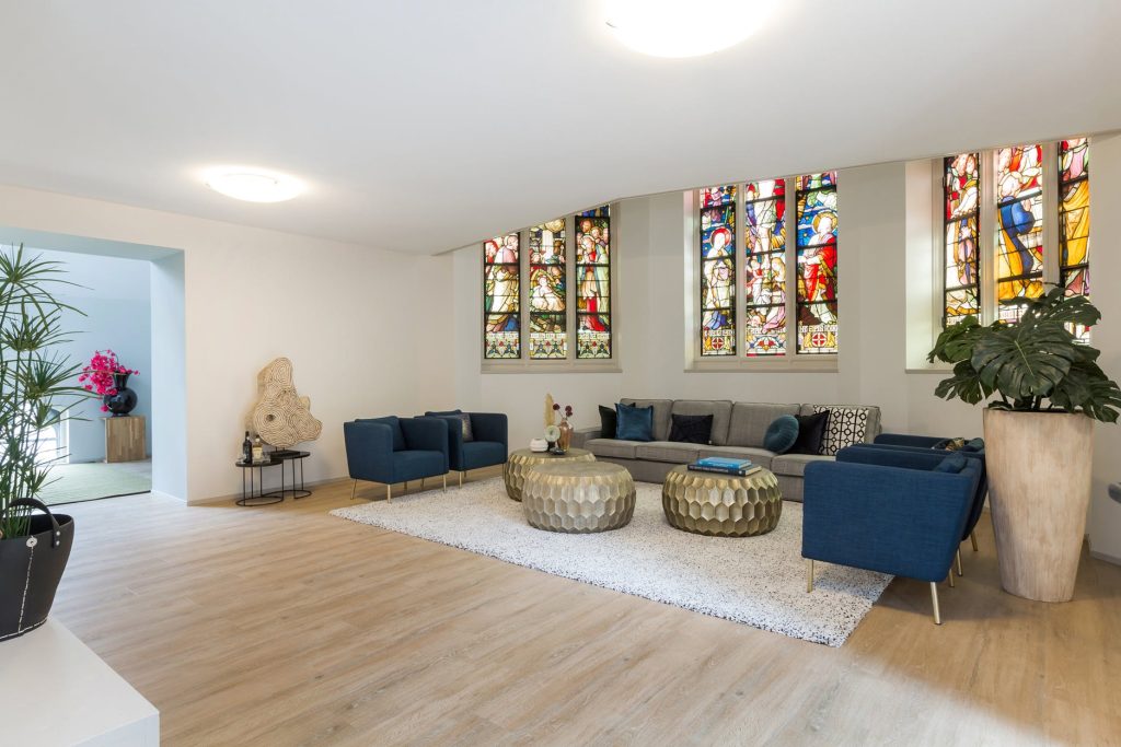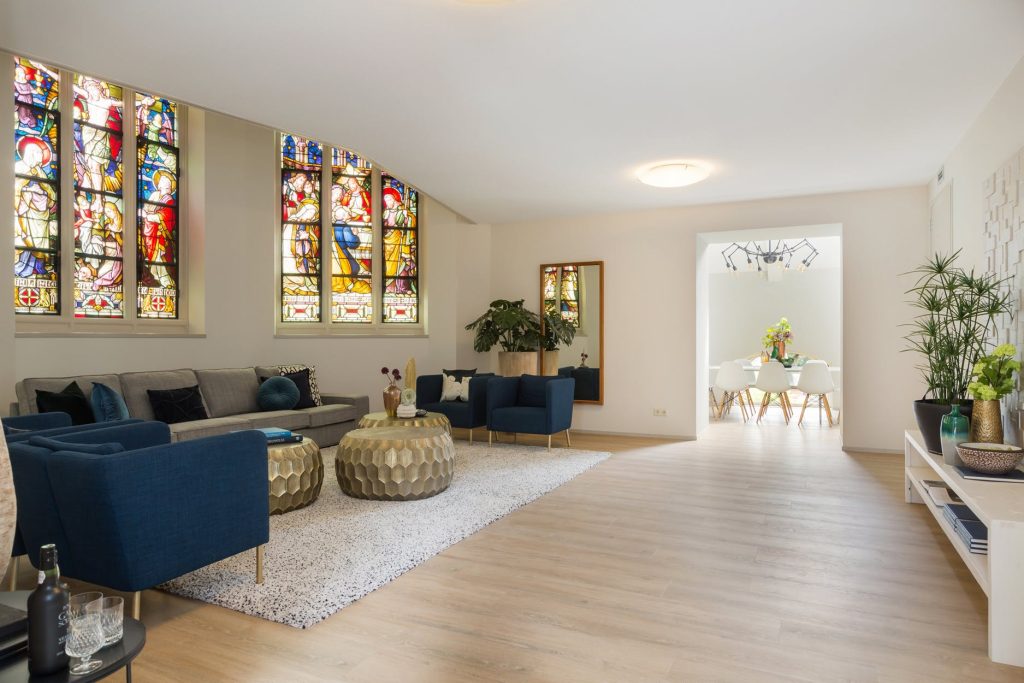 Unieke, ruime en sfeervolle woonkamer van ca. 45 m². De woonkamer heeft een vide en is voorzien van 3 prachtige raampartijen met de originele glas-in-lood ramen met luiken.
