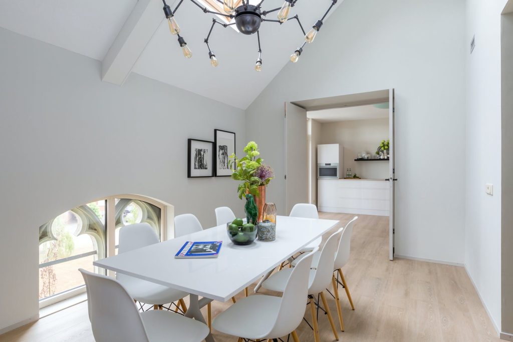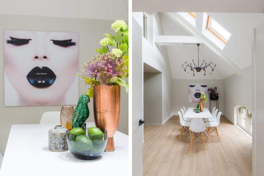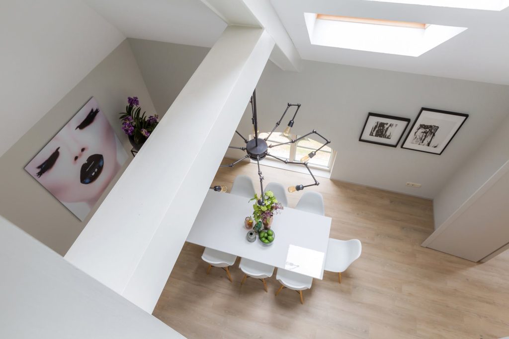 Naast de woonkamer ligt de eetkamer met een fraaie raampartij en 2 Velux-dakramen. De kamer geeft een ruimtelijk gevoel door het hoge plafond en de via openslaande deuren bereikbare woon-eetkeuken.