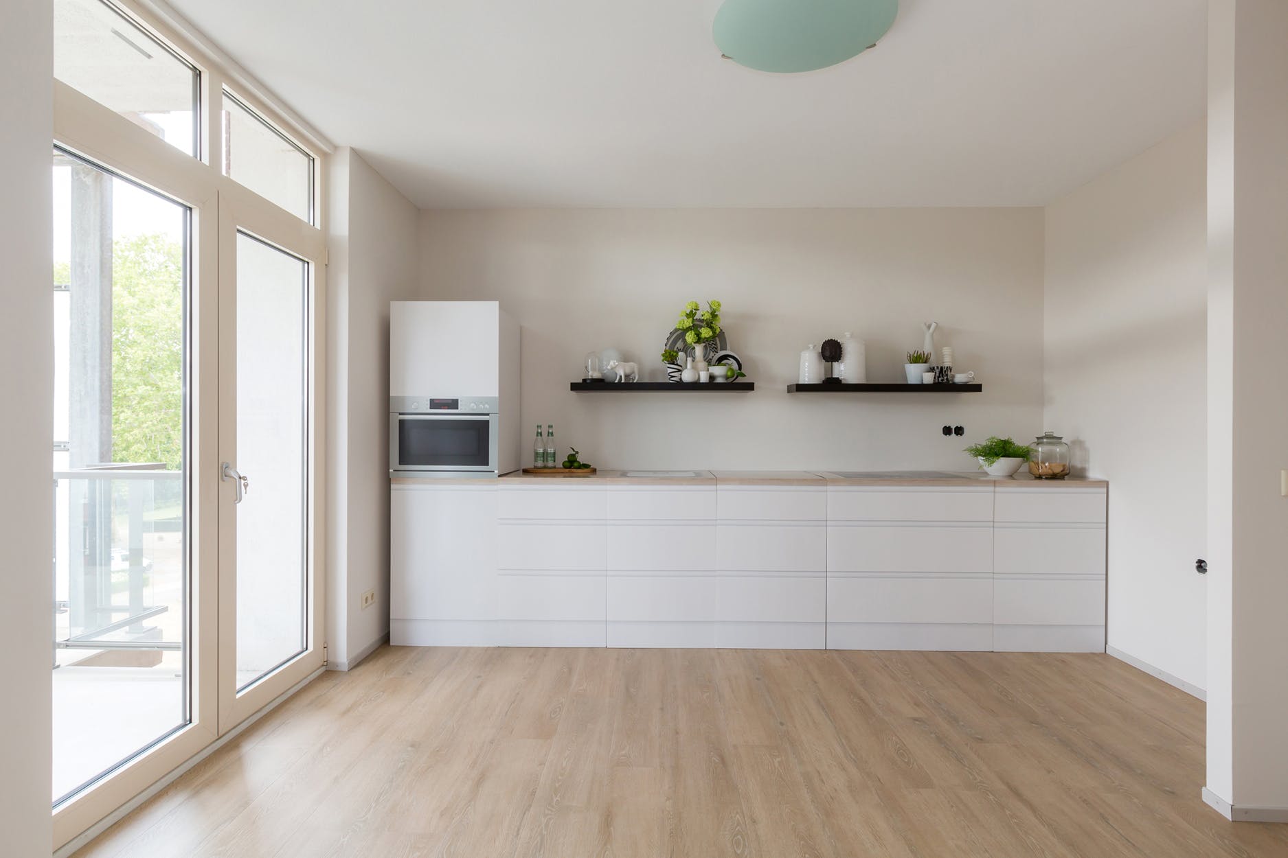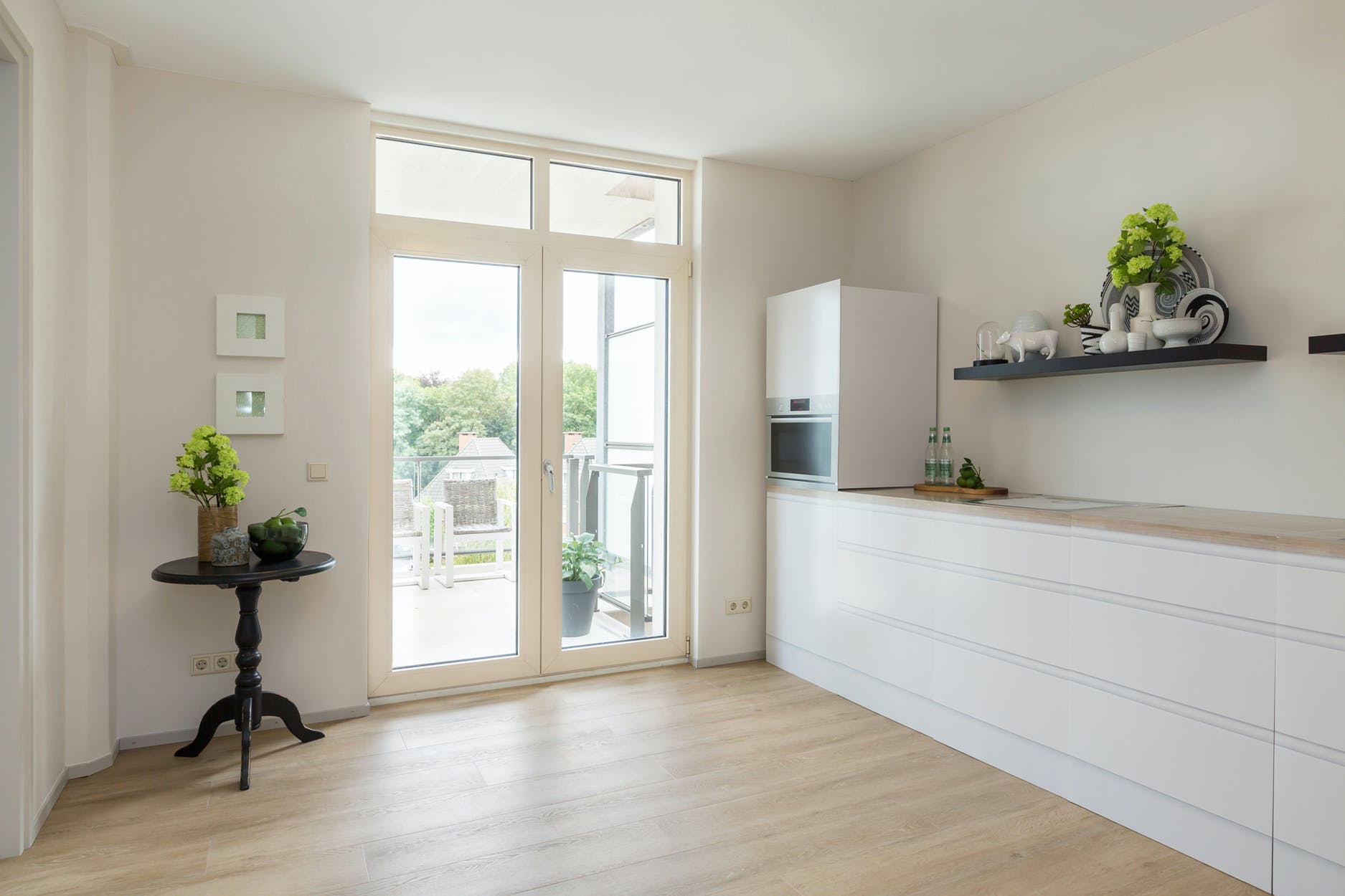 De keuken is gelegen aan de achterzijde en naar eigen wens en smaak in te delen. Via openslaande deuren is het overdekte balkon te bereiken.