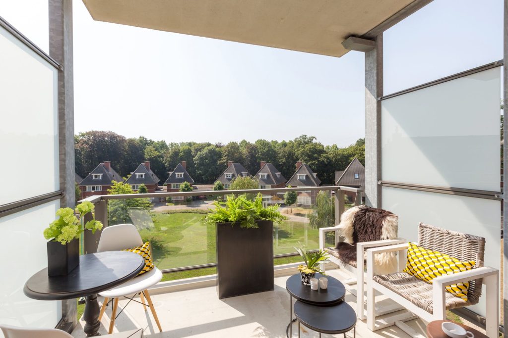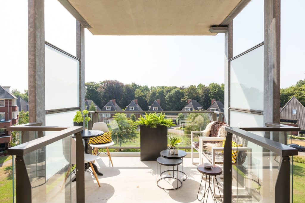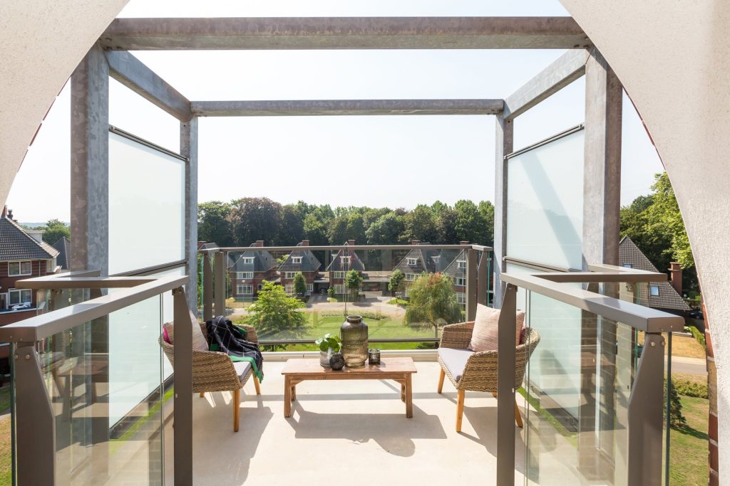 Het overdekte balkon is gelegen op het zuidoosten en heeft een prachtig uitzicht over het landgoed met parkachtige tuin.