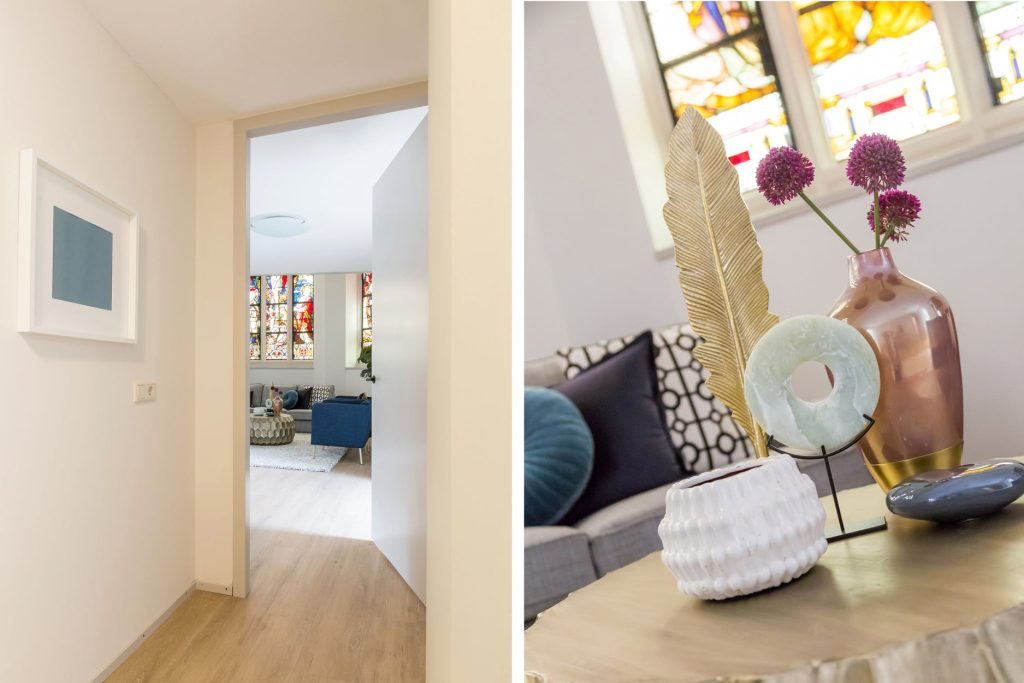 Via een prachtige overloop met vloerbedekking, de oorspronkelijke glas-in-lood-ramen en fraai, bewerkte houten pilaren bereikt u de entree van het appartement. De ruime hal is voorzien van een meterkast, videofooninstallatie, garderobenis, toiletruimte, trapkast, berging met vloerverarmingsunit en trapopgang naar volgende verdieping.
